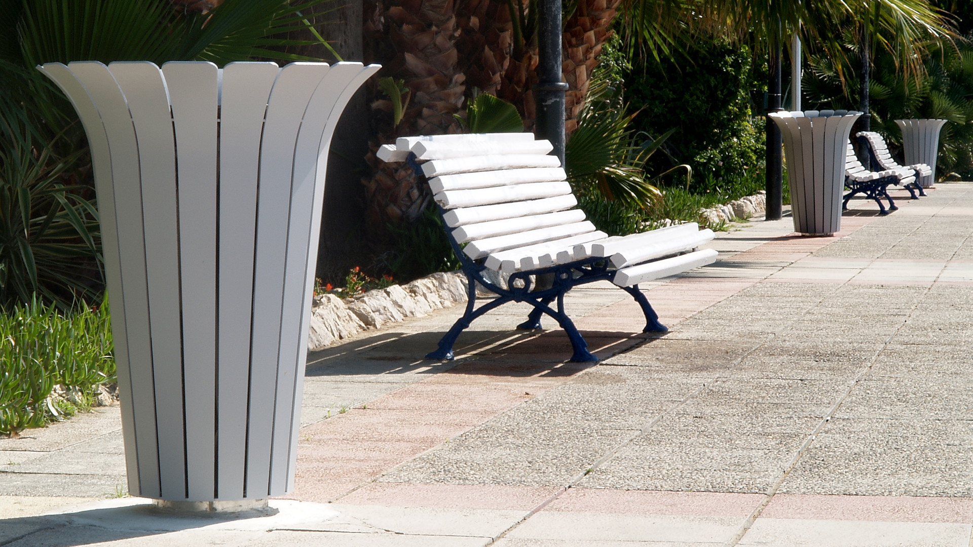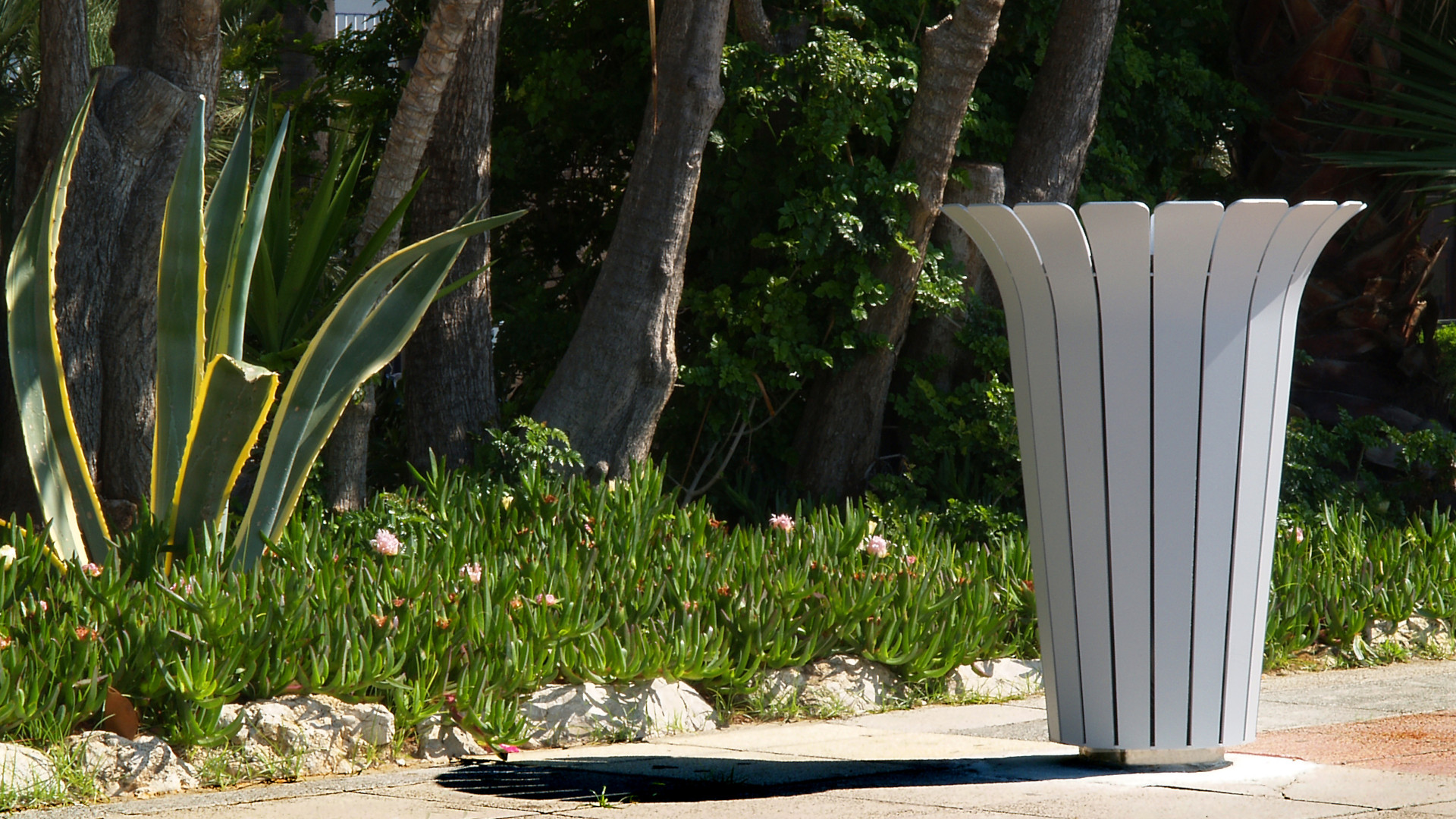 Collection of flower-shaped bins, made of “petals” in painted steel, Corten, or shaped stainless steel, with a circular base in stainless steel and a sack ring made of drawn steel. Available in two sizes.