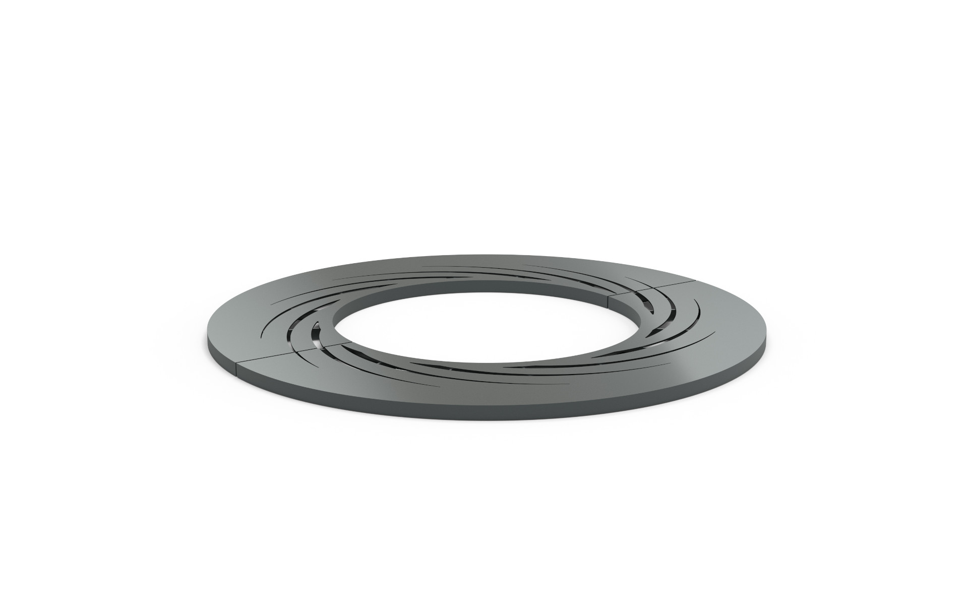 Round tree grate with a circular hole, made of laser-cut steel. It consists of two halves designed for fastening together with screws and is reinforced with steel plates, placed internally and around the perimeter. Available in various sizes and/or hole diameters. Can be equipped with a counterframe.