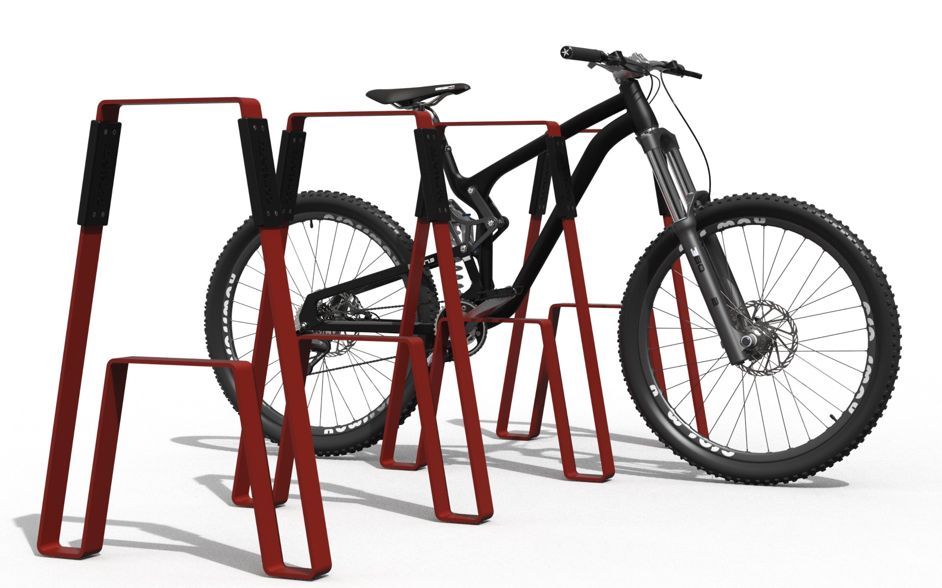 Bicycle rack made of steel flat bar with a polygonal shape and rounded edges, designed to integrate seamlessly into public spaces. Equipped with PVC inserts to protect the bicycle frame, combining functionality with attention to detail.