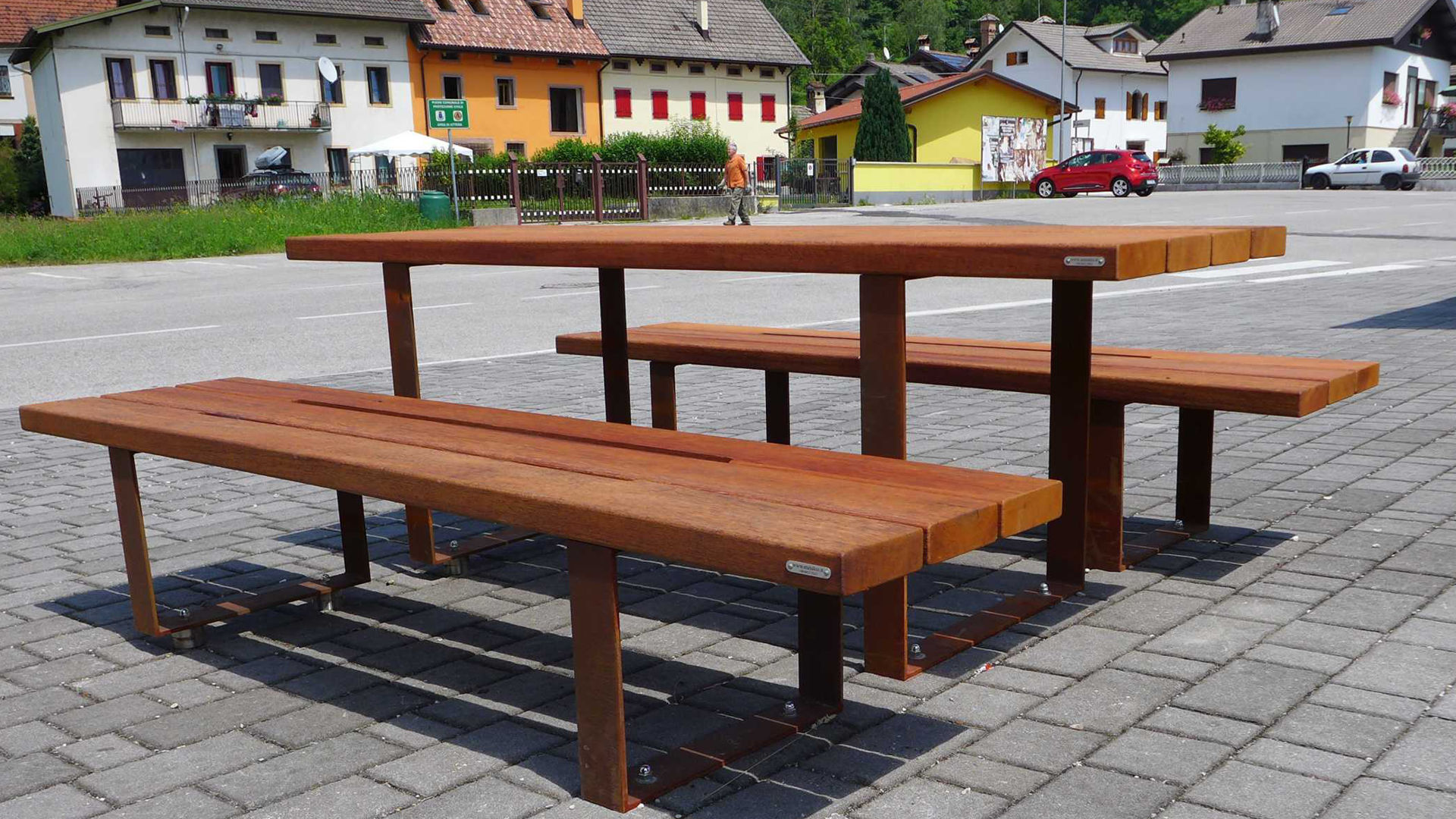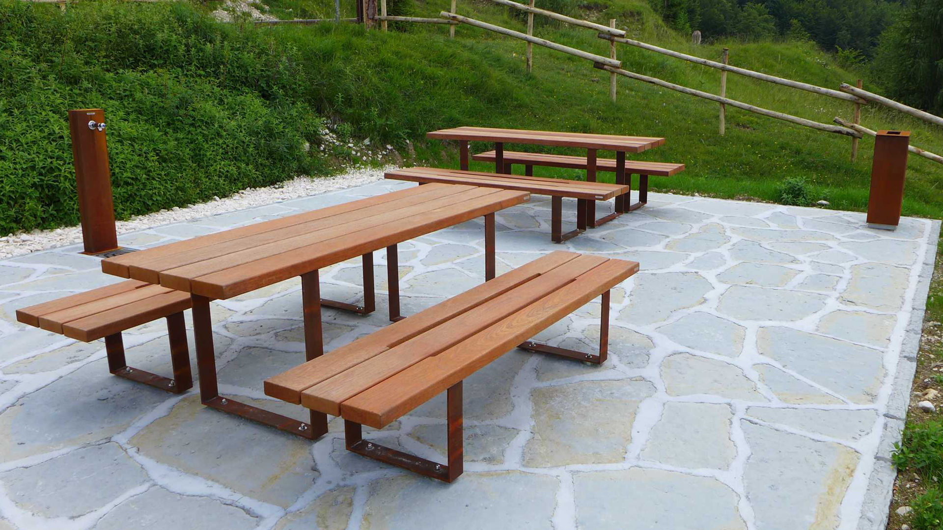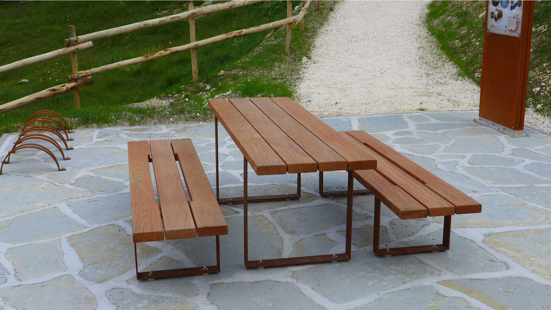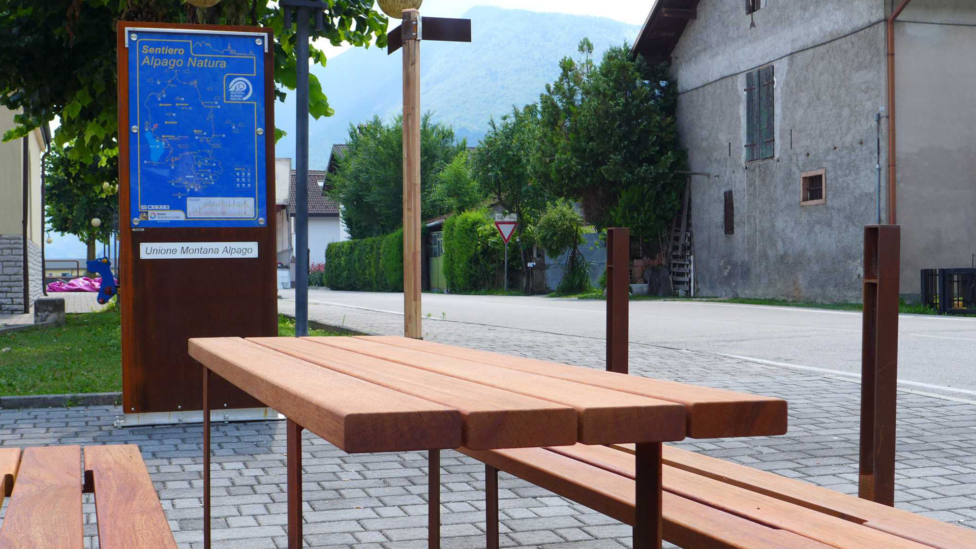 Along the Alpago Nature Trail, several rest areas have been created with seats and tables from the Pic Bull collection. These relaxation areas are then equipped with vertical displays displaying the trail map, bins, bike racks, and drinking fountains.