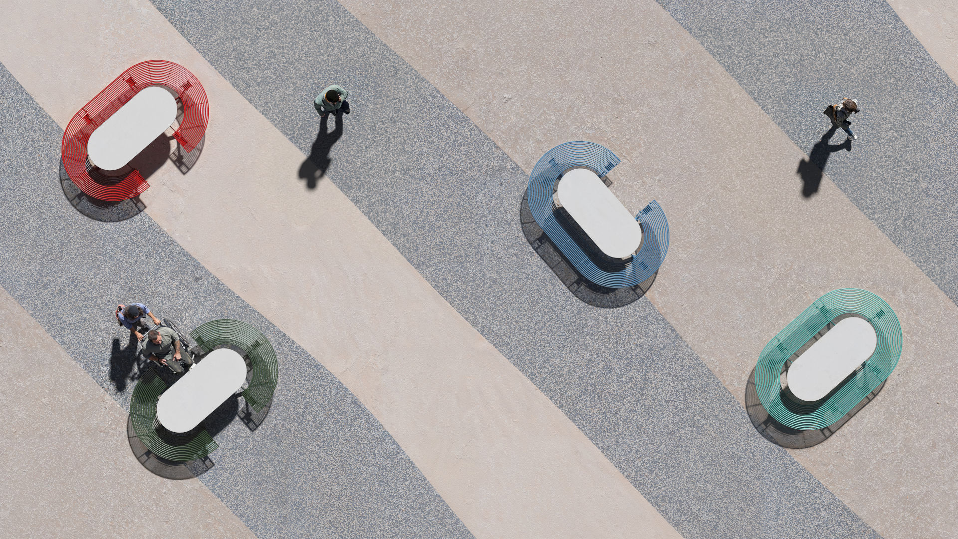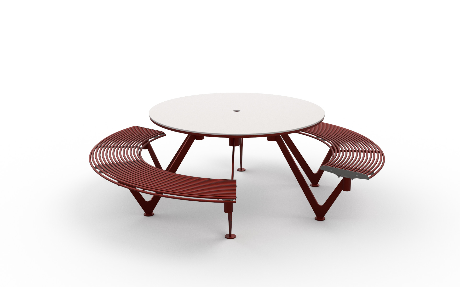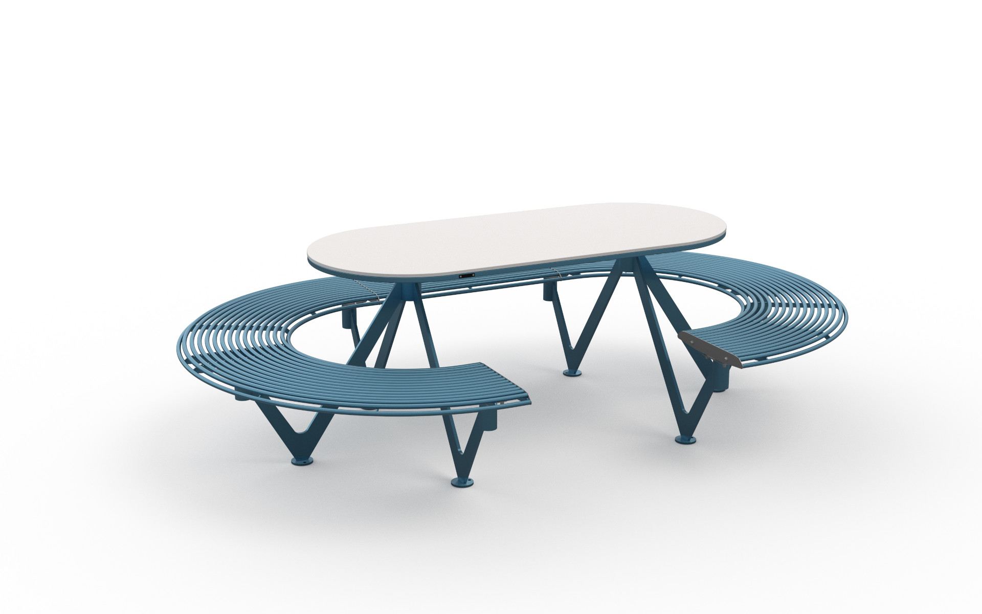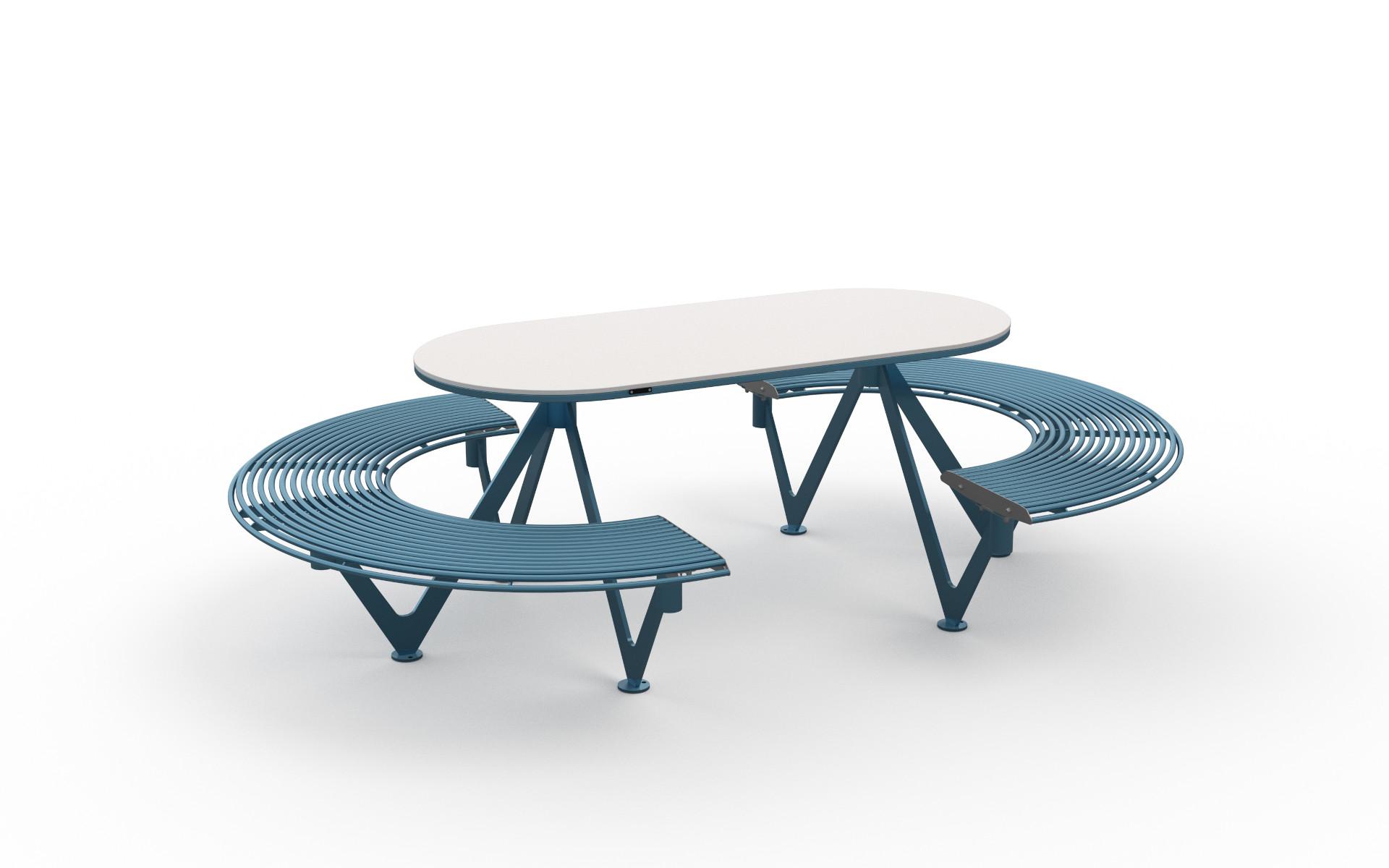 Tavolo ovale con seduta integrata, composto da una struttura portante in lamiera di acciaio con appositi collegamenti fissati a un telaio in tubolare d’acciaio. La seduta è realizzata con tubi curvati, mentre il piano del tavolo è formato da un telaio in tubolare e lamiera di acciaio che supporta una lastra in pietra sinterizzata. Disponibile anche nella versione con seduta parziale per consentire l’accesso a persone su sedia a rotelle.