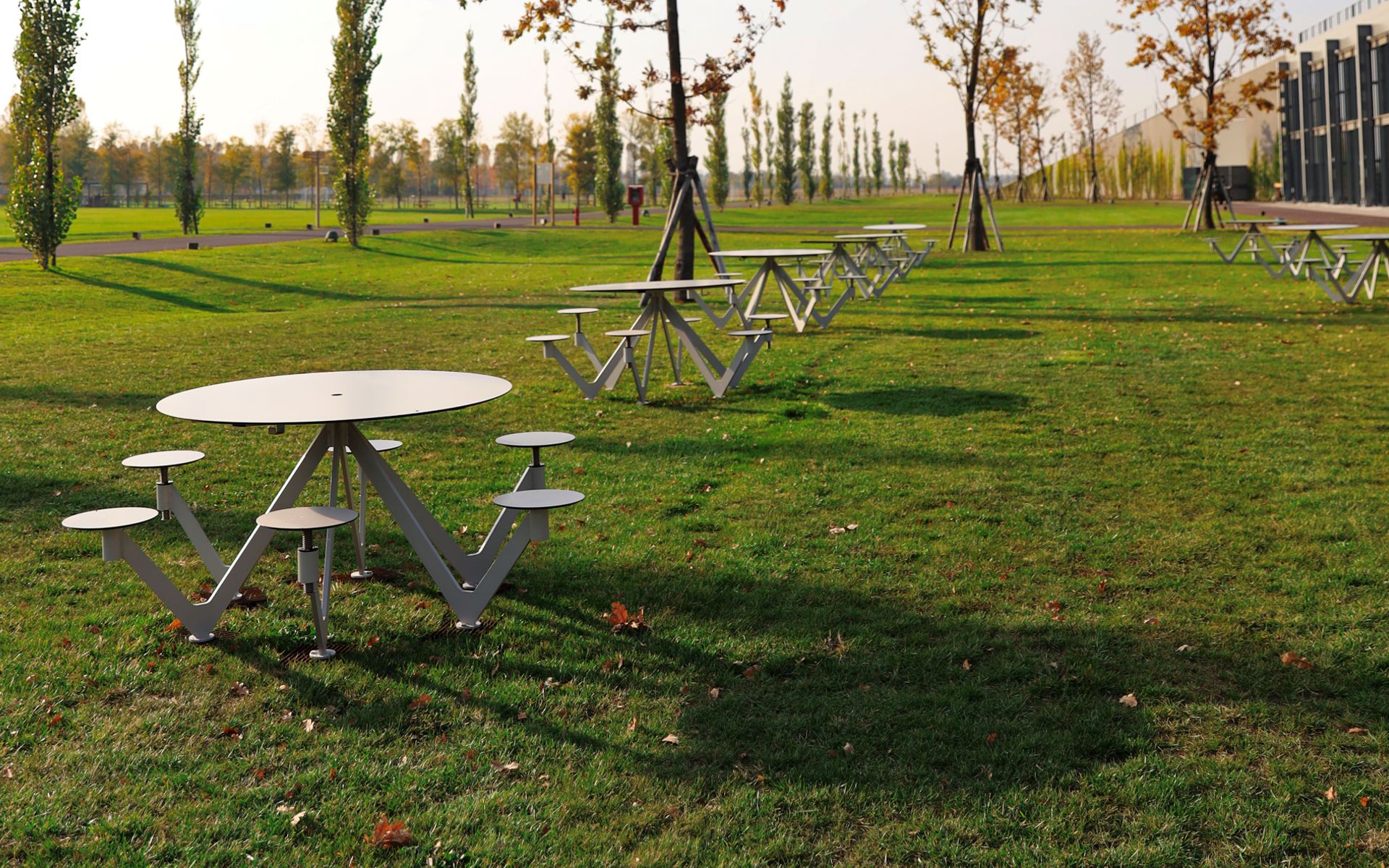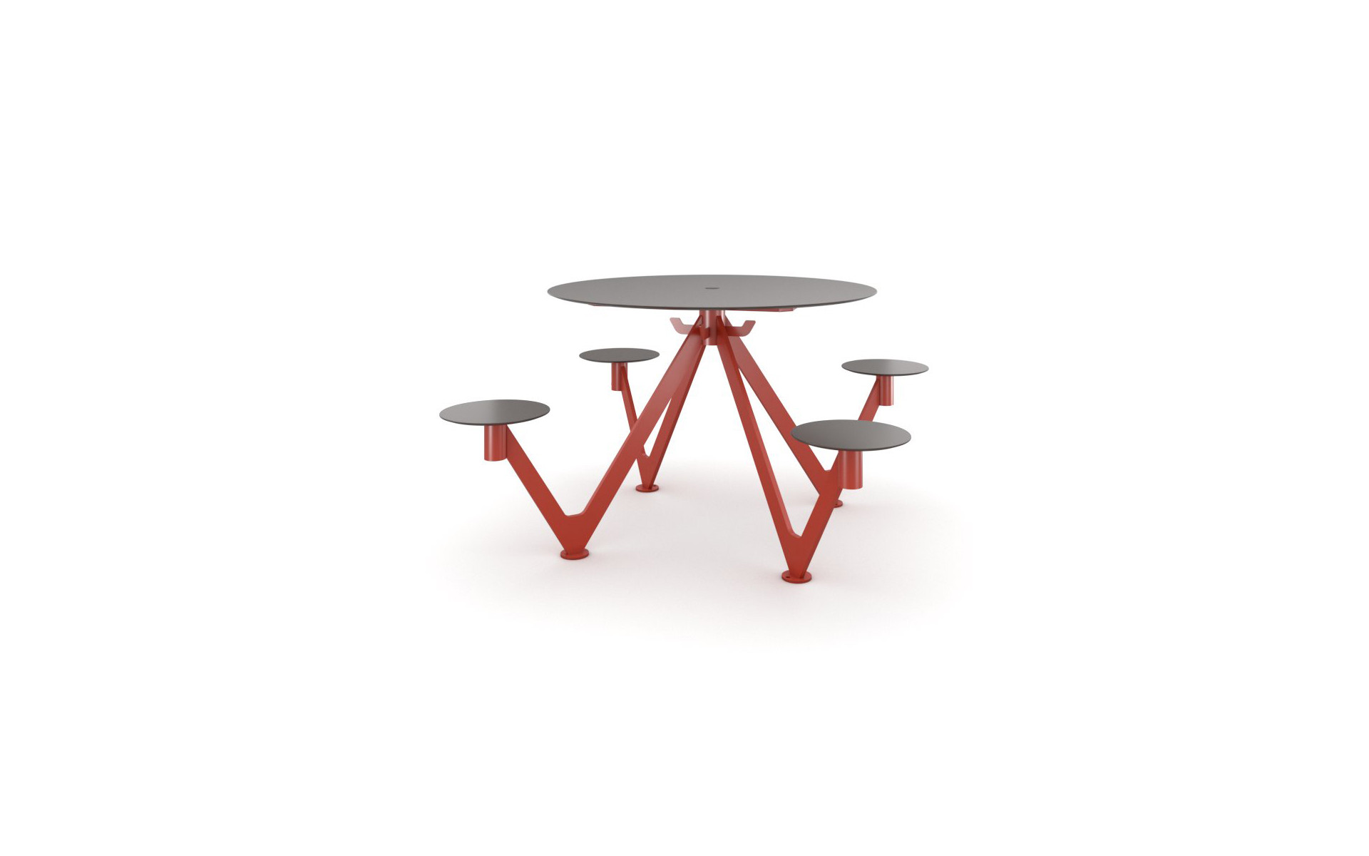 Questa collezione di tavoli rotondi con sgabelli integrati reinterpreta il classico arredo da esterno in chiave contemporanea e funzionale. Realizzati in HPL, materiale resistente e adatto all’uso intensivo, i tavoli poggiano su una solida struttura in lamiera d’acciaio di grosso spessore, progettata per garantire stabilità e durata nel tempo. Gli innesti in tubo accolgono i sedili e il piano tavolo, creando un sistema compatto e armonioso. Disponibili in due configurazioni – a quattro posti con due sgabelli regolabili in altezza e a sei posti con tre sgabelli – questi tavoli sono pensati per favorire la convivialità in spazi pubblici, scolastici o aziendali.