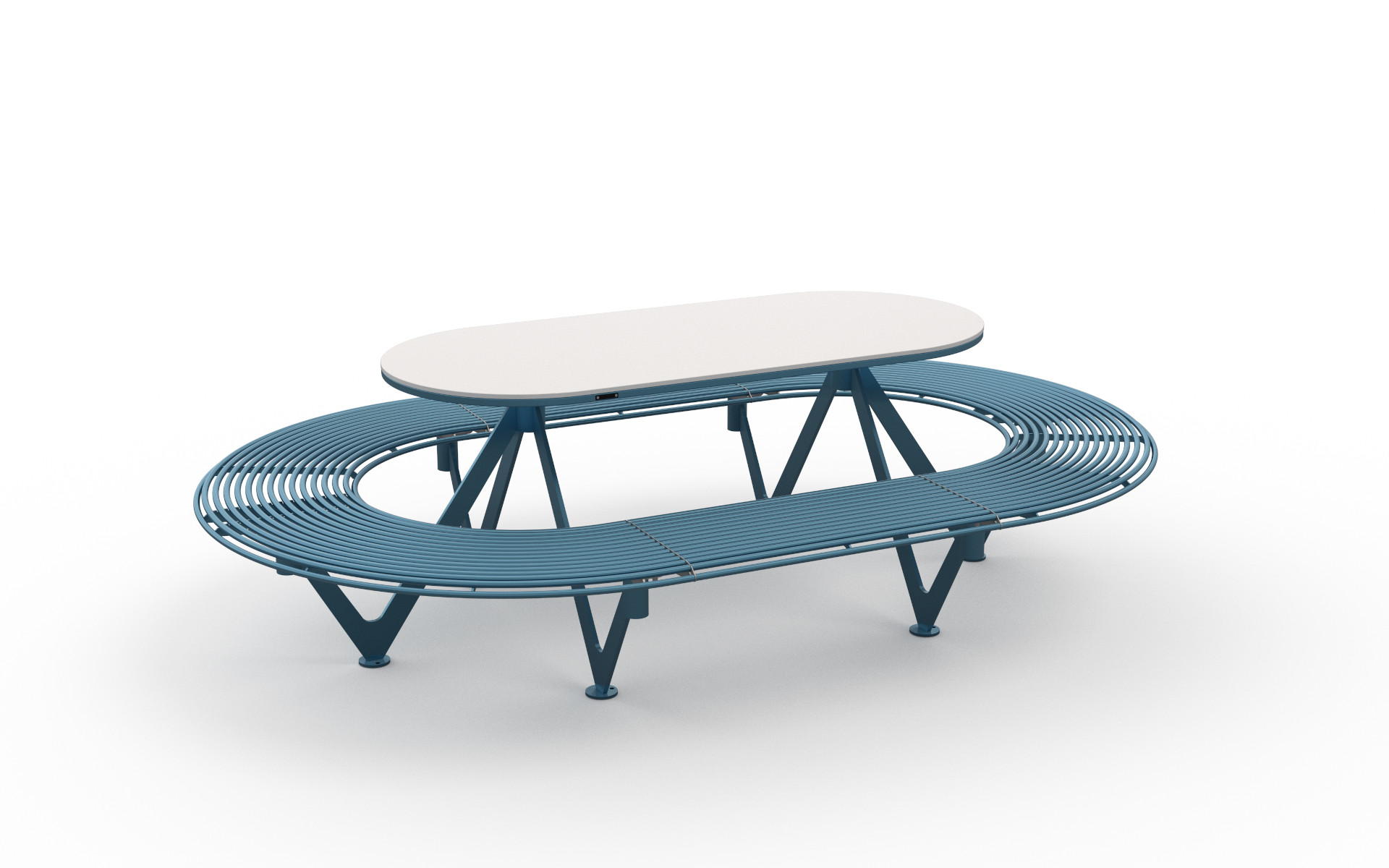 Tavolo ovale con seduta integrata, composto da una struttura portante in lamiera di acciaio con appositi collegamenti fissati a un telaio in tubolare d’acciaio. La seduta è realizzata con tubi curvati, mentre il piano del tavolo è formato da un telaio in tubolare e lamiera di acciaio che supporta una lastra in pietra sinterizzata. Disponibile anche nella versione con seduta parziale per consentire l’accesso a persone su sedia a rotelle.