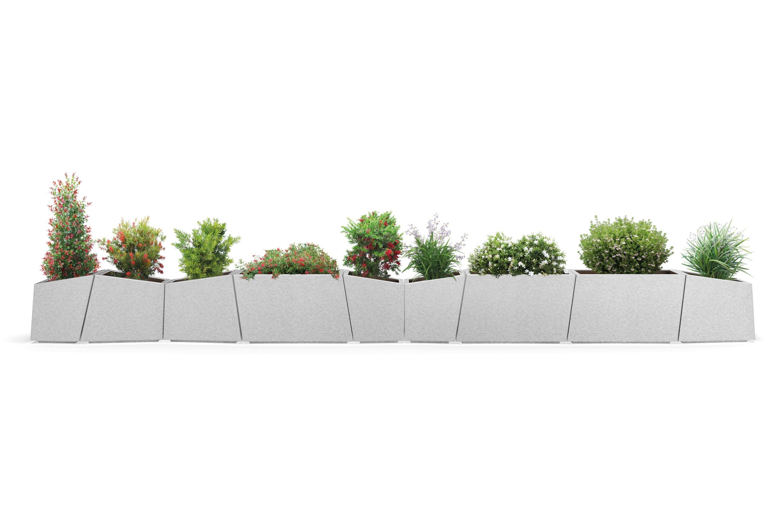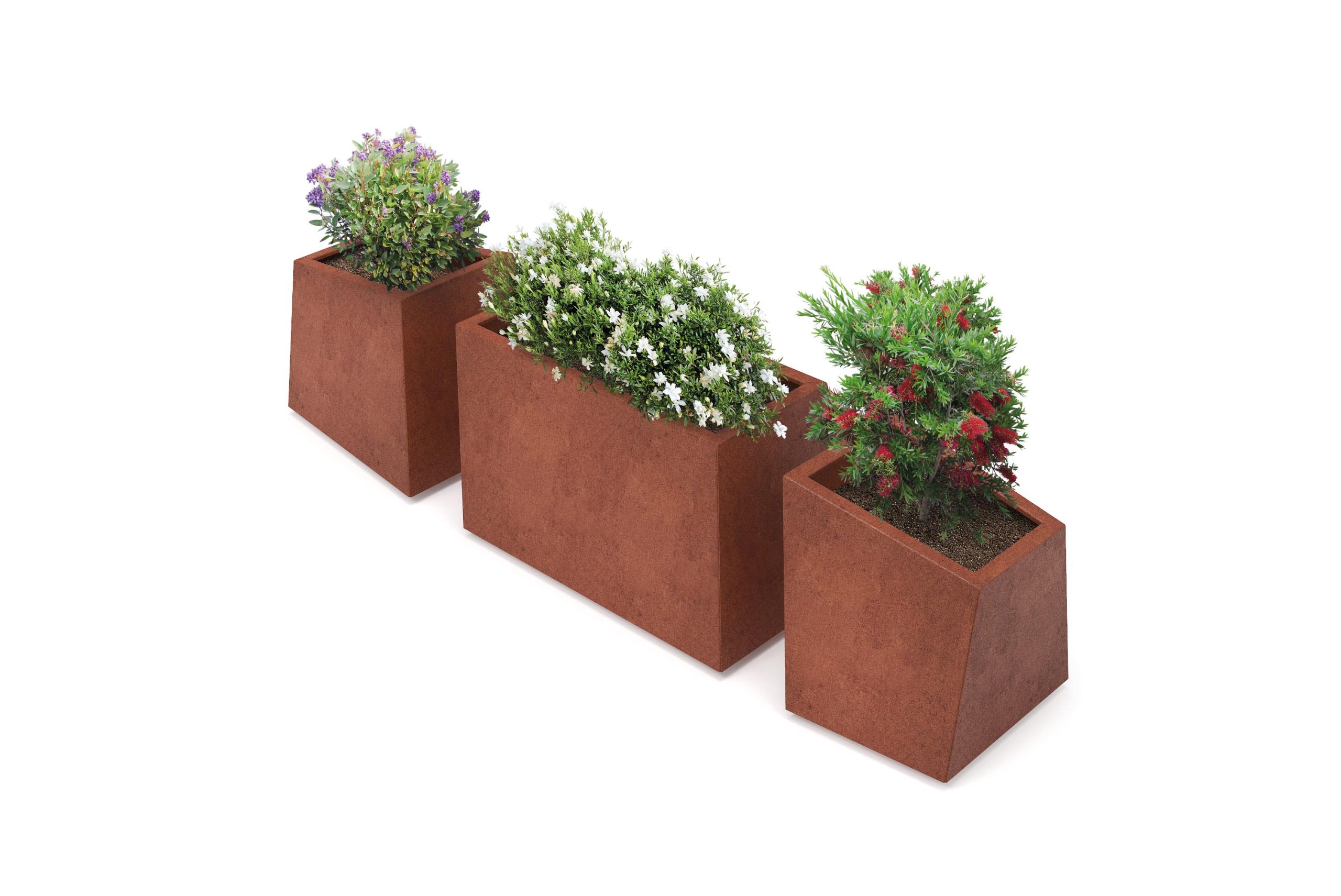 Collezione di fioriere di forma irregolare realizzate in lamiera d’acciaio verniciato, corten o inox e dotate di