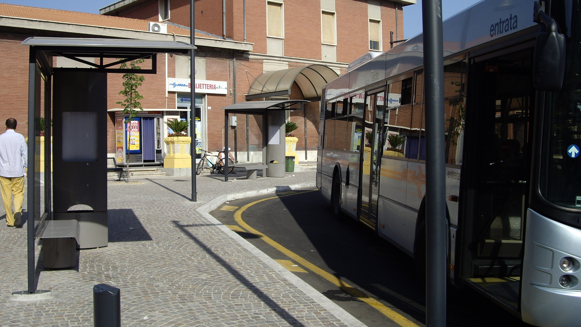 Pensilina costituita da una struttura portante in tubolare d’acciaio, da una parete di fondo composta da un telaio in profili d’acciaio con due lastre di vetro temperato e da una copertura in lamiera d’acciaio sagomata, con bordo in estruso di alluminio verniciato. La struttura portante è rivestita, su un lato, da lamiere curve che creano un profilo ellittico, dotato, nella parte inferiore, di un cestino con anello reggisacco e anta con serratura, nella parte superiore può ospitare un pannello per l’affissione di pubblicità. Sul lato opposto è integrata una bacheca in alluminio con serratura a scatto. Le lastre in vetro possono essere dotate di fori per l’installazione di un’ulteriore bacheca espositiva in alluminio con chiusura a scatto. La pensilina può essere completata con una panchina senza schienale in acciaio, con seduta decorata con fori.