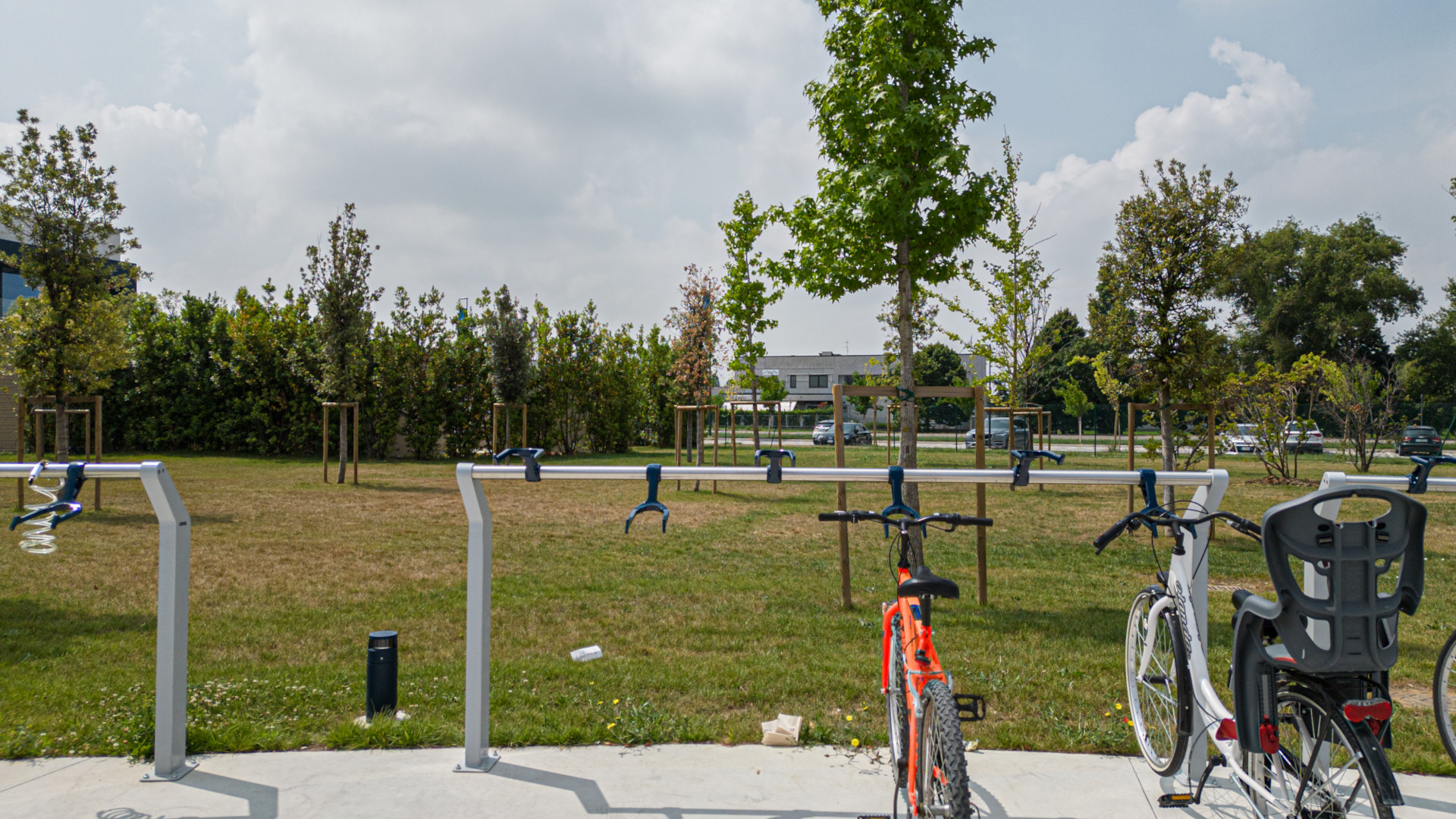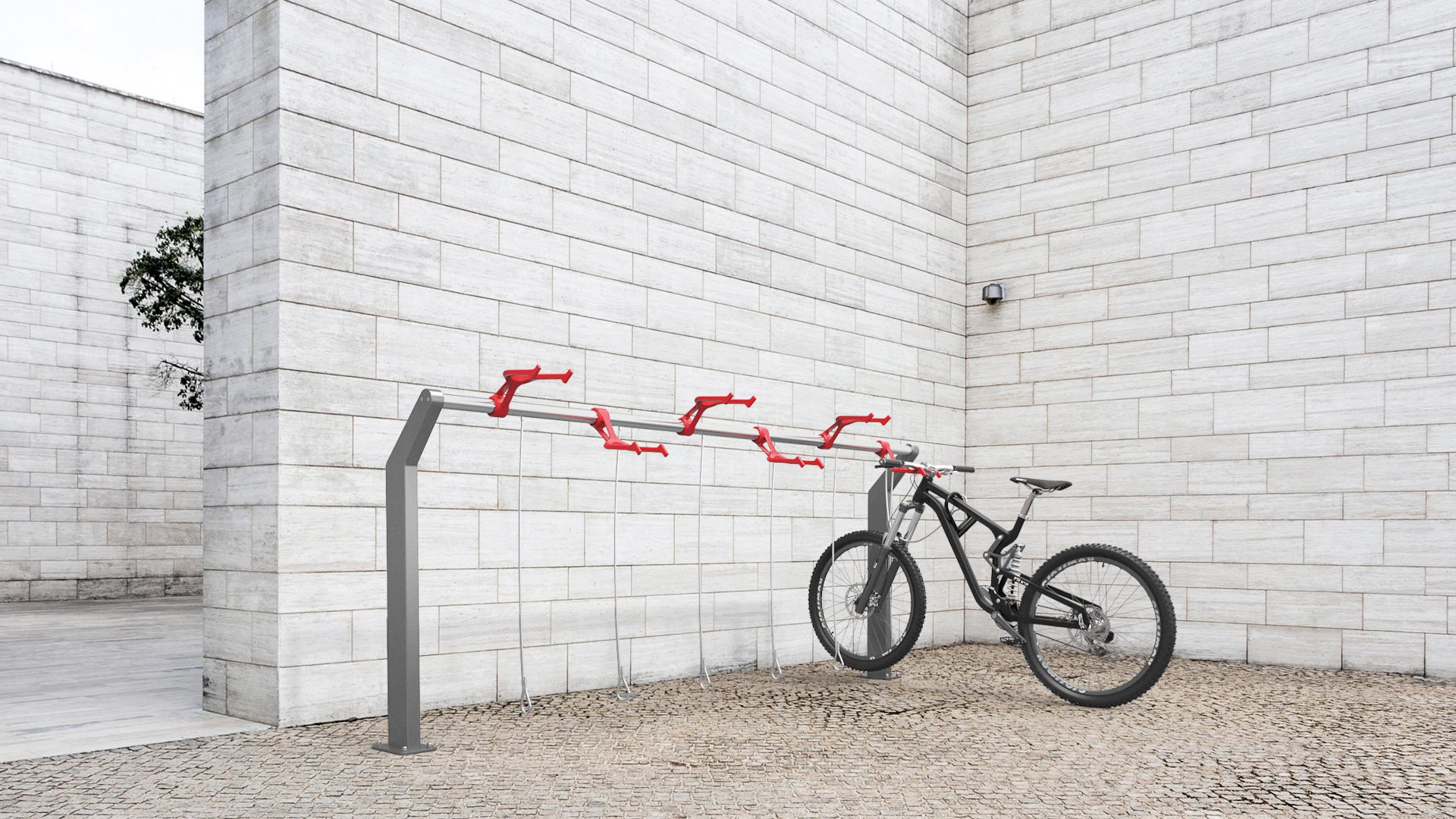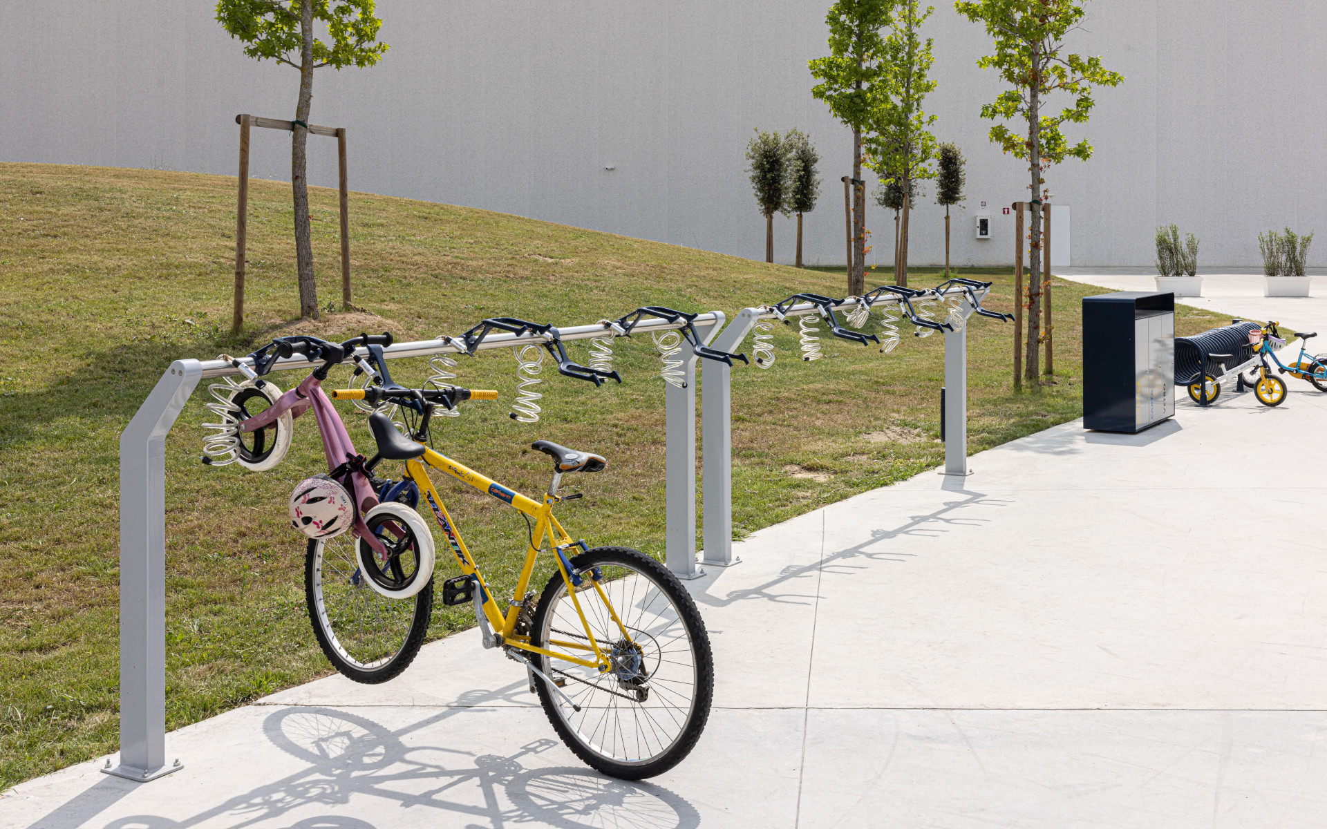 Il portabiciclette modulare è una soluzione elegante e funzionale per la mobilità urbana. Realizzato con una solida struttura in acciaio e una barra orizzontale in alluminio, è dotato di supporti per manubrio disposti su due altezze differenti, per accogliere biciclette di vario tipo e dimensione. Ogni stallo è equipaggiato con un cavo in acciaio rivestito in PVC, che consente di fissare in modo sicuro il telaio, offrendo praticità e sicurezza sia negli spazi pubblici che privati.