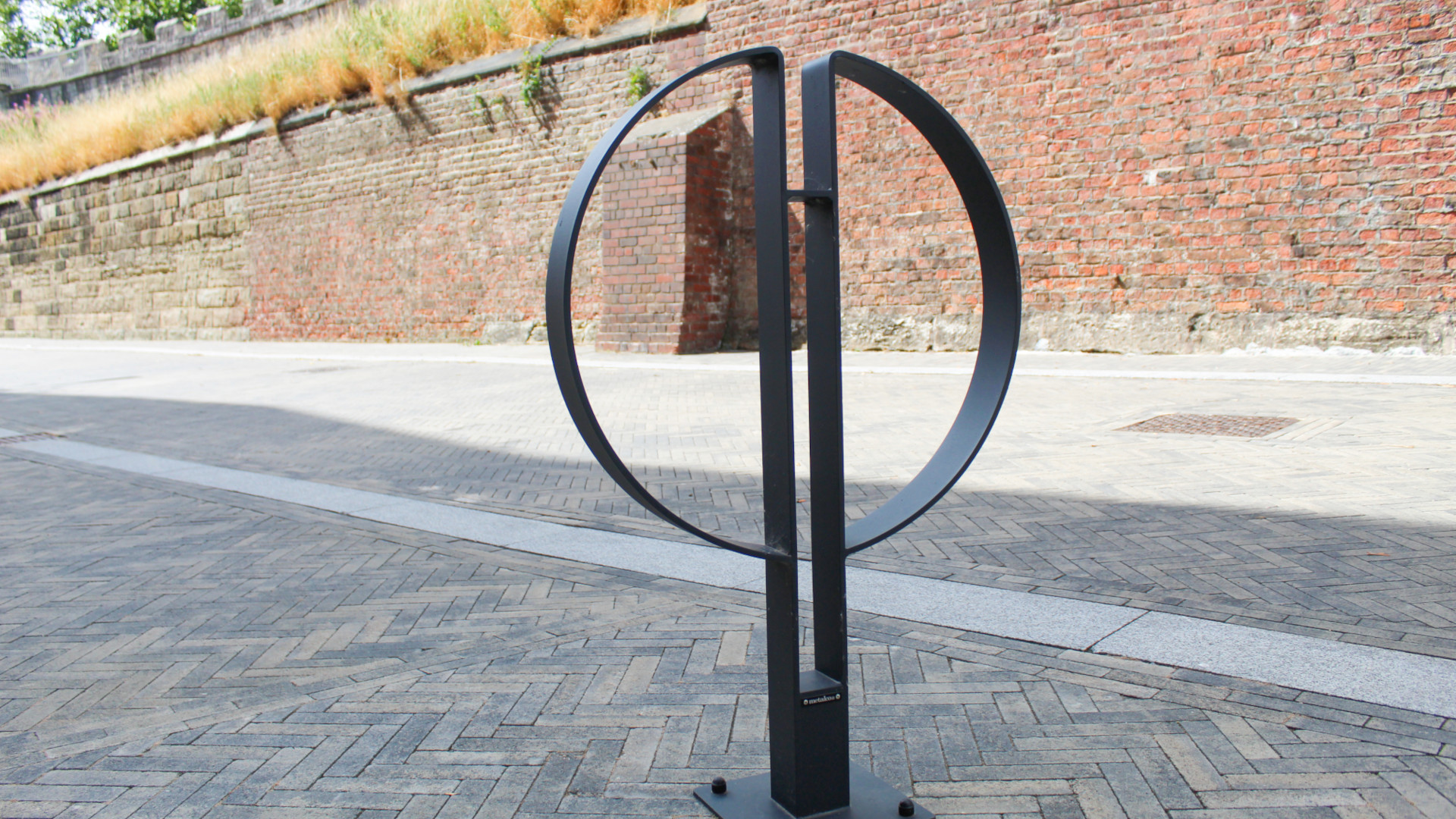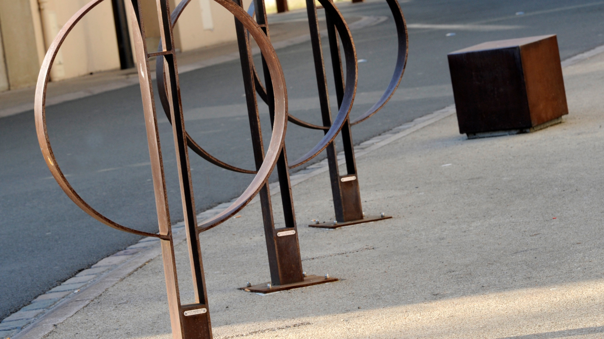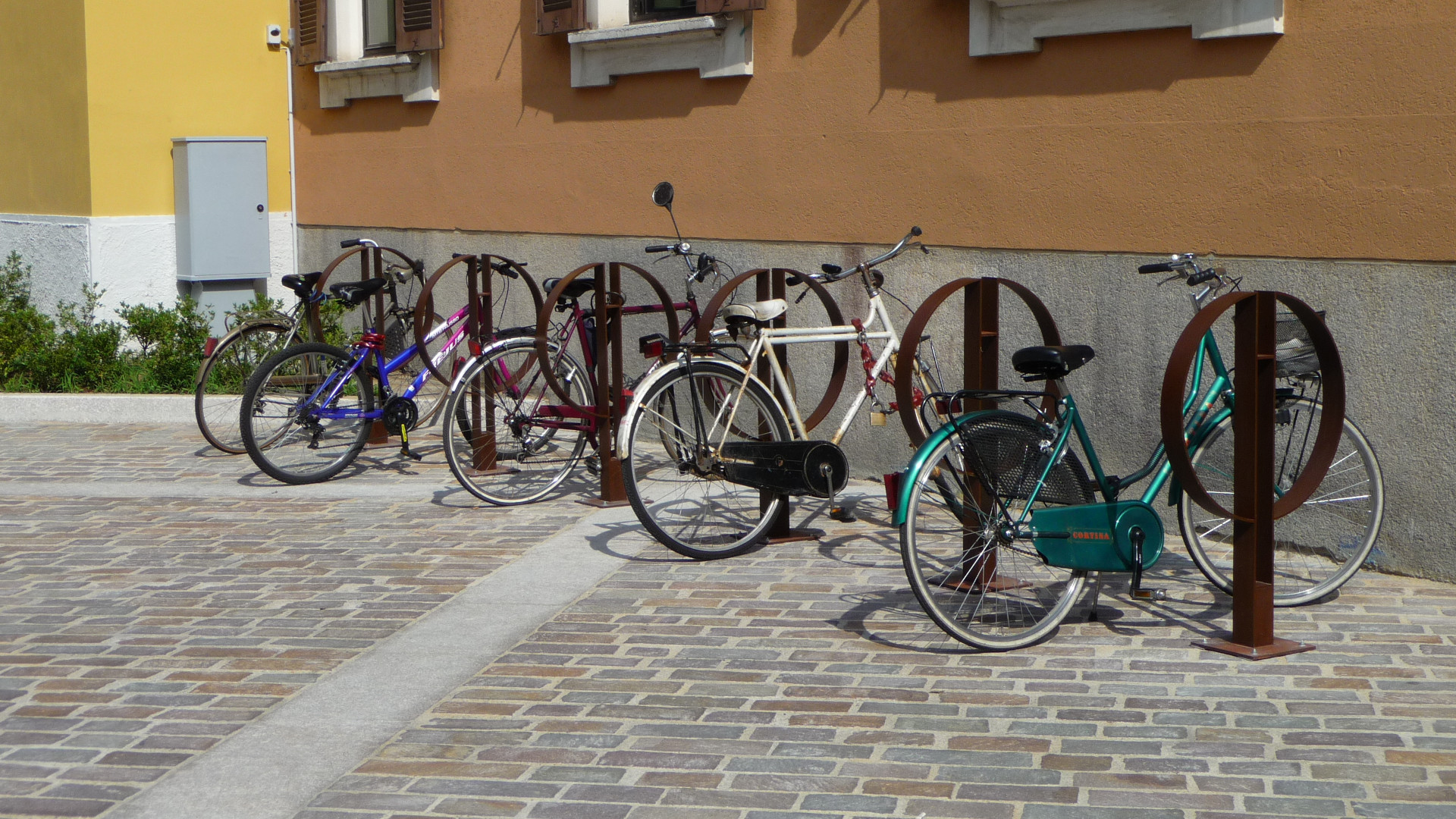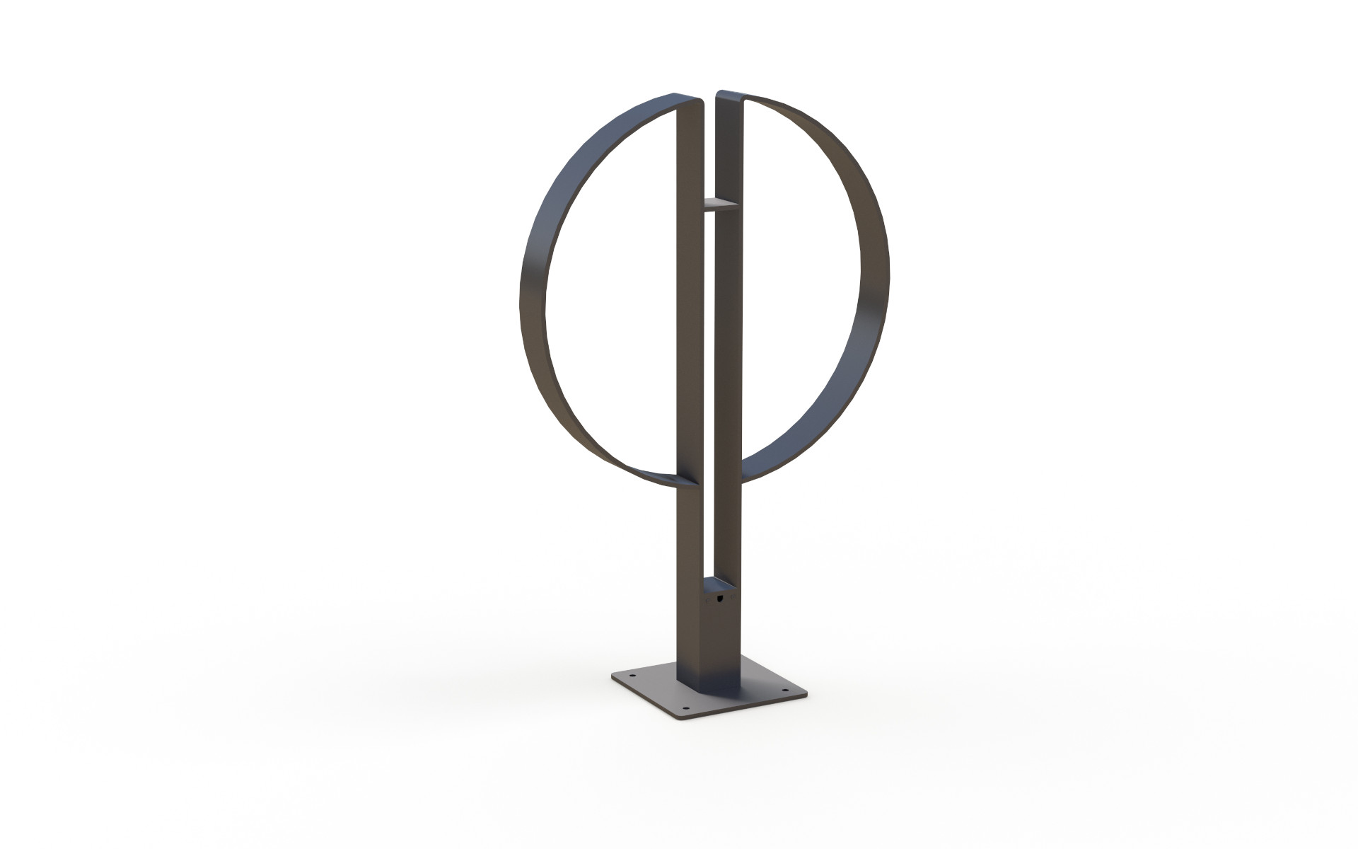 Portabiciclette costituito da due figure semicircolari realizzate in un unico piatto d’acciaio di grosso spessore e unite da piastrine orizzontali. Il portabiciclette consente di assicurare la bicicletta tramite il telaio. Utilizzabile anche come transenna modulare.
