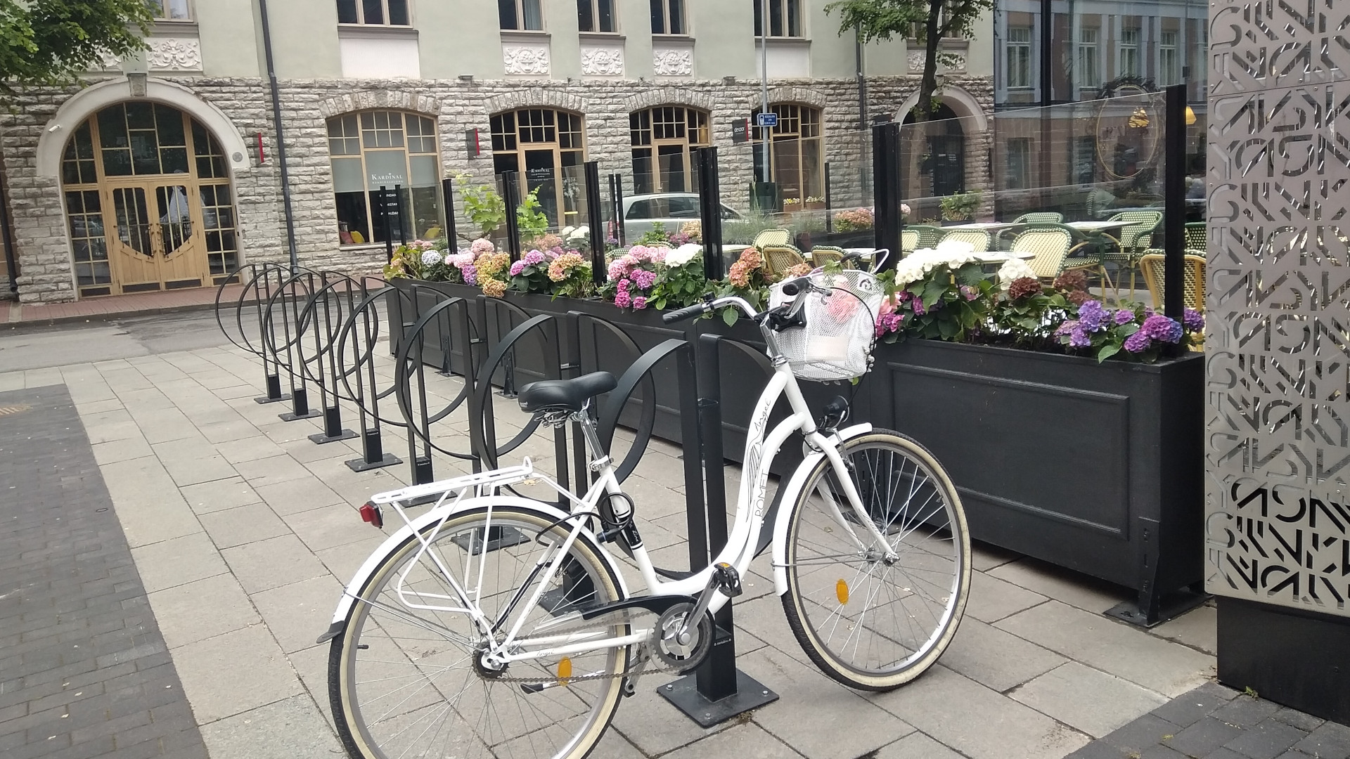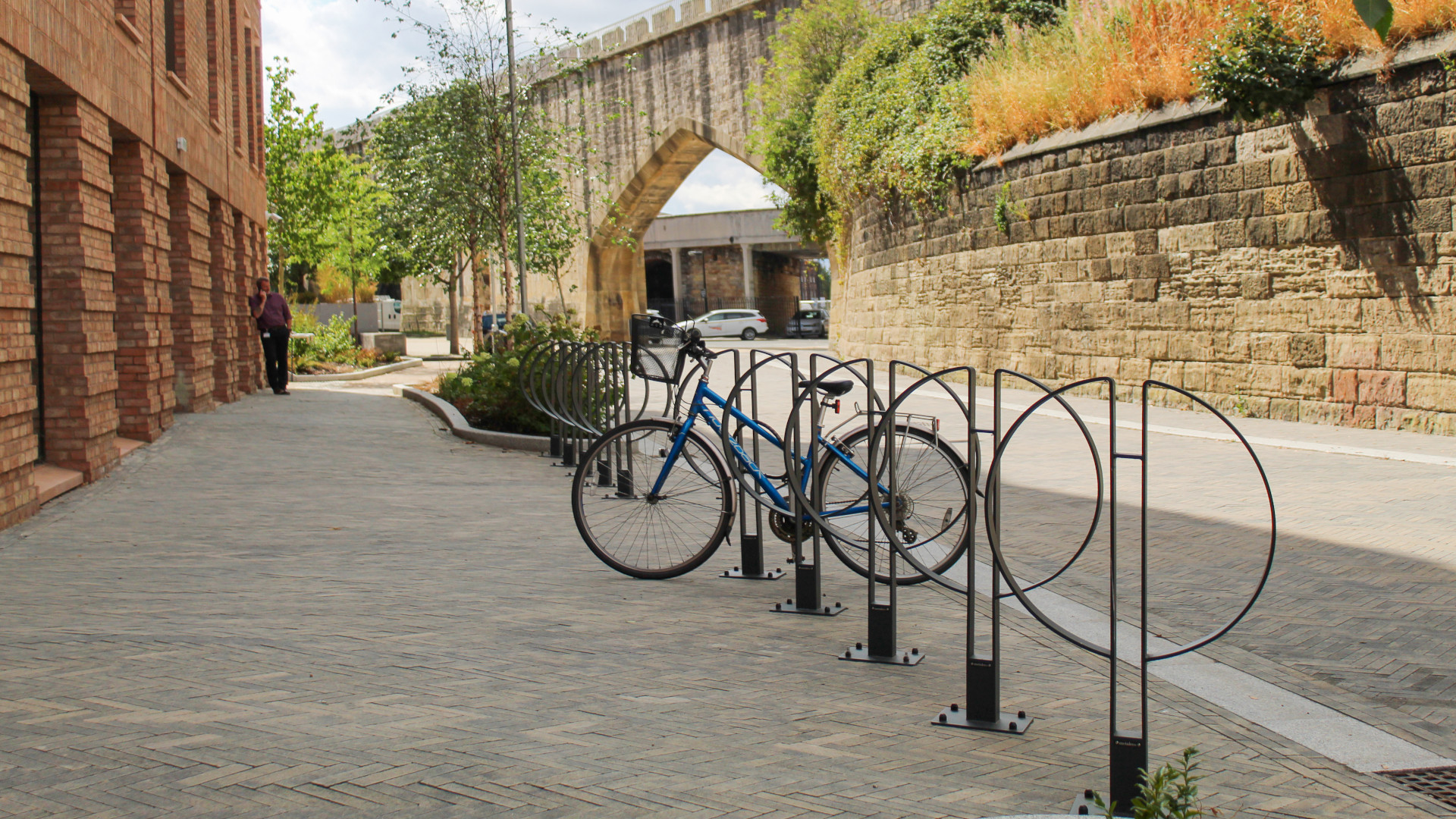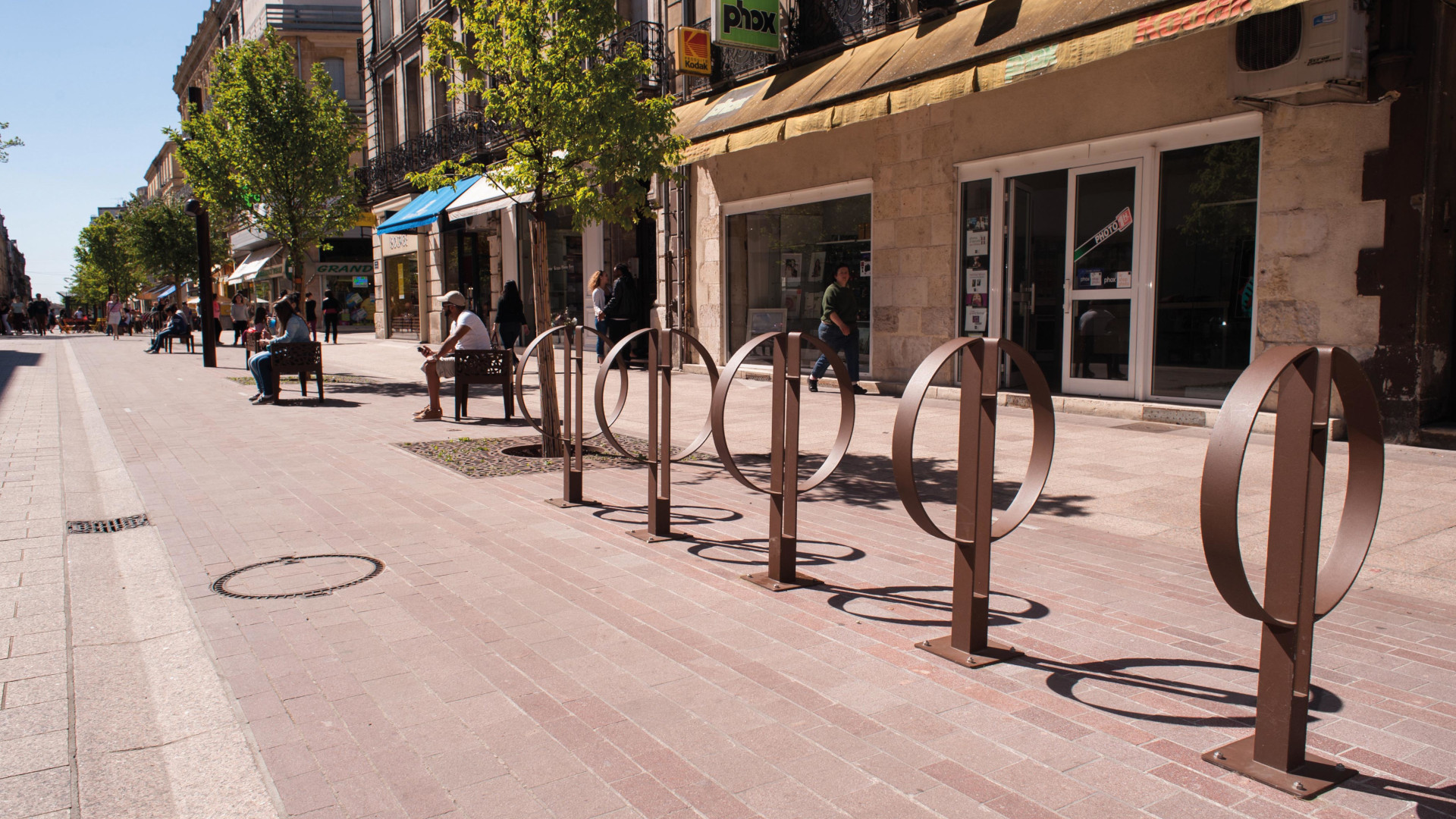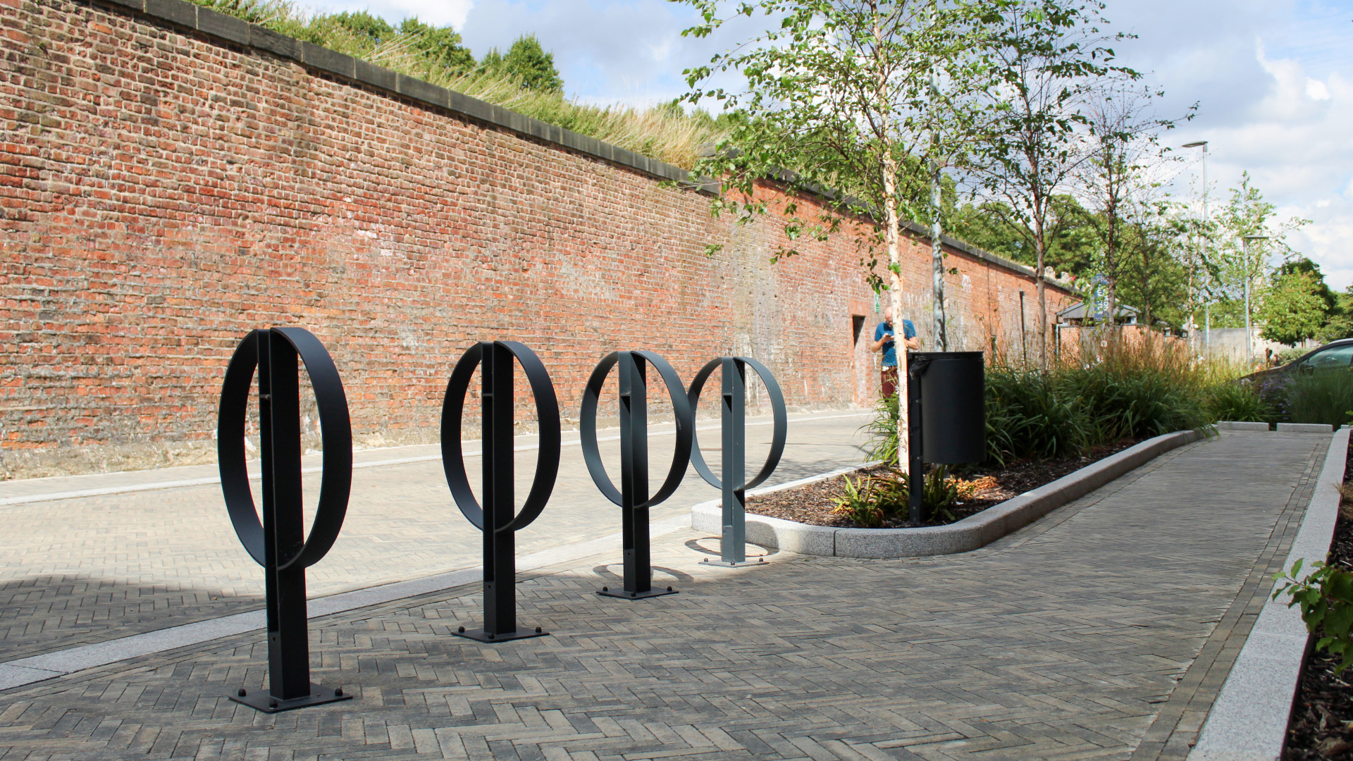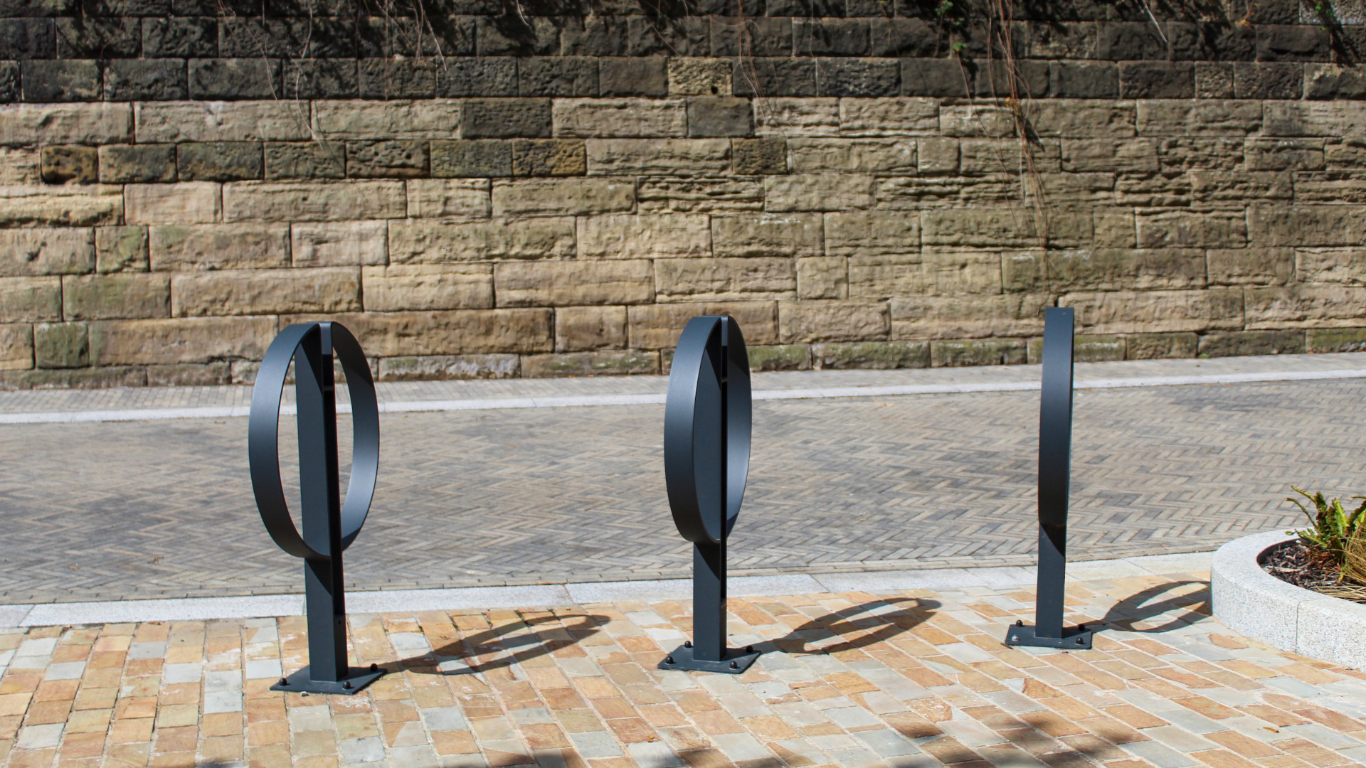 Portabiciclette costituito da due figure semicircolari realizzate in un unico piatto d’acciaio di grosso spessore e unite da piastrine orizzontali. Il portabiciclette consente di assicurare la bicicletta tramite il telaio. Utilizzabile anche come transenna modulare.