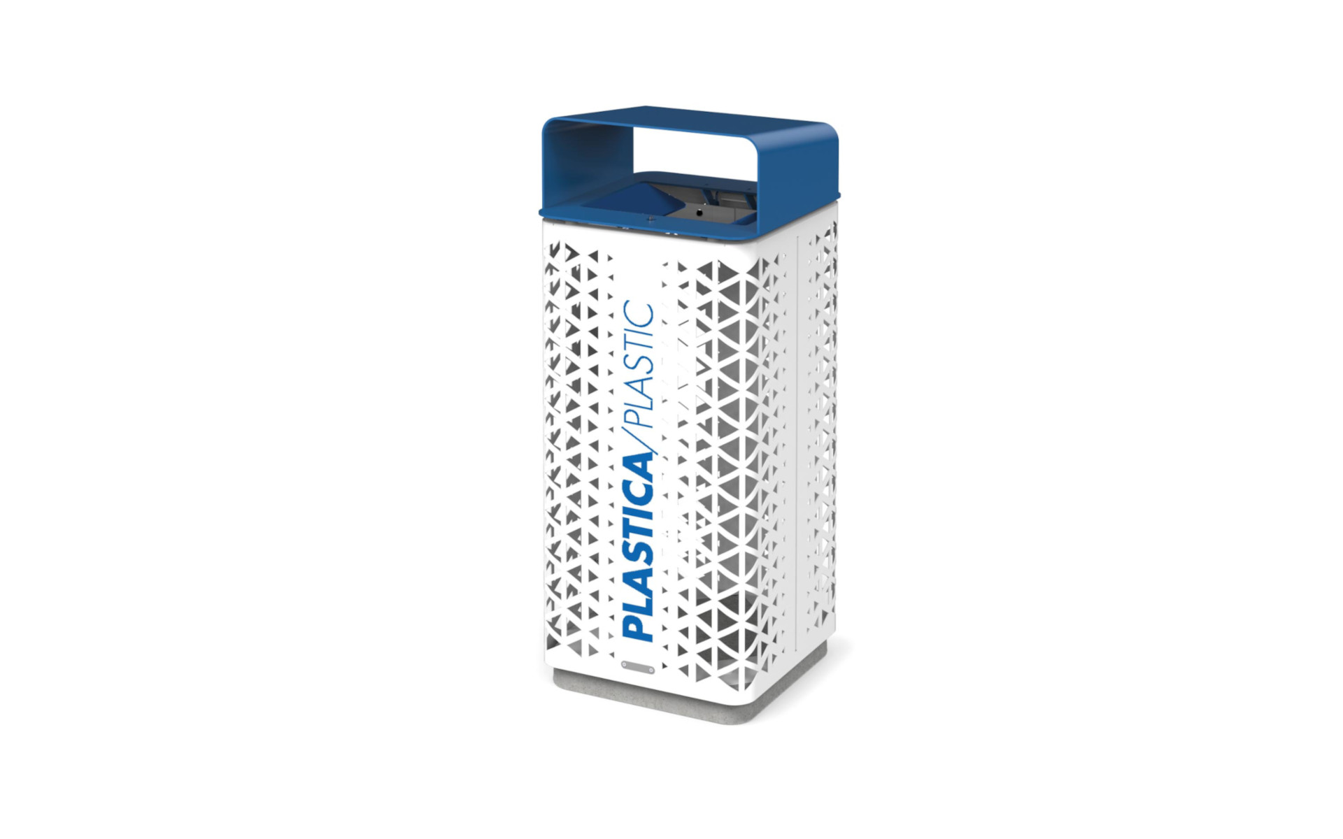 Collezione di cestini composta da una struttura in lamiera traforata a laser con motivi geometrici, dotata di coperchio con foro e convogliatore per il conferimento dei rifiuti. Il coperchio è apribile con serratura a scatto. All’interno è presente un anello reggisacco con elastico. La base è quadrata, realizzata in calcestruzzo. Disponibile anche nella versione con copertura antipioggia. I cestini possono essere affiancati per creare isole per la raccolta differenziata.