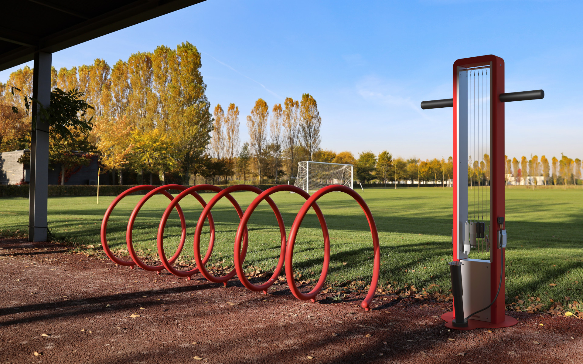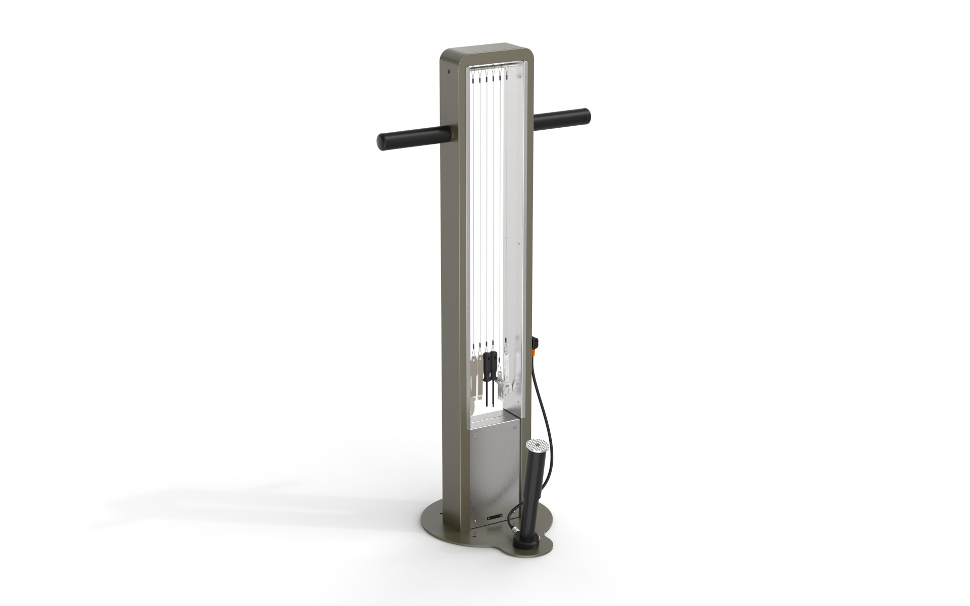 Colonnina per la riparazione delle biciclette con struttura in tubolare di acciaio saldato a una base in lamiera, rinforzata internamente con acciaio AISI304. La parte superiore è dotata di due supporti rivestiti con guaina termorestringente per sostenere la bicicletta durante gli interventi. Può essere equipaggiata con attrezzi per la manutenzione ordinaria e prese di ricarica.