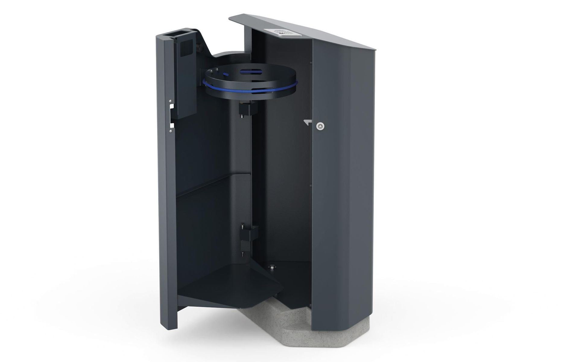 Cestino composto da una robusta struttura in lamiera d’acciaio verniciato o inox, dotata di copertura antipioggia per garantire la durabilità anche in condizioni atmosferiche difficili. L’anta frontale con serratura a scatto offre sicurezza e praticità nell’utilizzo, mentre il posacenere con contenitore integrato permette una gestione ordinata dei rifiuti legati al fumo. L’anello reggisacco, munito di elastico, facilita il fissaggio del sacco per la raccolta dei rifiuti. La piastra superiore in acciaio inox consente lo spegnimento delle sigarette in modo sicuro ed efficiente. Il cestino poggia su una solida base esagonale in calcestruzzo, che assicura stabilità e resistenza nel tempo.