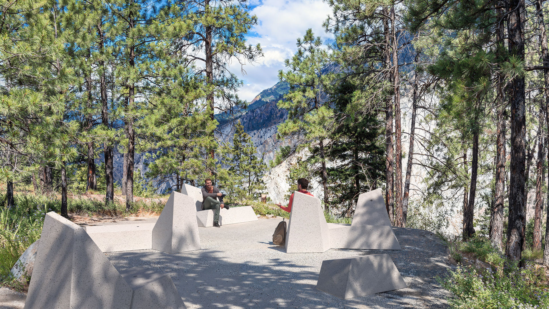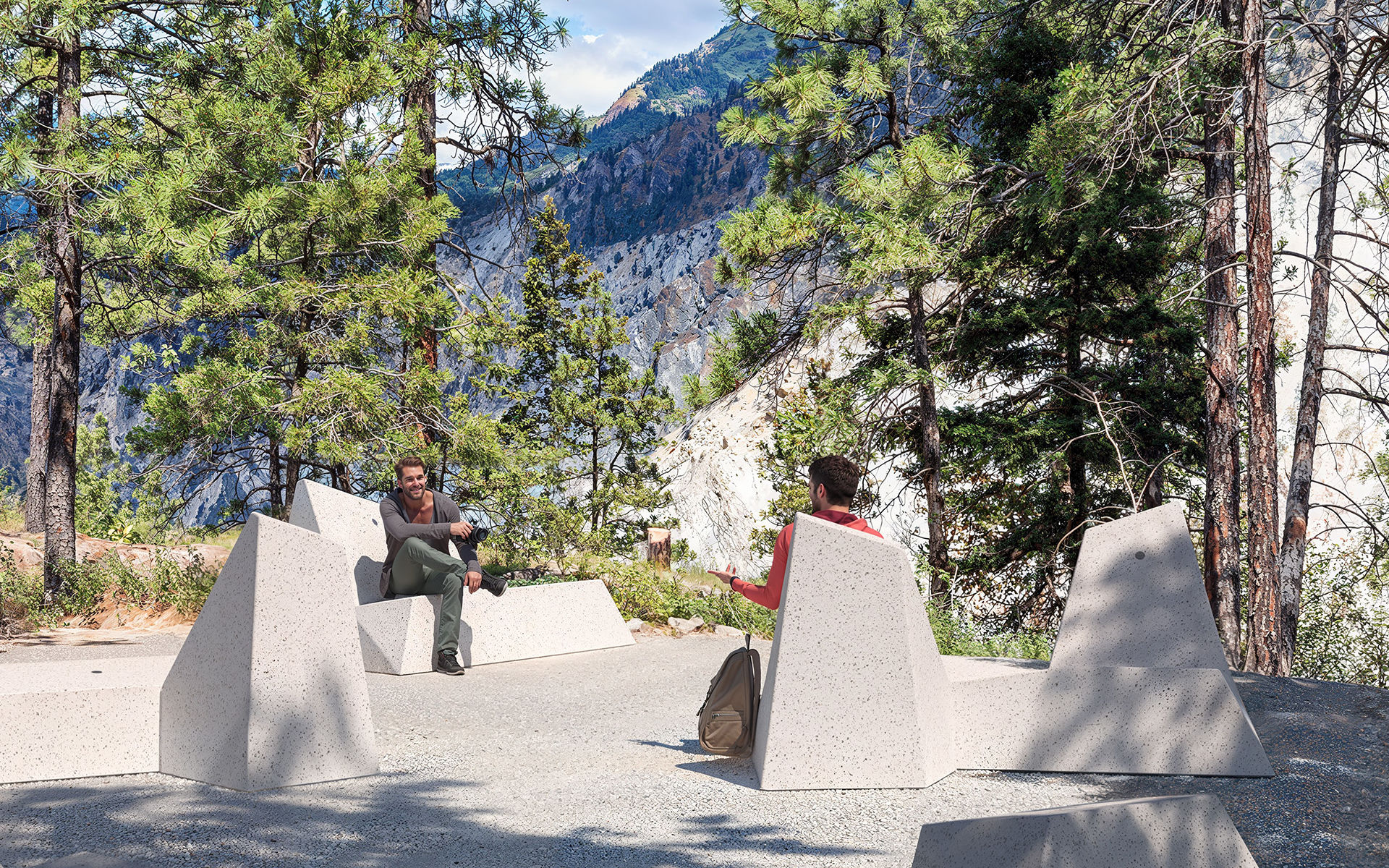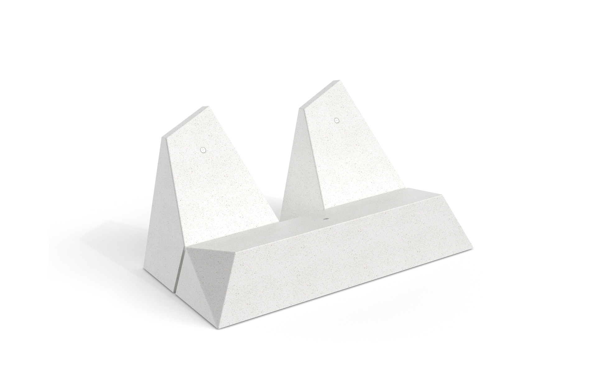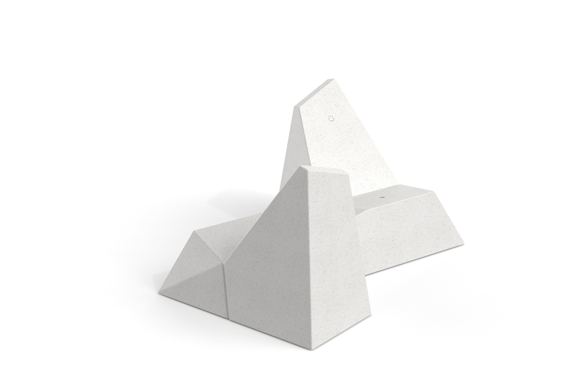 Collezione di panche monolitiche a forma di diamante realizzate in PDM (Pietre Ricostituite) con aggregati di granito o marmo e finitura sabbiata. Disponibili in versione piana, con uno o due schienali corti, con schienale lungo posizionato a destra o a sinistra e con due schienali contrapposti.