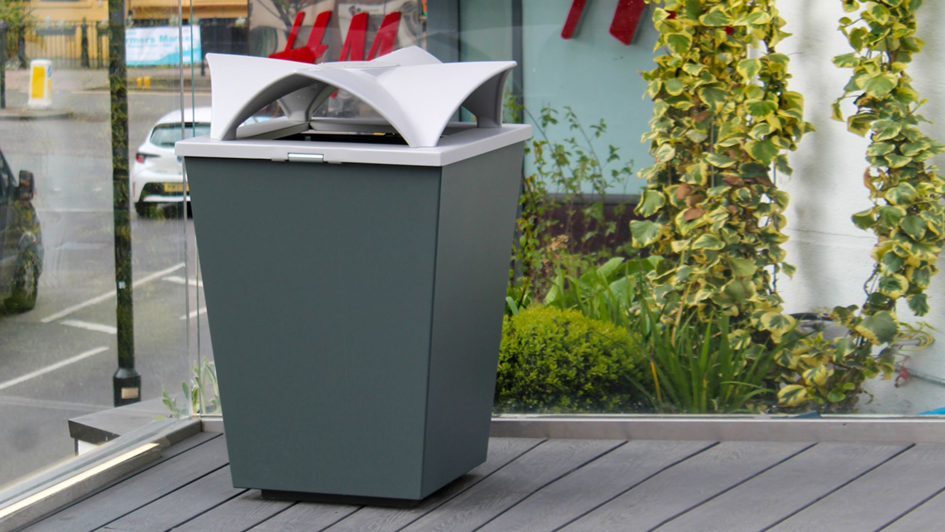 Il cestino di forma troncopiramidale è realizzato in lamiera d’acciaio verniciato, Inox o Corten, ed è dotato di una copertura antipioggia in fusione di alluminio con serratura e posacenere integrato. La copertura è disponibile in quattro diversi colori per la raccolta differenziata, o in versione monocromatica. Il cestino è munito di anelli reggisacco lungo il perimetro interno, garantendo praticità e resistenza in ambienti pubblici.