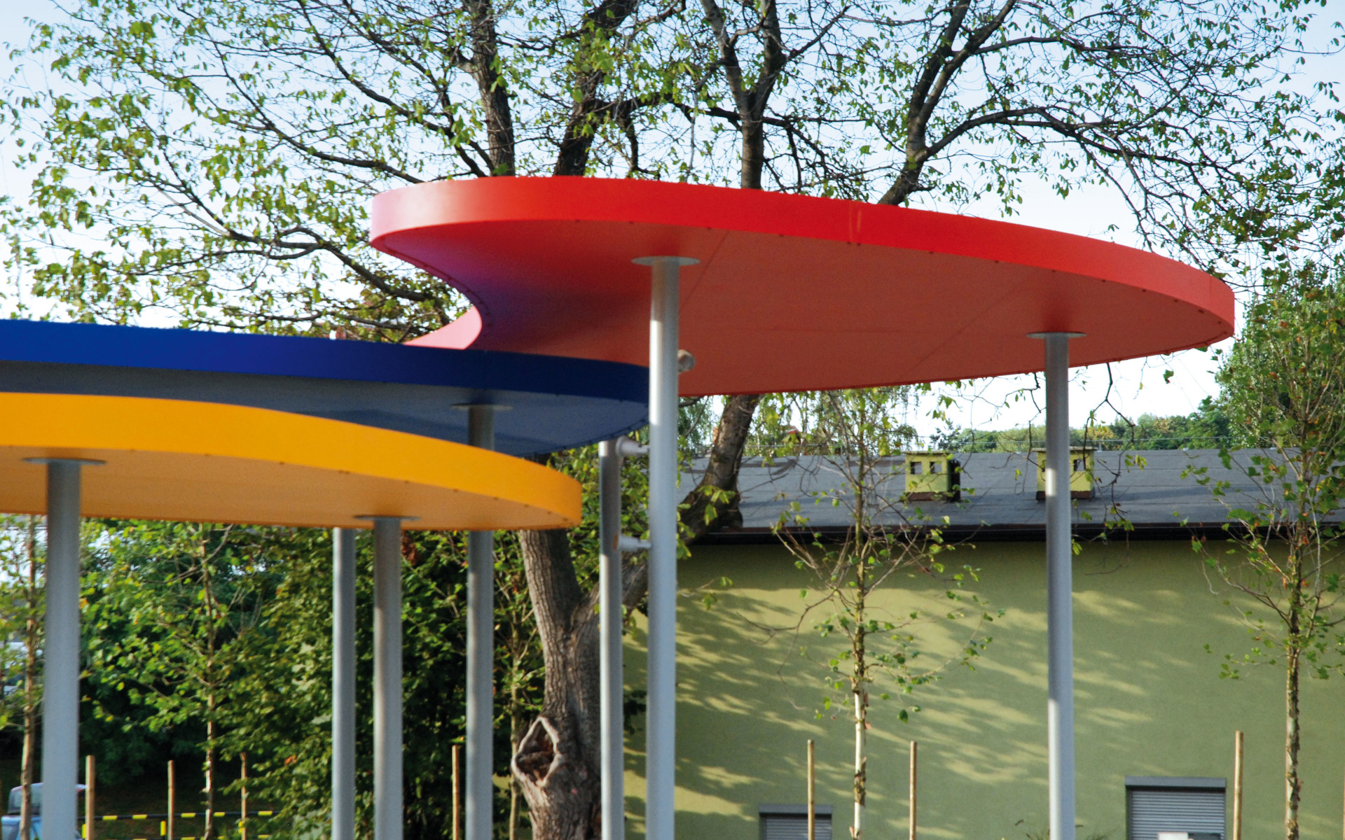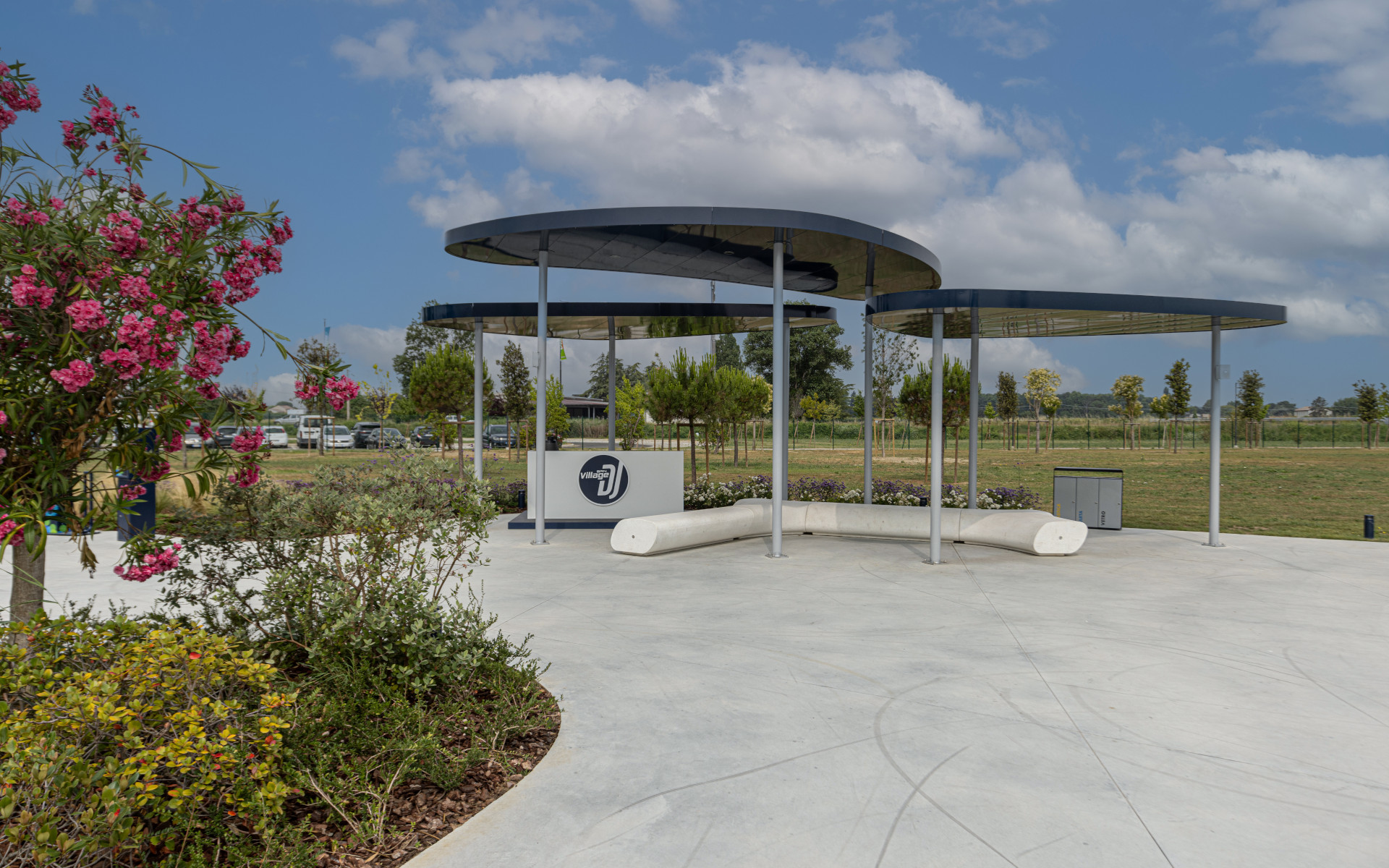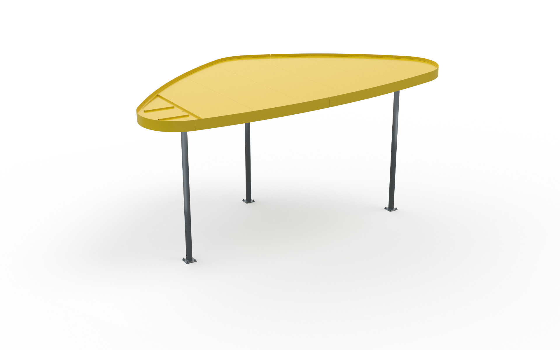 Collezione modulare di coperture ombreggianti, caratterizzate da colonne portanti in acciaio dotate di piastra base e predisposte per l’integrazione di un sistema di illuminazione. La copertura è costituita da un telaio in tubolare d’acciaio, rivestito inferiormente con lastre in lamiera d’acciaio e superiormente da un pannello coibentato, protetto da una guaina impermeabile applicata in loco. L’inclinazione della copertura è progettata per favorire lo scarico delle acque piovane all’interno di una delle colonne portanti.