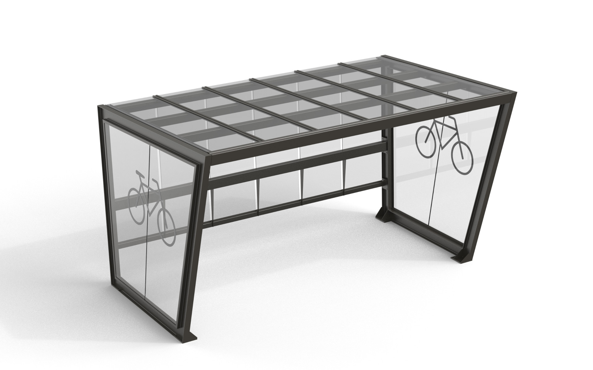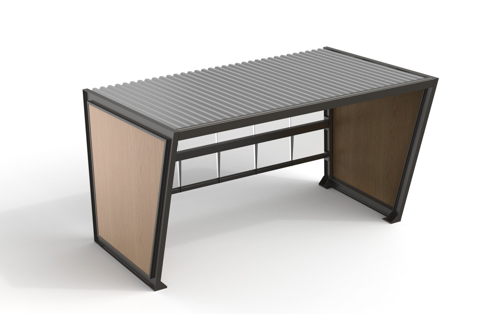 Collezione di coperture composta da due portali laterali in profili IPE tamponati con vetro o pannelli in multistrato di Okumé verniciato. La copertura superiore è disponibile in lastre di vetro o lamiera grecata, offrendo soluzioni versatili per diversi contesti urbani.