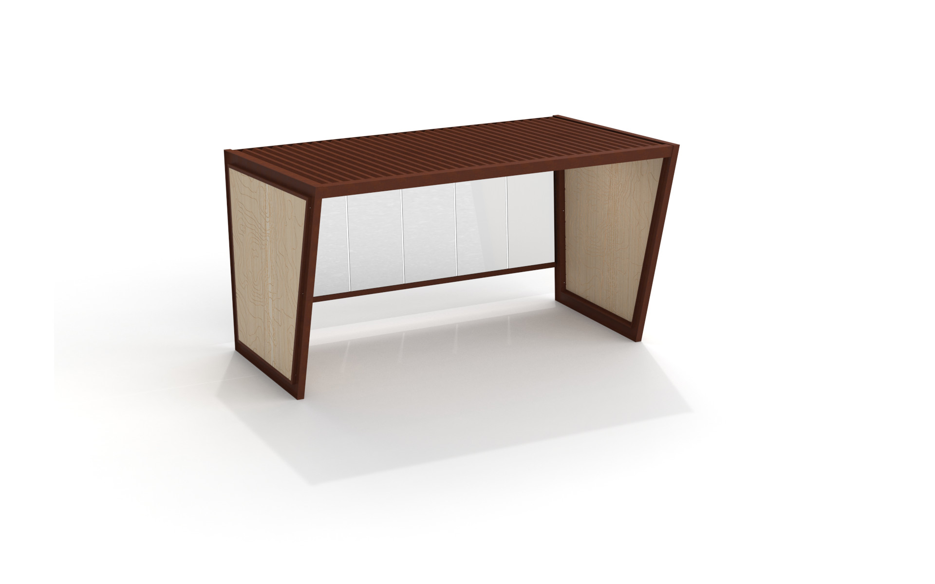 Collezione di coperture composta da due portali laterali in profili IPE tamponati con vetro o pannelli in multistrato di Okumé verniciato. La copertura superiore è disponibile in lastre di vetro o lamiera grecata, offrendo soluzioni versatili per diversi contesti urbani.