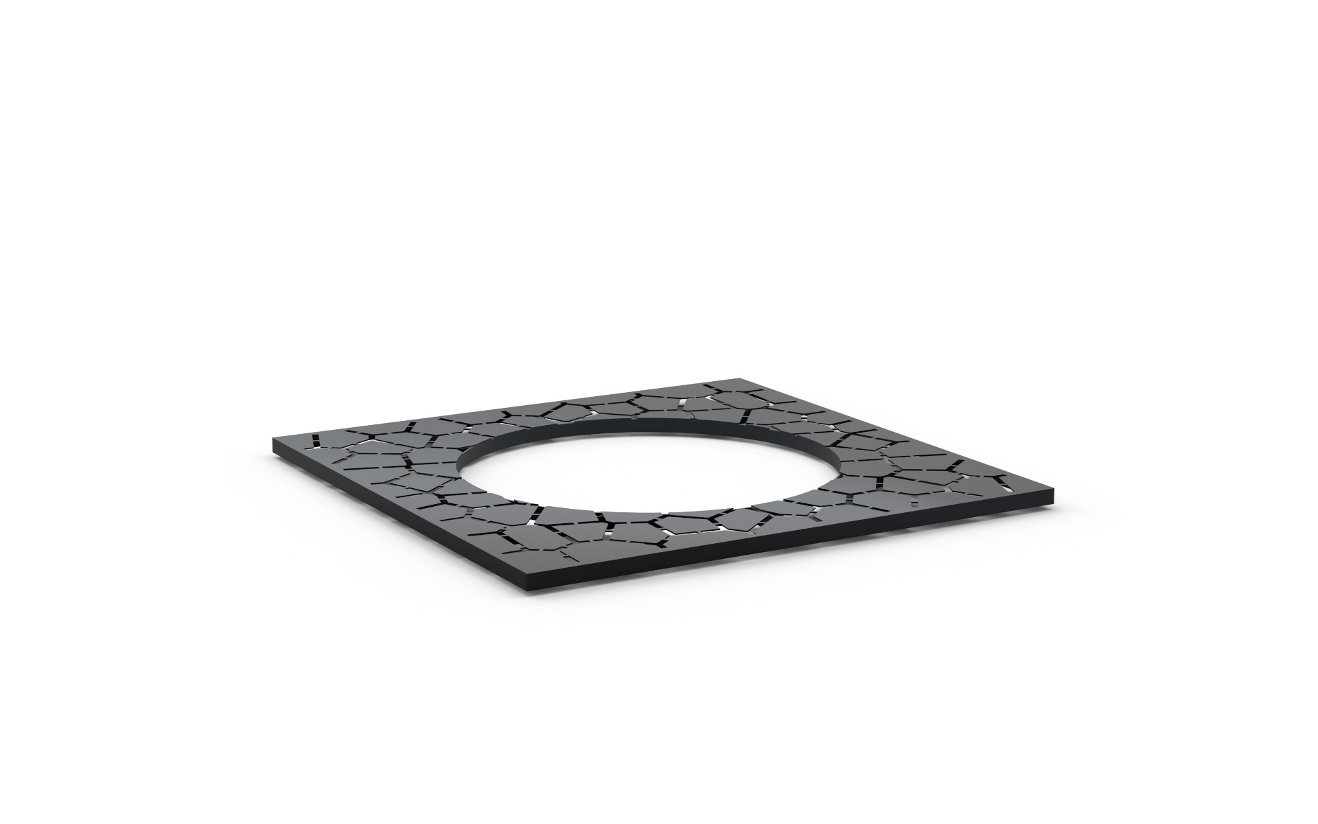 Salvapiante di forma quadrata con foro circolare centrale, realizzato in lamiera d’acciaio decorata al laser con un motivo ispirato alla terra. È composto da due metà fissabili tra loro mediante viti e rinforzato internamente e lungo il perimetro con piatti d’acciaio. Disponibile in diverse versioni per misura e diametro del foro, può essere accessoriato con controtelaio.