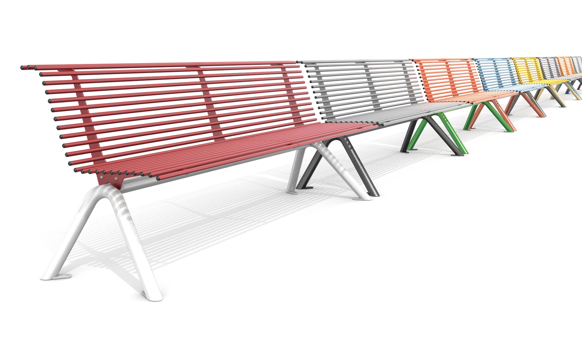 Collezione di panchine, con o senza schienale, dotata di un supporto composto da un corrente orizontale e due appoggi ad V in tubolare d’acciaio. Il piano di seduta e lo schienale sono costituiti da una serie di tubetti in acciaio verniciato, saldati su spalle di supporto in lamiera.