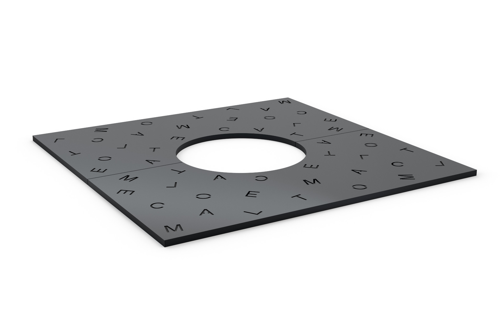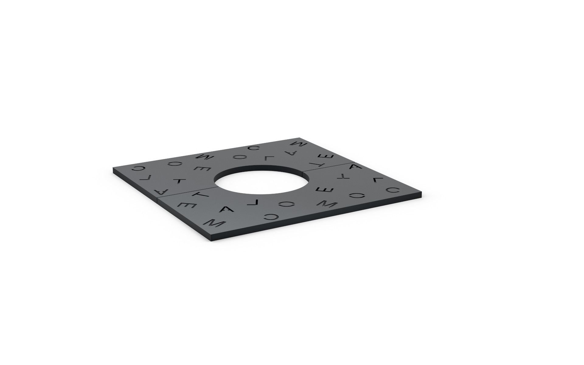 Salvapiante quadrato con foro circolare, realizzato in lamiera d’acciaio decorata al laser con un motivo a lettere maiuscole. Composto da due metà, facilmente assemblabili tramite viti, e dotato di rinforzi in piatto d’acciaio, sia internamente che sul perimetro, per garantire resistenza e durata nel tempo. Disponibile in diverse versioni per misura e diametro del foro, può essere accessoriate con un controtelaio per una maggiore stabilità.