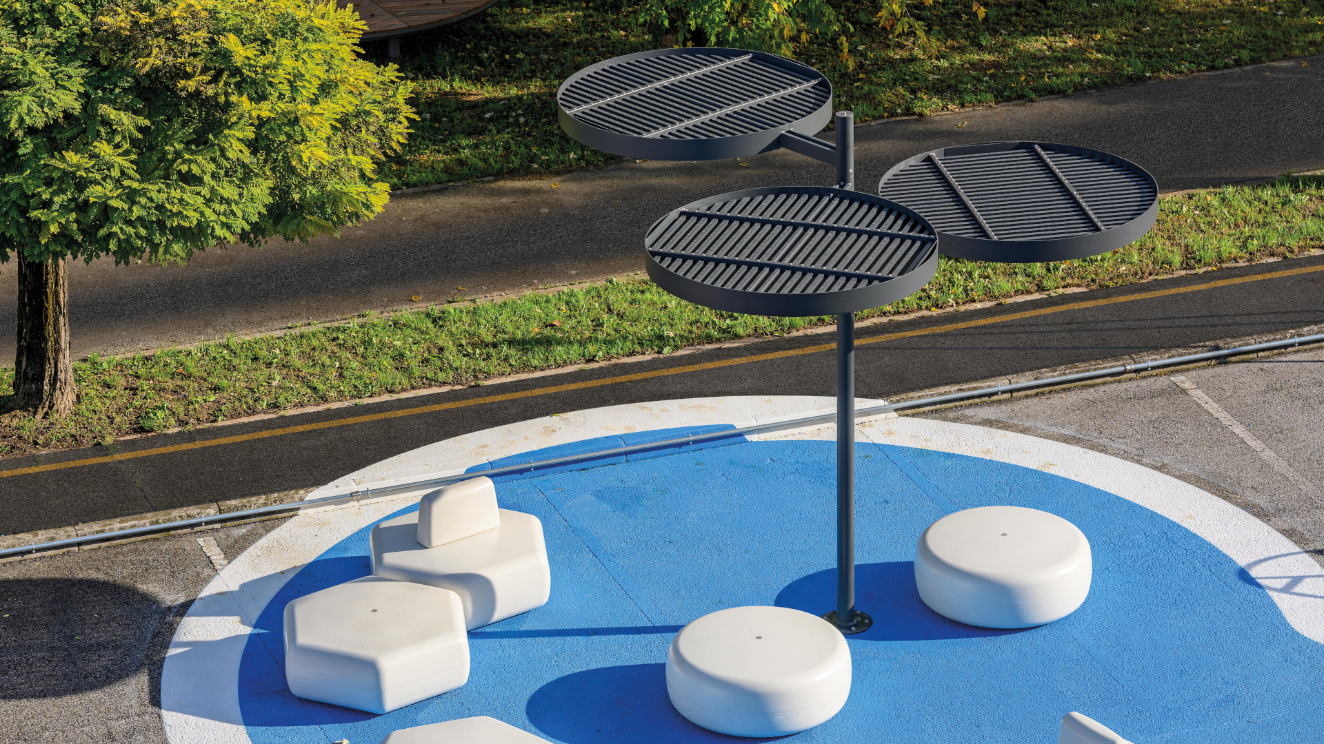 Struttura ombreggiante composta da una colonna portante con tre telai di forma circolare in acciaio, posizionati a diverse altezze e dotati di profili frangisole in alluminio. Ideale per creare aree di ombra funzionali e di design in spazi esterni.