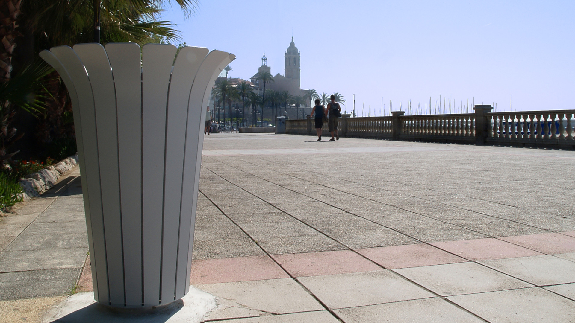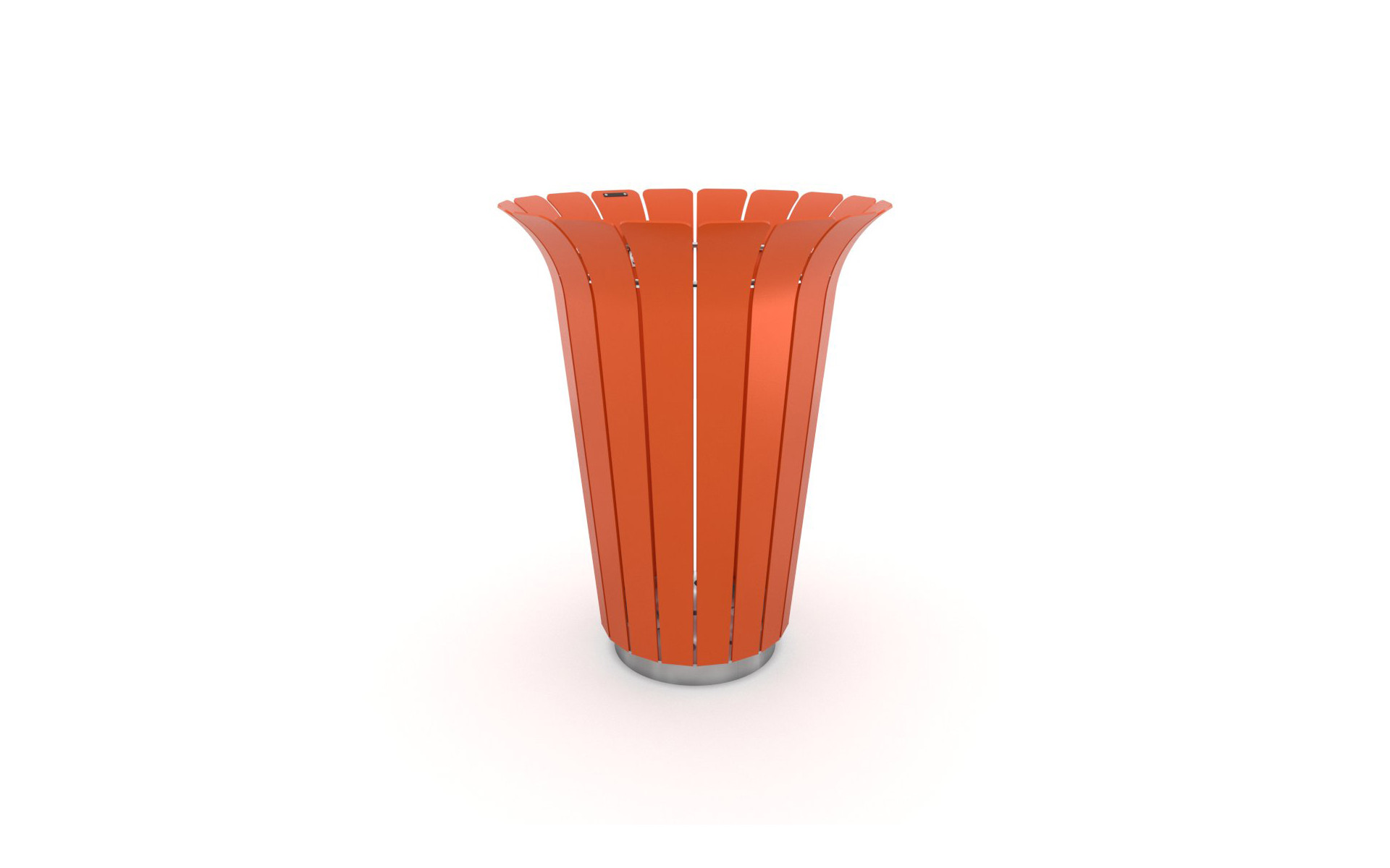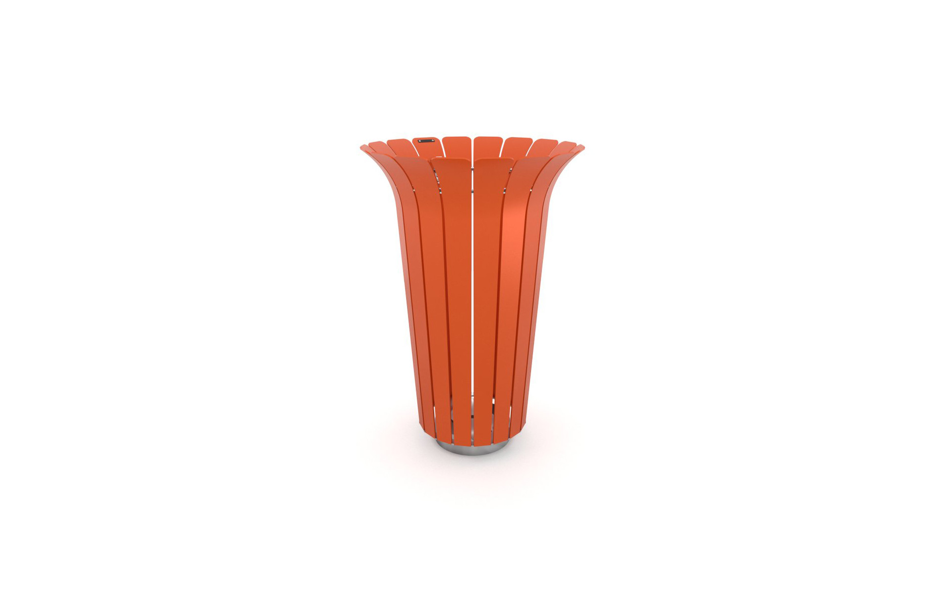 Collezione di cestini di forma floreale, composti da “petali” in acciaio verniciato, Corten o Inox sagomato, con base circolare in acciaio Inox e anello reggisacco in trafilato d’acciaio. Disponibile in due dimensioni.