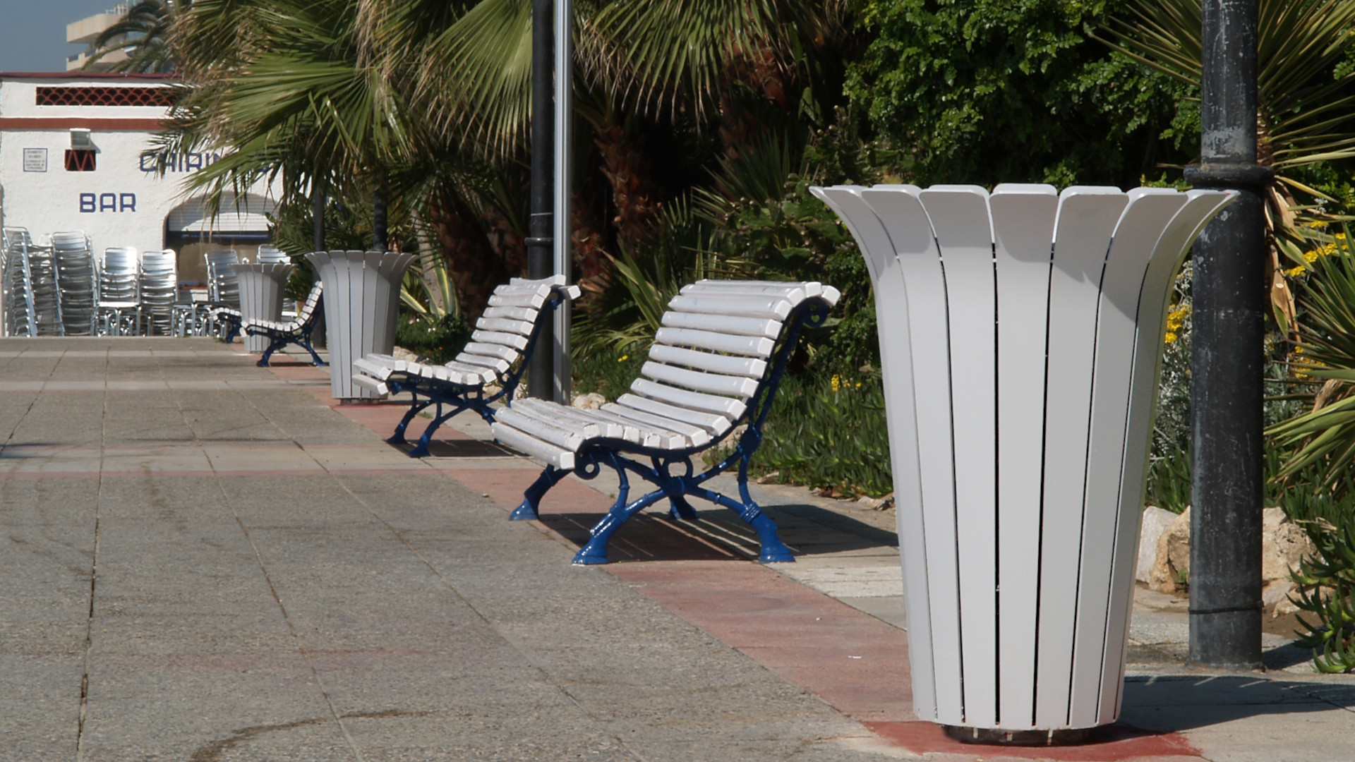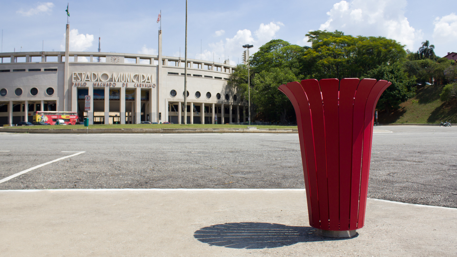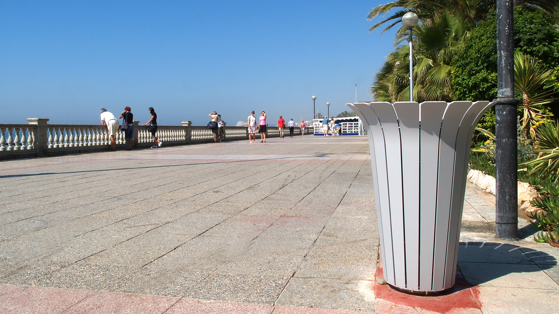 Collezione di cestini di forma floreale, composti da “petali” in acciaio verniciato, Corten o Inox sagomato, con base circolare in acciaio Inox e anello reggisacco in trafilato d’acciaio. Disponibile in due dimensioni.