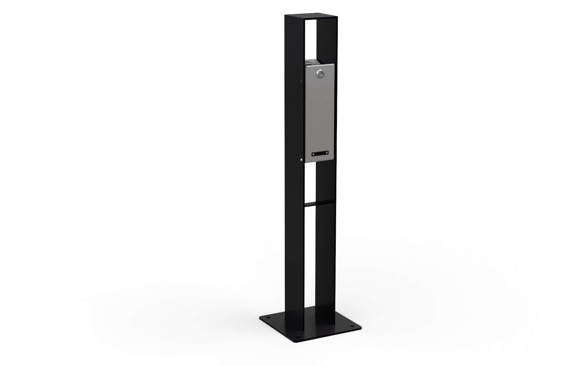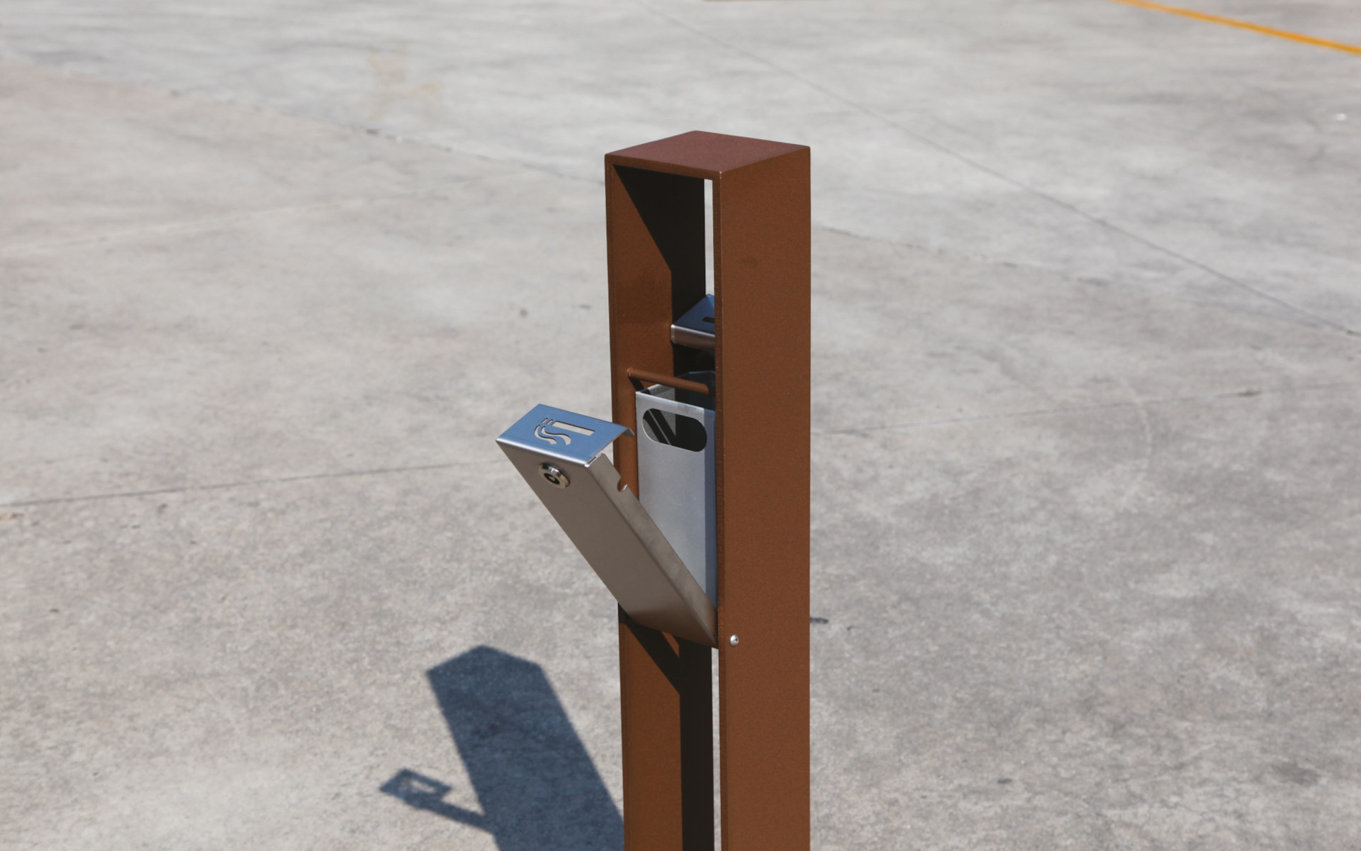 Getta sigarette di sezione quadrata 120×120 mm, realizzato in piatto d’acciaio da 6 mm di spessore e con altezza di 1000 mm. La base misura 250×250 mm ed è dotata di una parte centrale chiusa da due lamiere sagomate in acciaio inox da 2 mm di spessore. Le estremità inclinate permettono lo spegnimento delle sigarette e la loro introduzione nella parte inferiore, dove si trova un contenitore quadrato estraibile, accessibile tramite sportello frontale con serratura a chiave triangolare. Il fissaggio al suolo avviene tramite tasselli di acciaio (non inclusi). Disponibile in versione acciaio zincato a caldo e verniciato a polvere poliestere, o in acciaio corten con ciclo di sabbiatura e ossidazione, messo a punto da Metalco. Tutta la viteria è in acciaio inox.