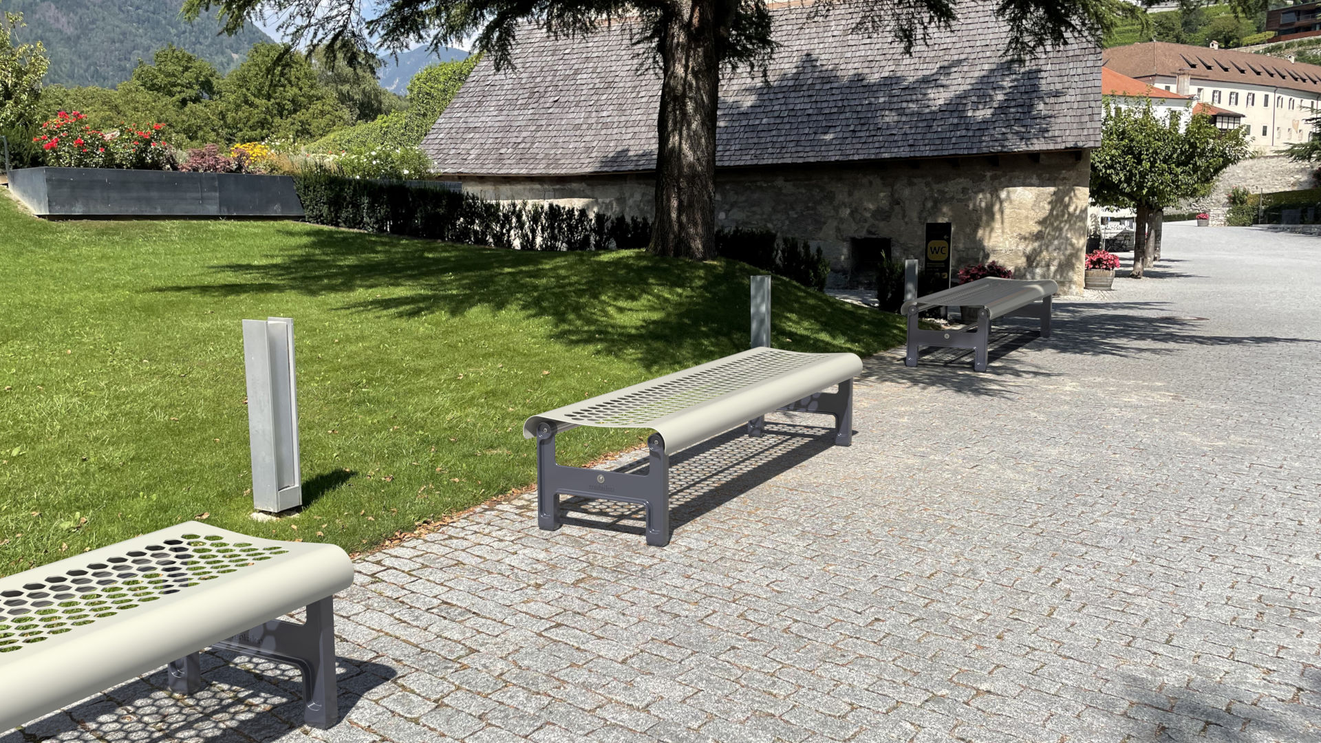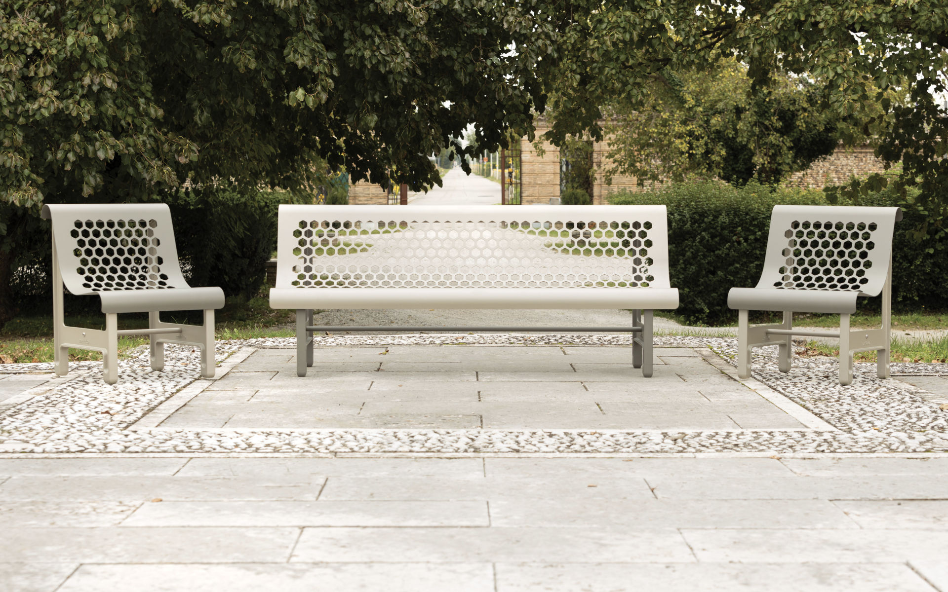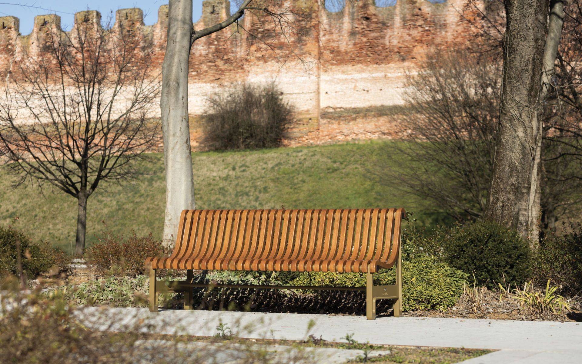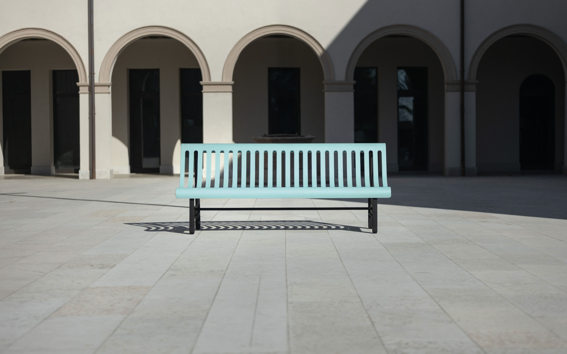 Le panche con schienale possono essere accessoriate con braccioli in acciaio verniciato, per un comfort maggiore e una fruizione inclusiva dello spazio pubblico.