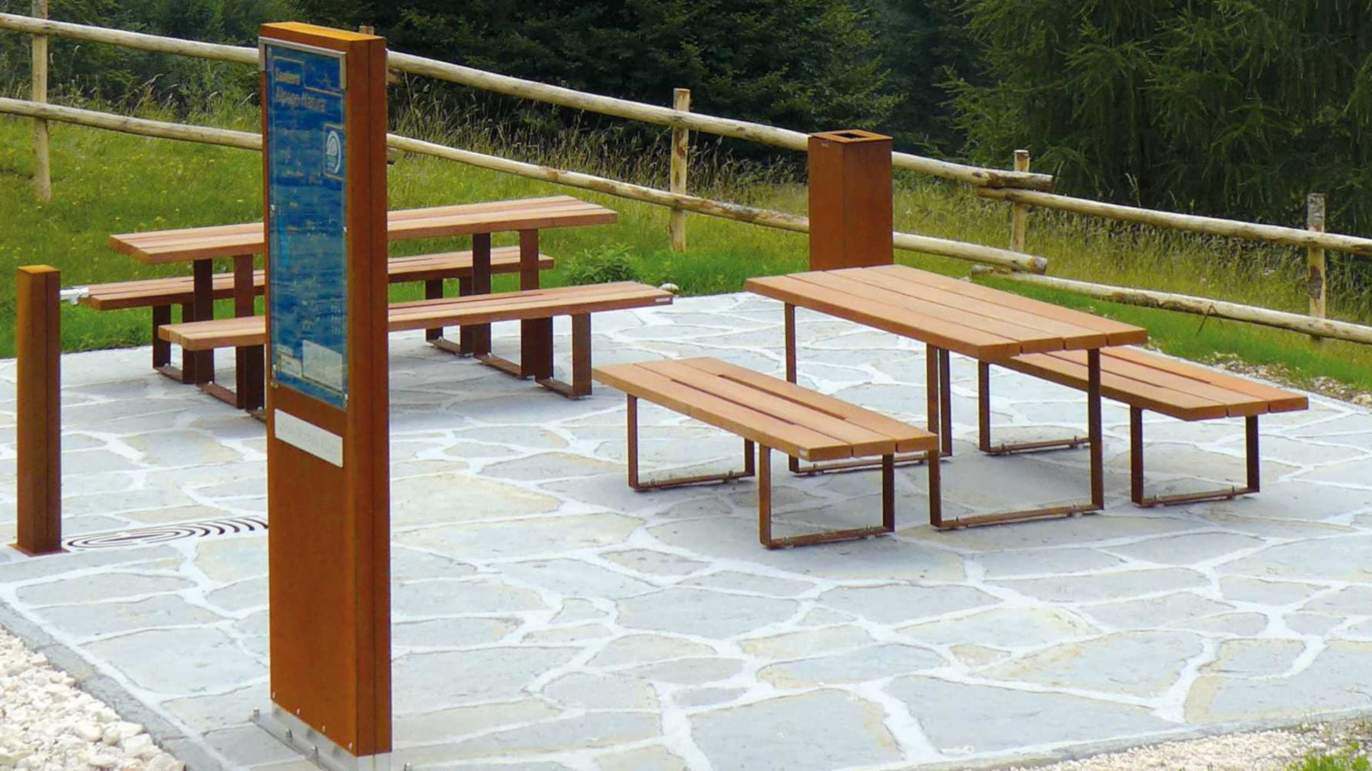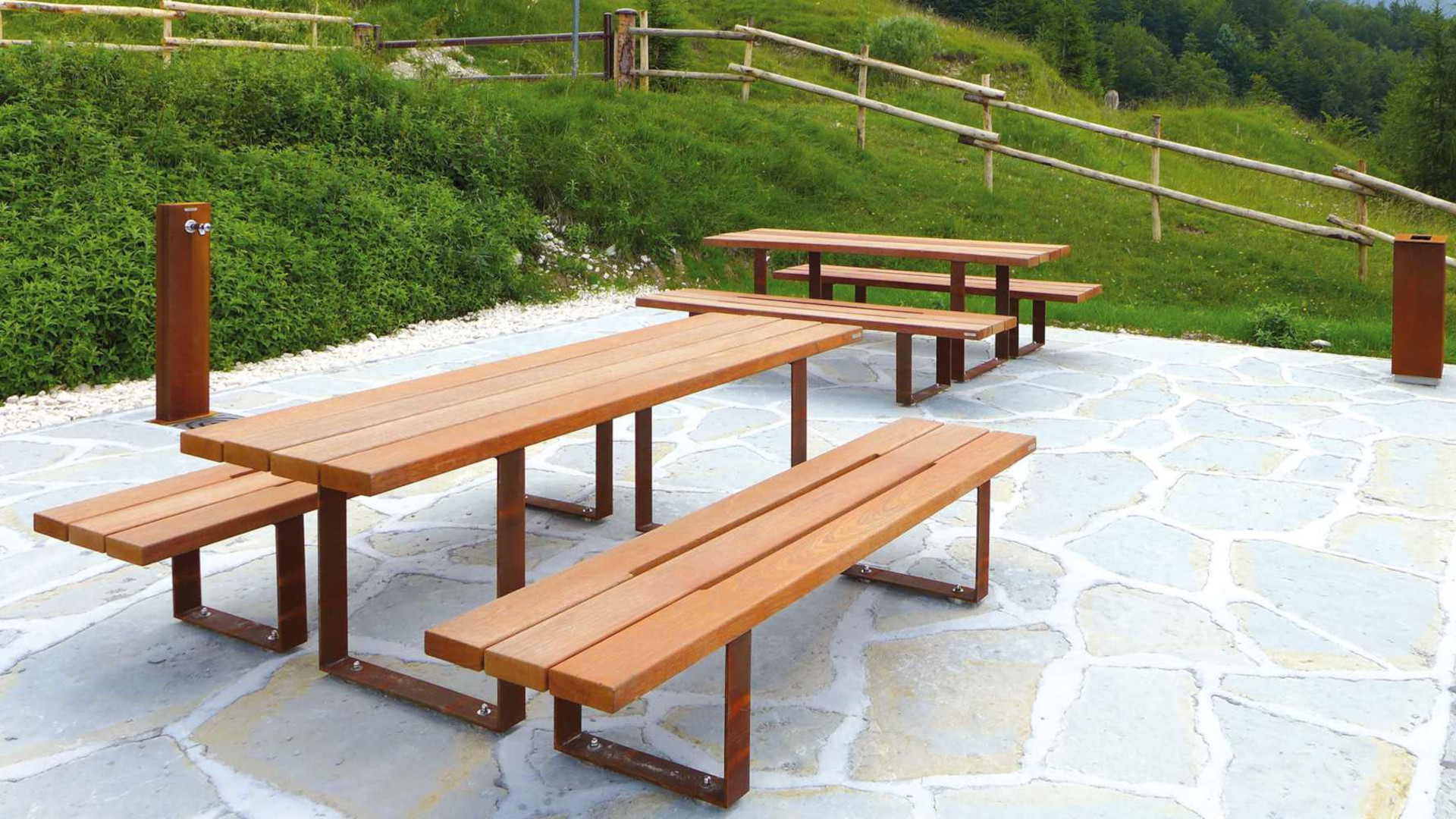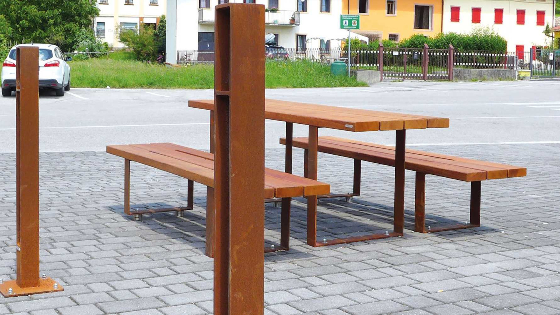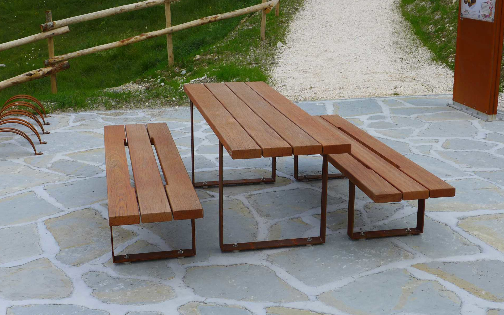 Tavolo da pic-nic con sedute abbinate, costituito da due supporti in piatto d’acciaio verniciato o Corten o Inox e da un piano in legno duro o larice. Le panchine, senza schienale, sono composte da due supporti in piatto d’acciaio verniciato o Corten o Inox e da una seduta in legno.