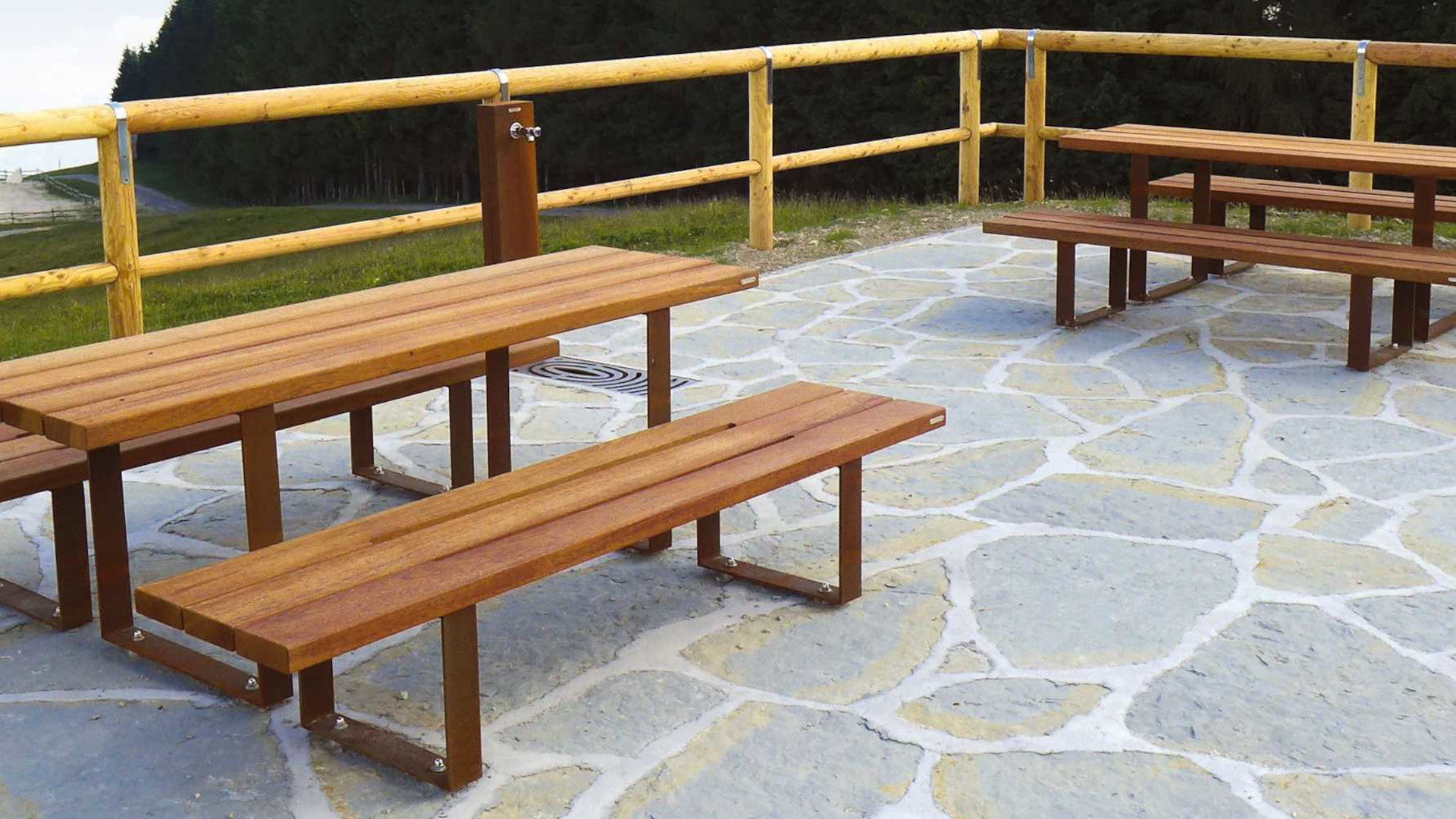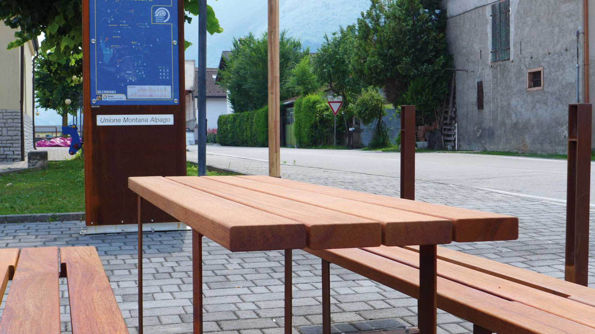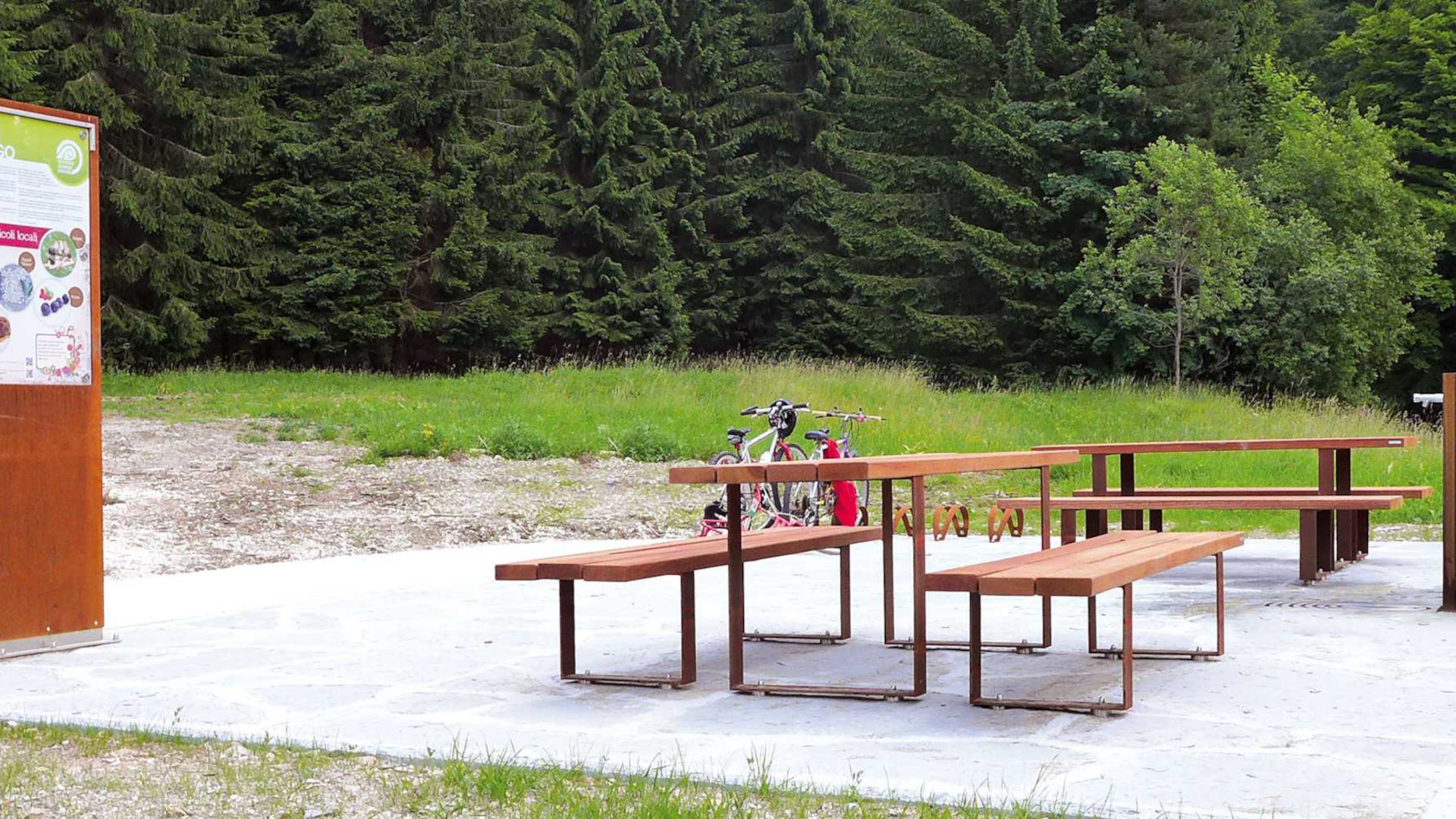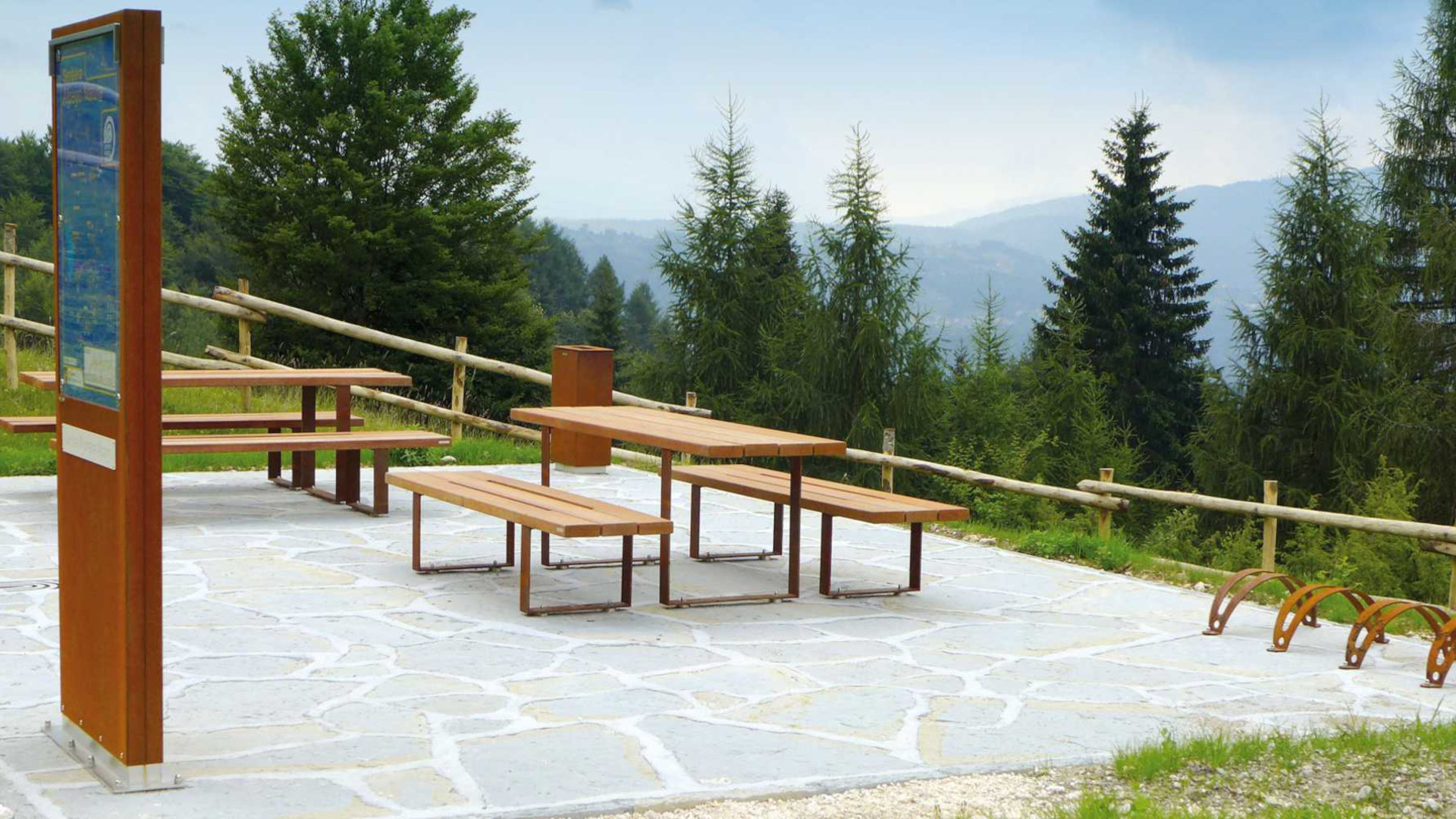 Tavolo da pic-nic con sedute abbinate, costituito da due supporti in piatto d’acciaio verniciato o Corten o Inox e da un piano in legno duro o larice. Le panchine, senza schienale, sono composte da due supporti in piatto d’acciaio verniciato o Corten o Inox e da una seduta in legno.