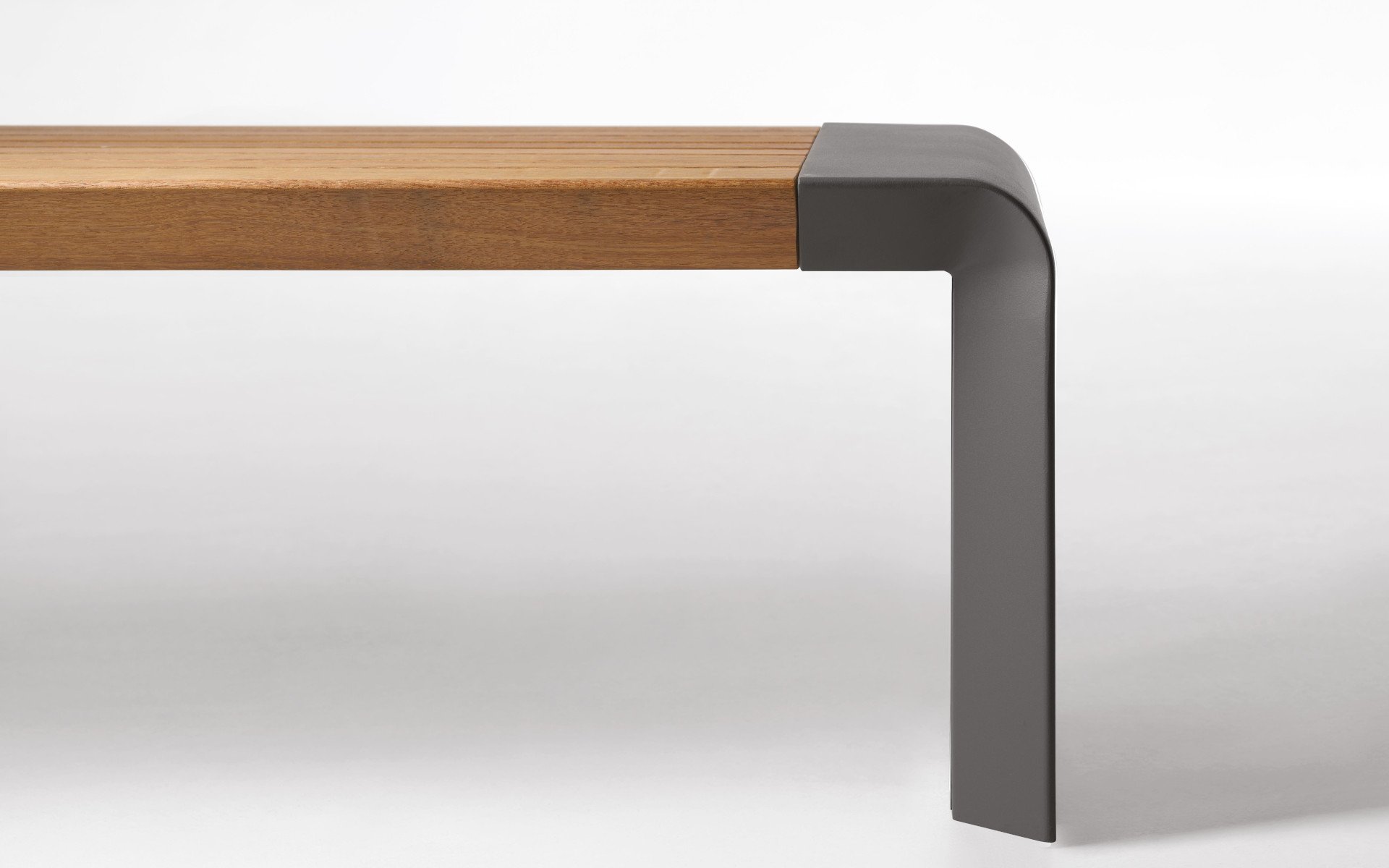 Collezione di panchine a ponte, disponibili con o senza schienale, caratterizzate da due supporti laterali in fusione di alluminio verniciato con angoli arrotondati. La seduta è realizzata in legno duro, in larice o in acciaio verniciato, a seconda della configurazione scelta.