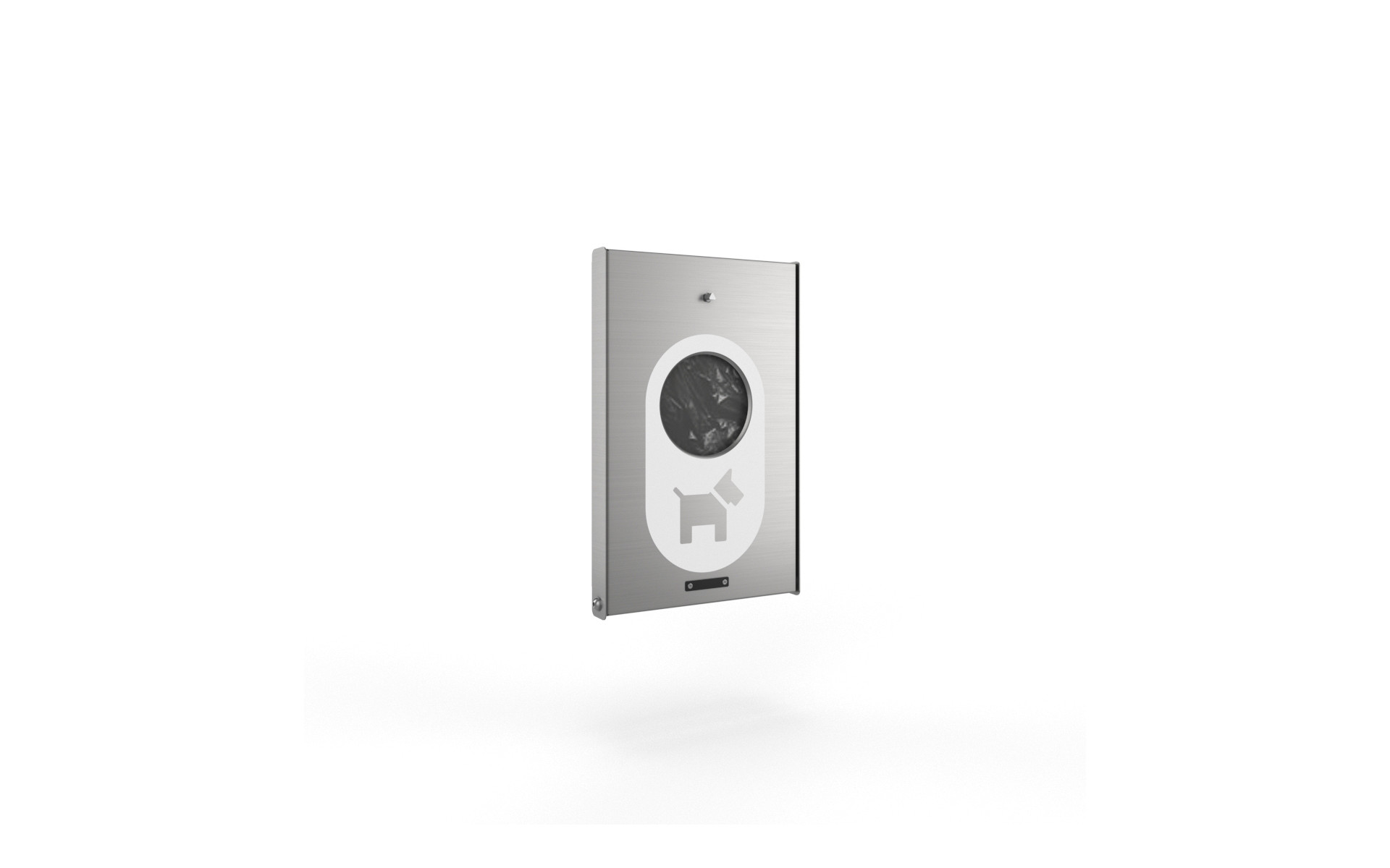 Contenitore per la distribuzione di sacchetti destinati alla raccolta delle deiezioni canine, realizzato in lamiera d’acciaio verniciata. Dotato di anta apribile con serratura a scatto, è fornito di staffe per il fissaggio a muro o su palo esistente.