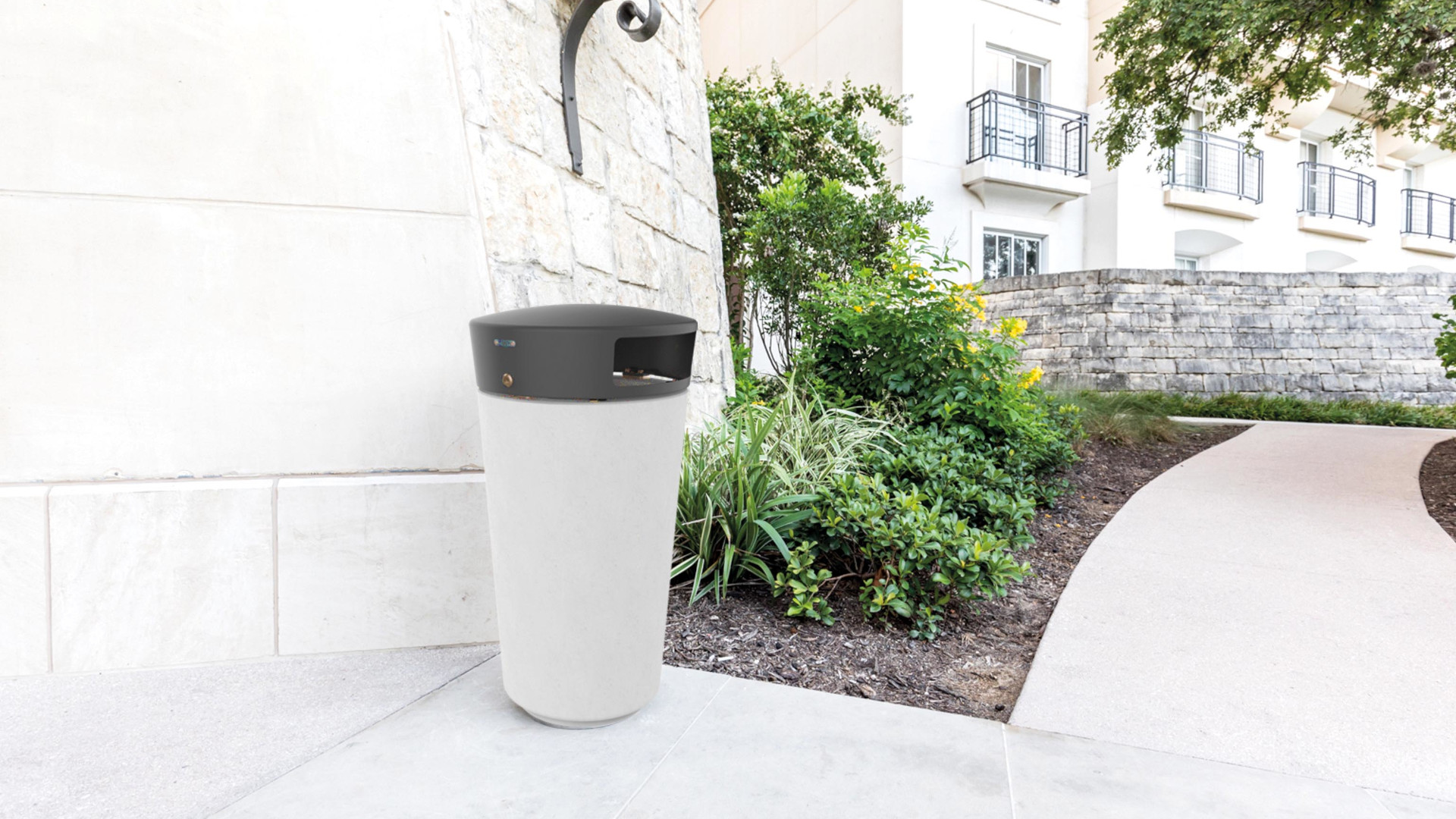 Cestino di forma troncoconica realizzato in HPC (High Performance Concrete), completo di copertura antipioggia in acciaio apribile mediante serratura. All’interno, lungo la circonferenza, è integrato un anello reggisacco.