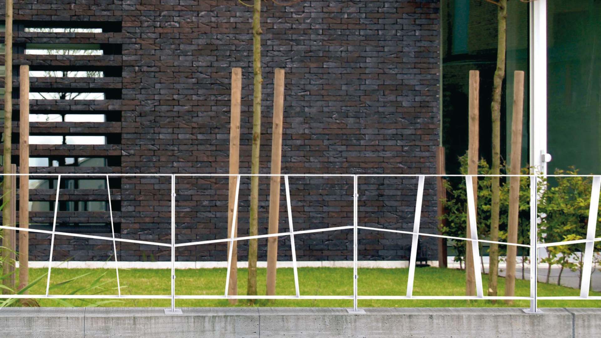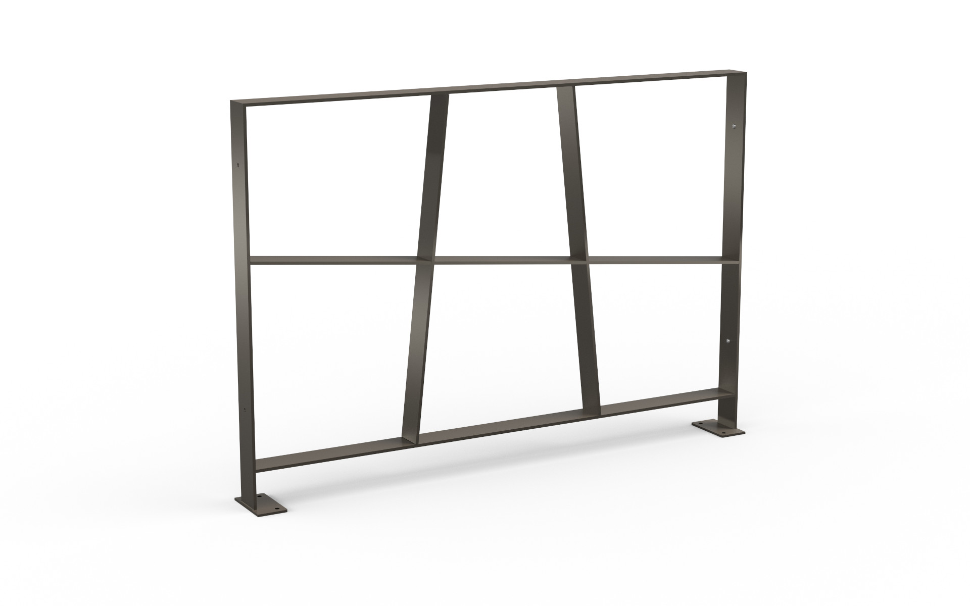 Transenna modulare composta da un profilo perimetrale in piatto d’acciaio e da elementi interni costituiti da un corrente orizzontale e due elementi verticali inclinati, intersecati tra loro a formare una struttura dinamica e visivamente riconoscibile. Ideale per delimitare spazi in modo funzionale e dal forte impatto estetico.