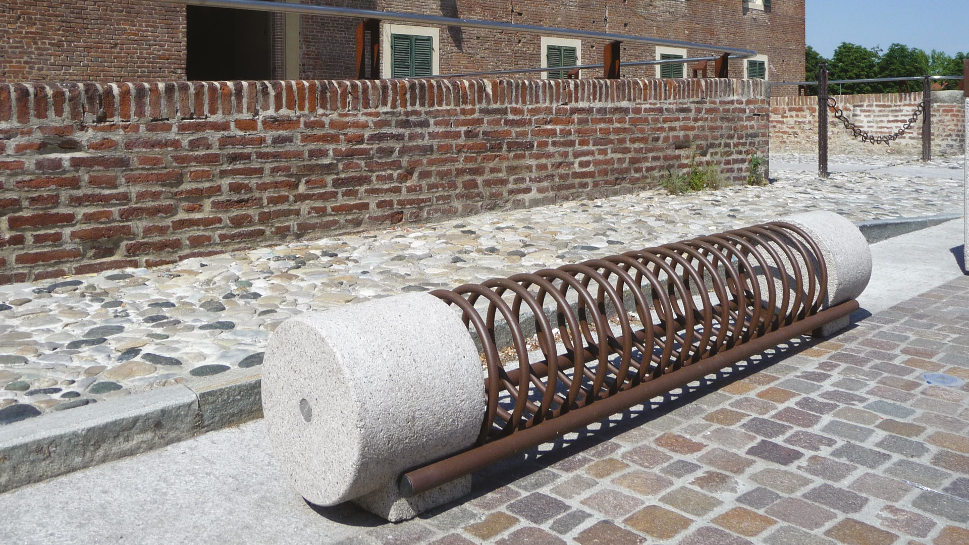 Portabiciclette in tubolare d’acciaio, costituito da una spirale continua collegata a due tubolari orizzontali. La struttura metallica è fissata ai basamenti laterali in PDM (Pietre Ricostituite).