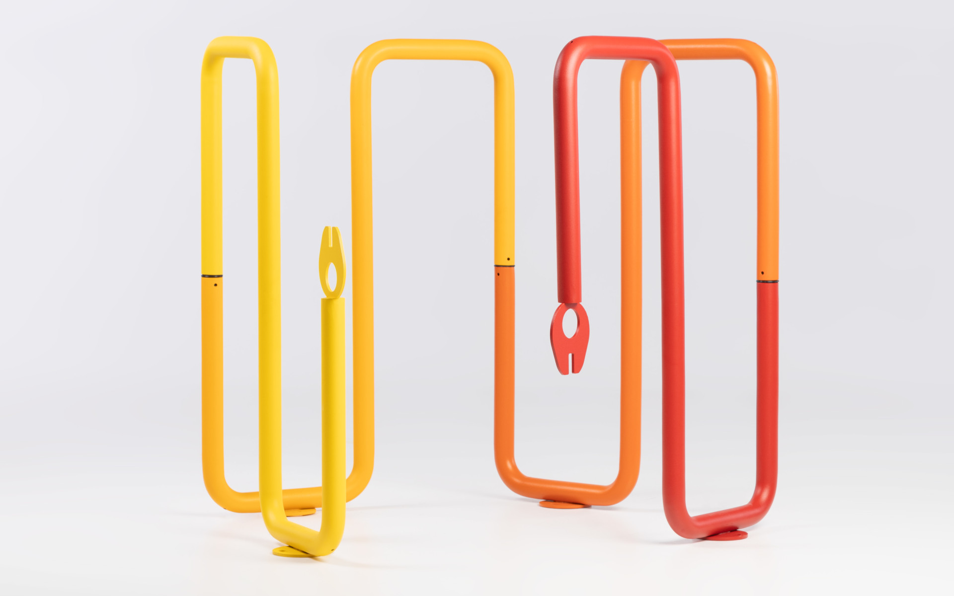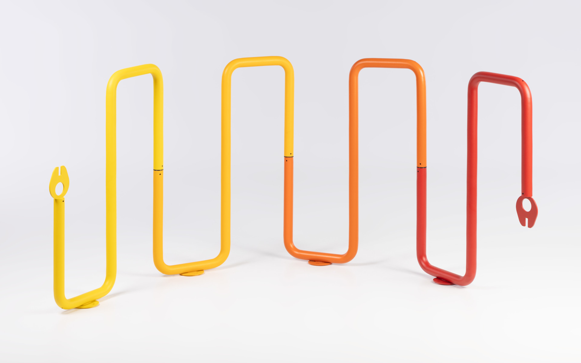 Portabici modulare realizzato in tubolare di acciaio piegato, saldato a una piastra base in lamiera di acciaio verniciato. Gli elementi sono collegabili in serie tramite un apposito innesto in tecnopolimero, che consente configurazioni flessibili e continue, ideali per contesti urbani ad alta affluenza.