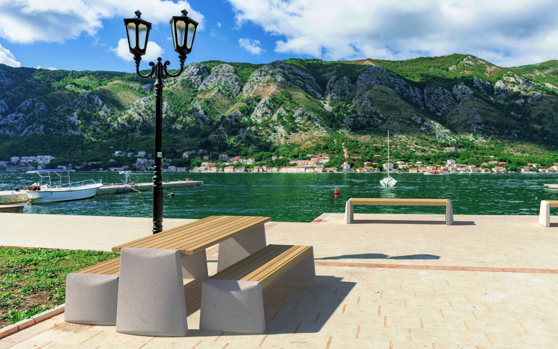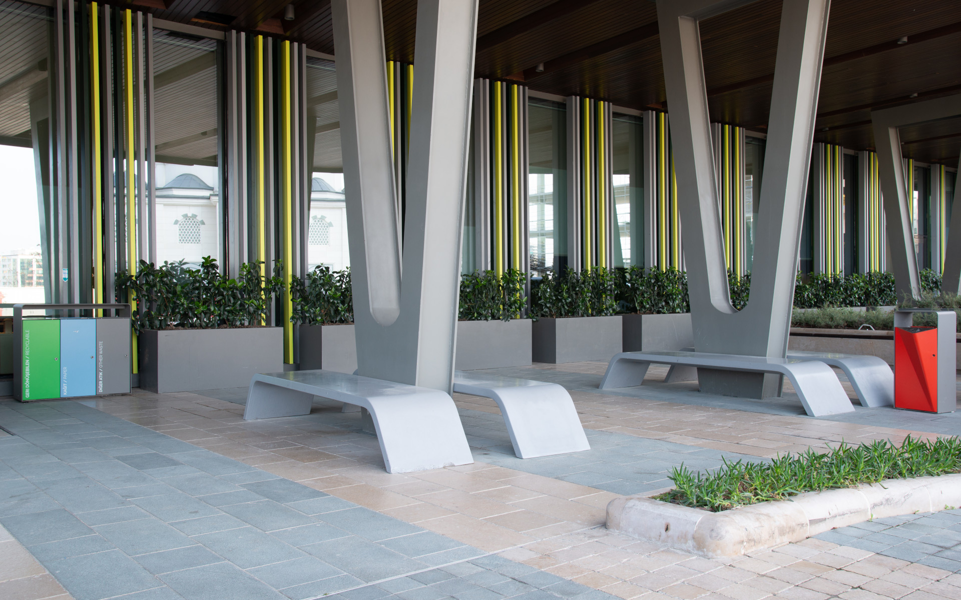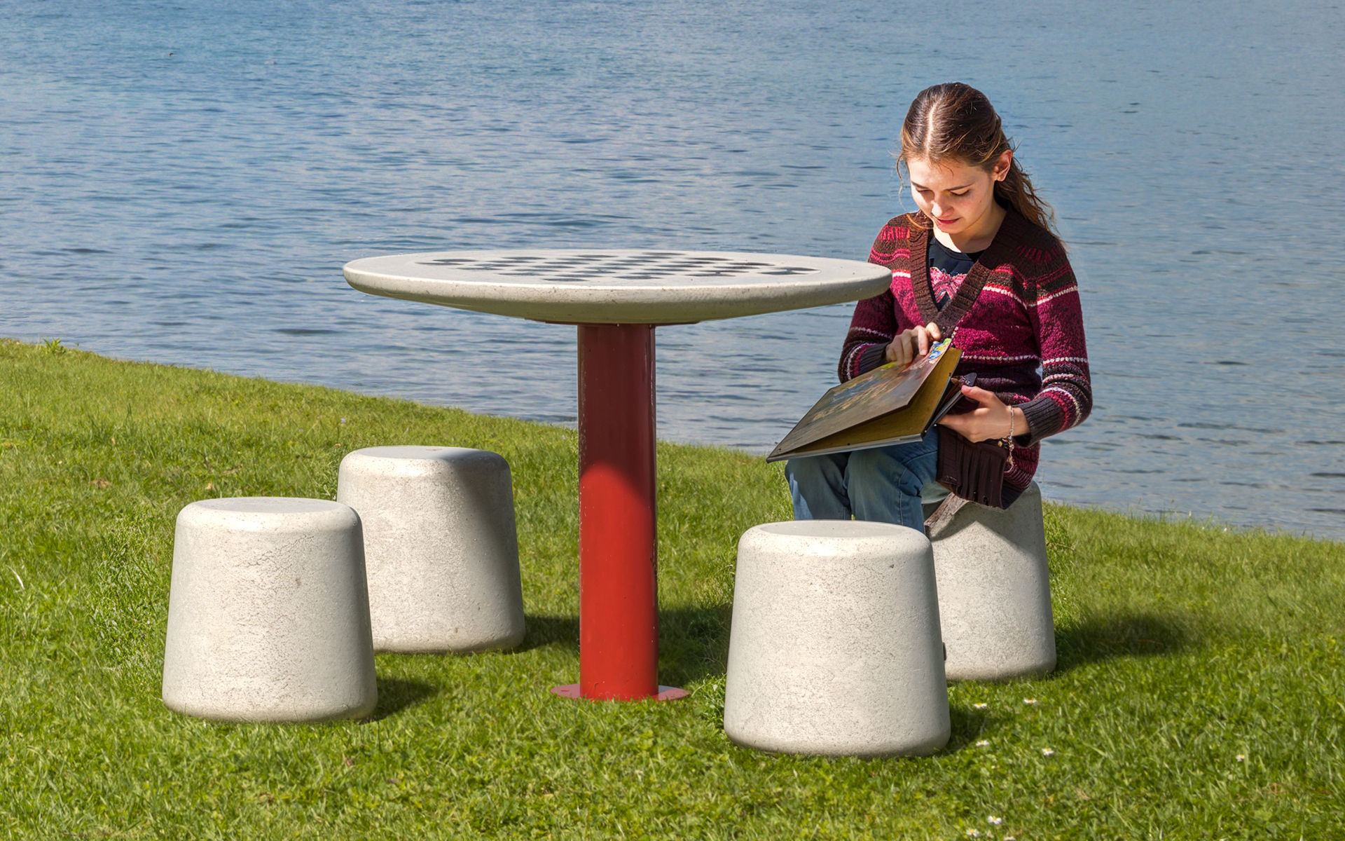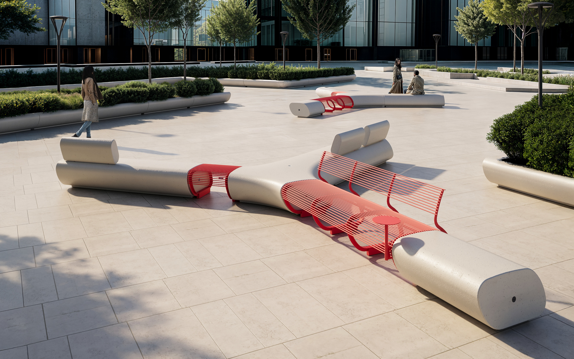 Collezione di elementi modulari in cemento HPC (High Performance Concrete) con seduta e tavolo integrati, disponibili in due versioni. La prima versione è costituita da due strutture a sbalzo, incrociate per creare un sistema di due sedute con tavolo frontale. La seconda versione è costituita da due strutture a sbalzo speculari, per creare un tavolo lungo, con seduta alle estremità. Possono essere installate singolarmente o in composizioni e sono compatibili con la seduta monoposto della collezione Mizar S.