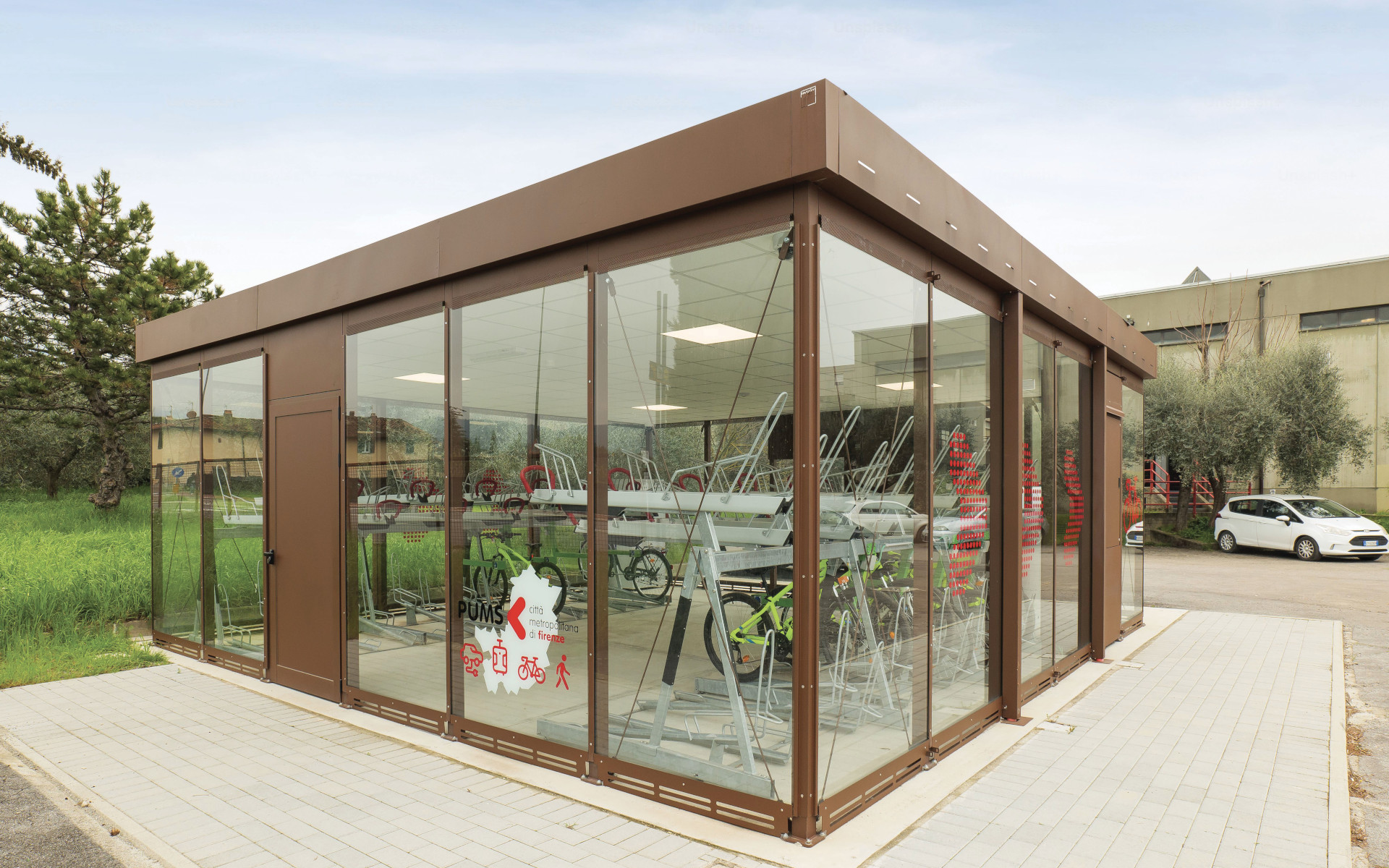 Collezione di coperture per il deposito di biciclette, progettata per offrire protezione e ordine in contesti pubblici e aziendali. La struttura è composta da montanti in tubolare d’acciaio a interasse costante e da pareti laterali in vetro che garantiscono trasparenza e leggerezza visiva.