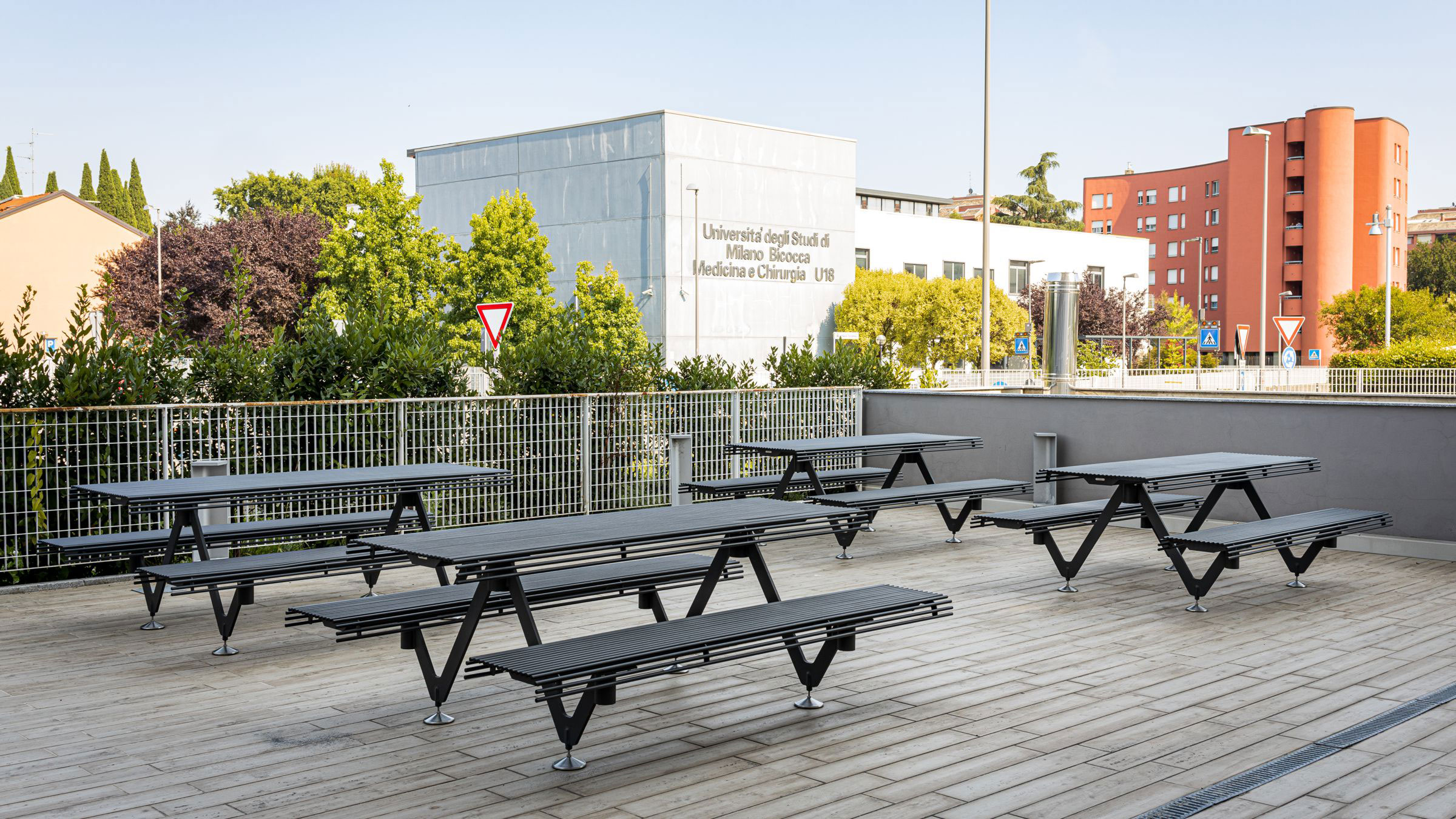 Un tavolo con panchina integrata modulare a Milano-Bicocca
