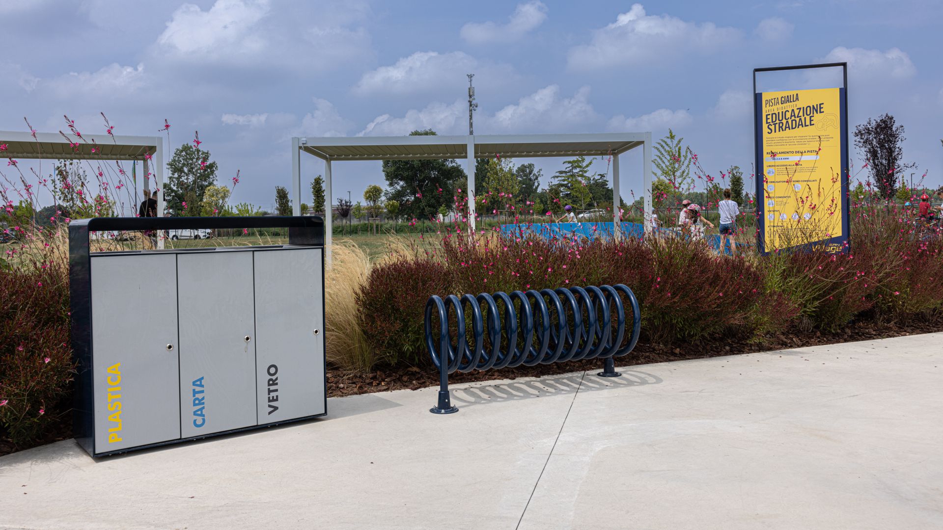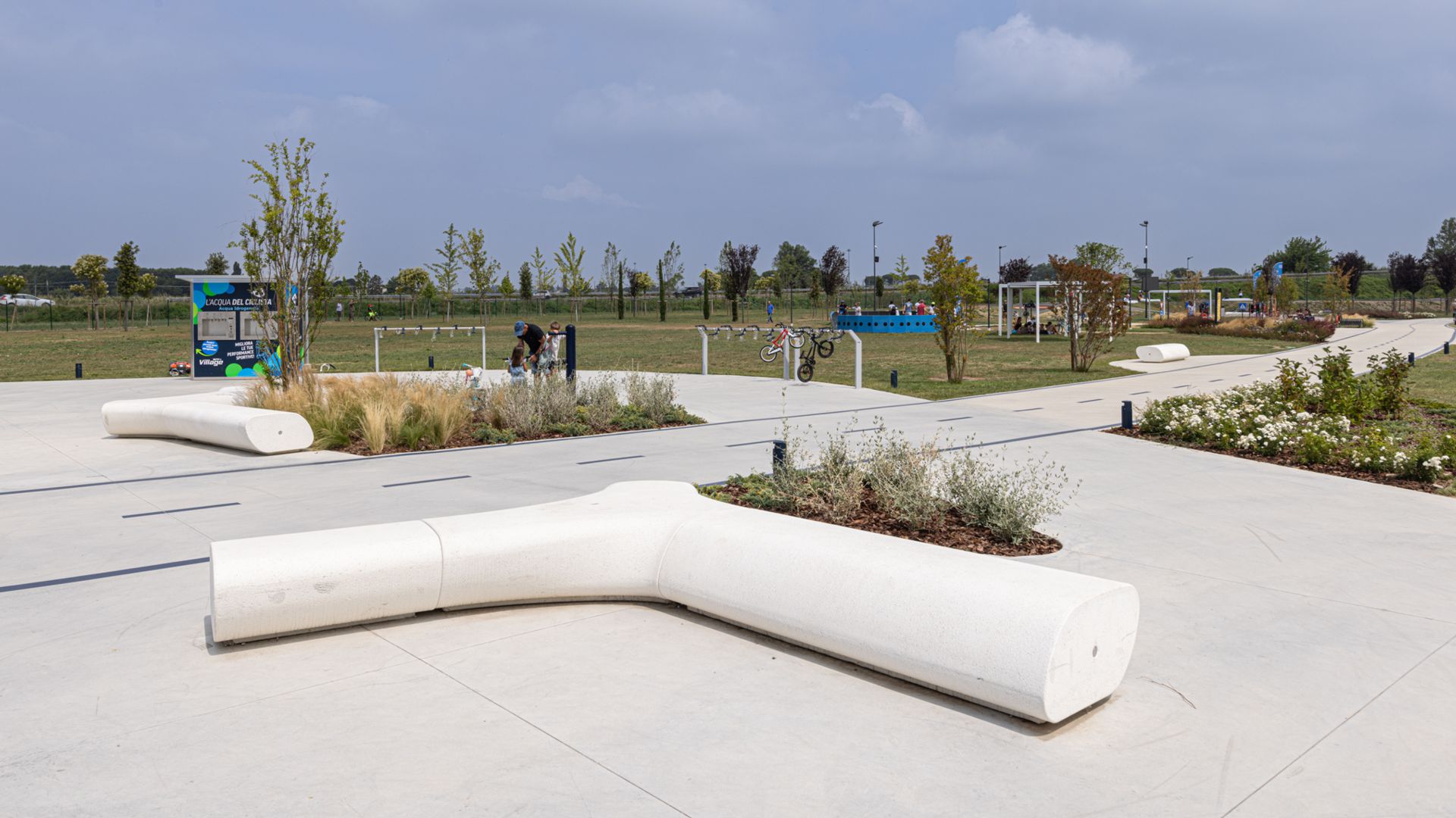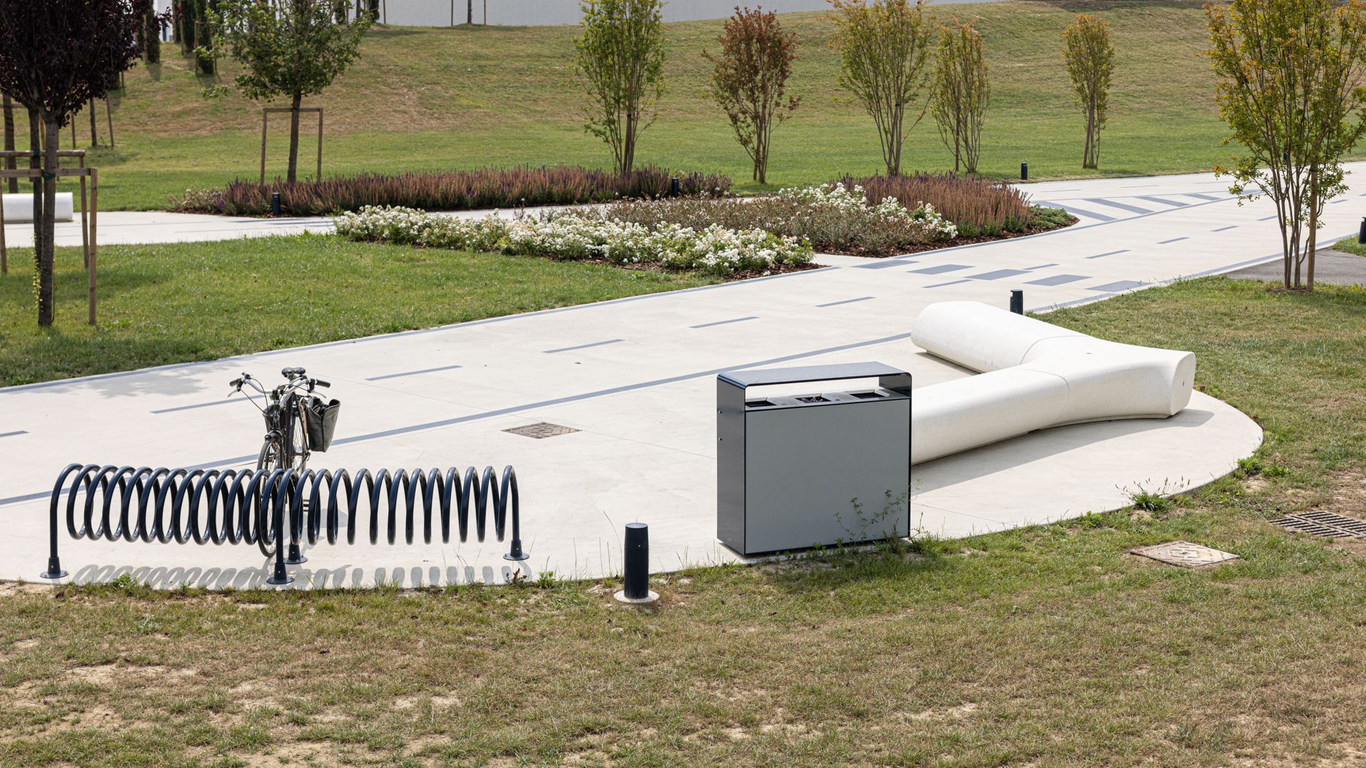 Il parco è dotato di arredo urbano realizzato da Metalco. I visitatori possono lasciare le loro biciclette negli spazi dedicati, equipaggiati con i portabici Biella e Reset, e poi rilassarsi sulle sedute monolitiche della collezione Tree Line, che, con le sue linee organiche, diventa una cornice perfetta per gli spazi verdi.