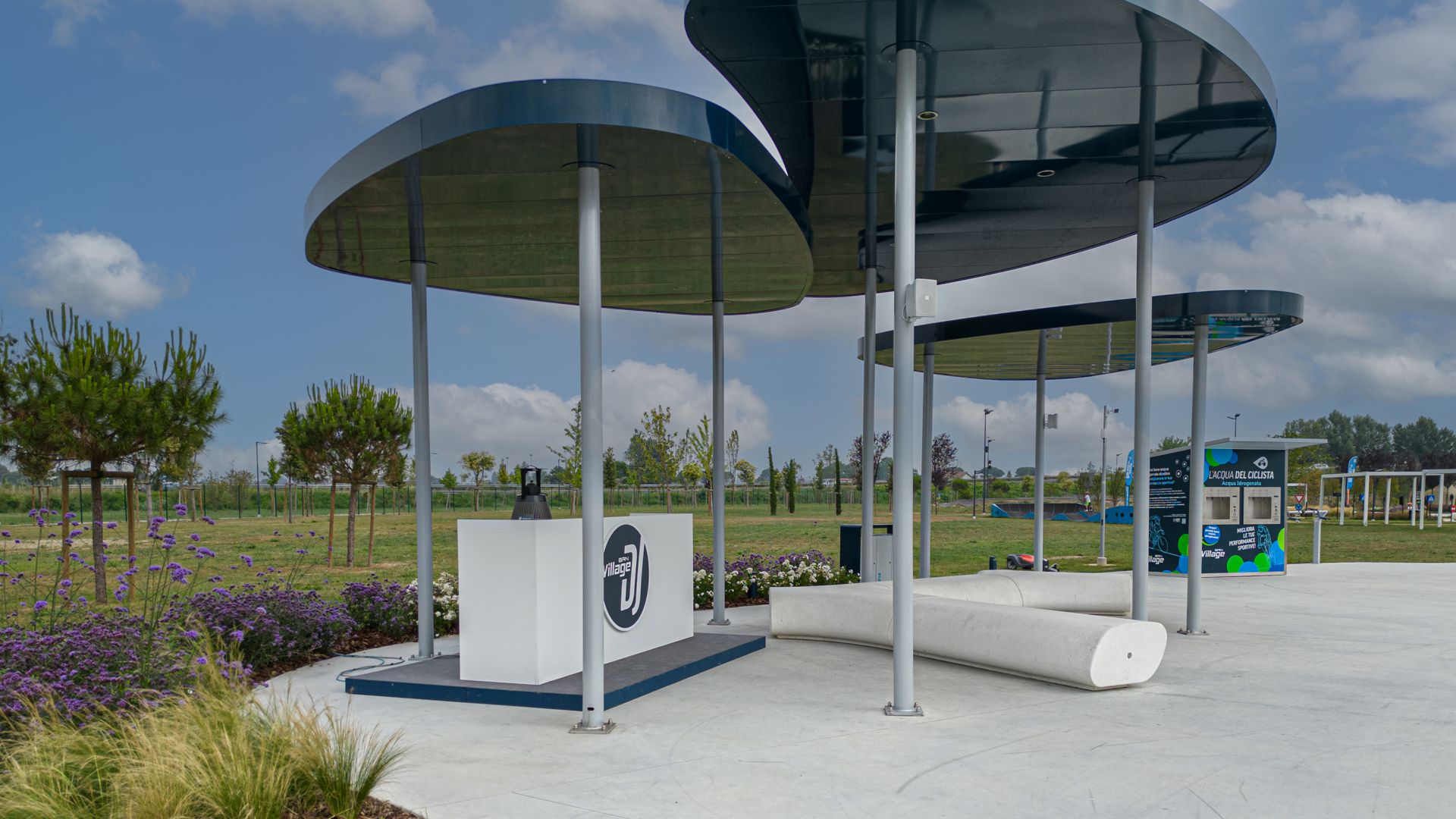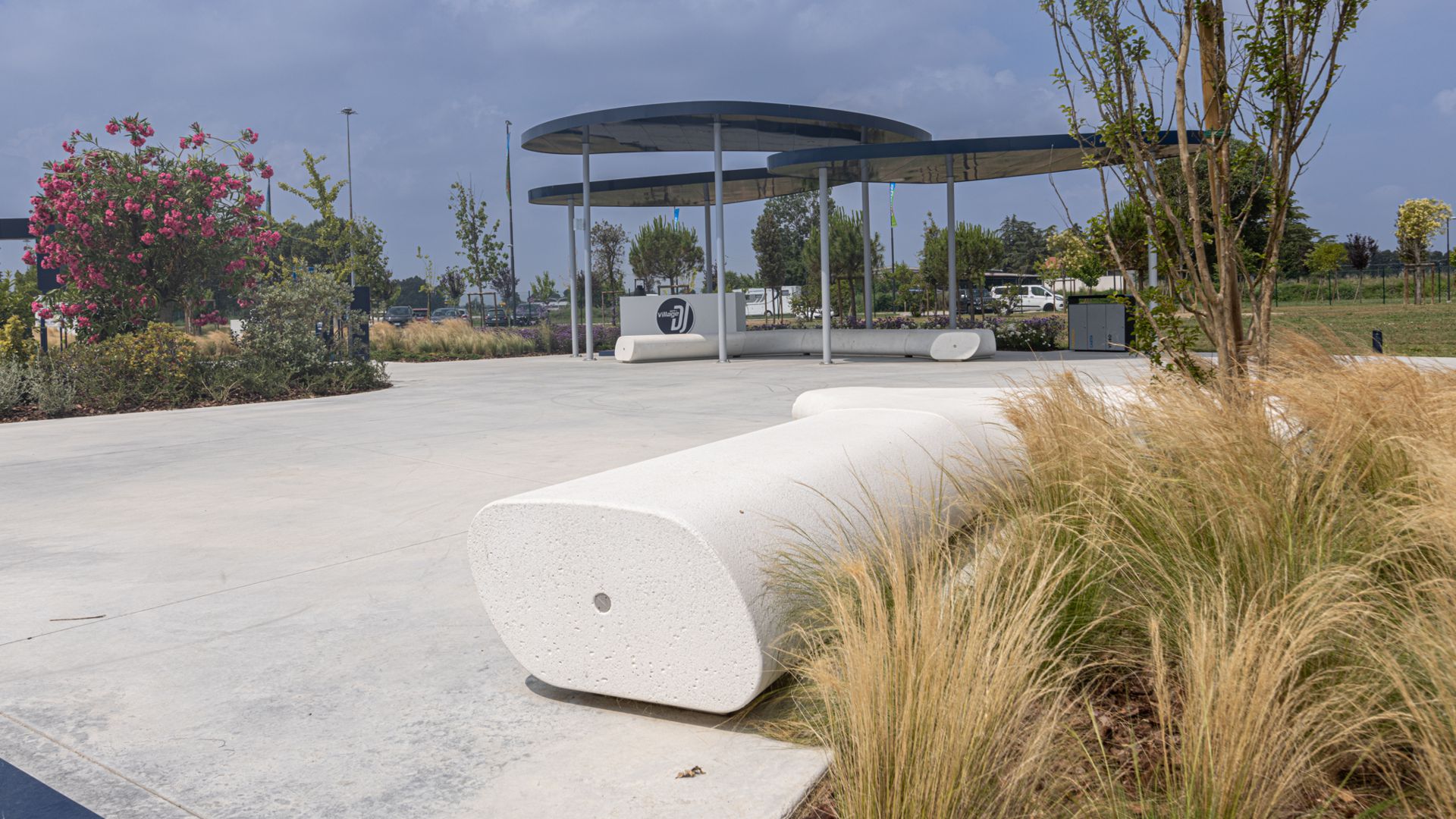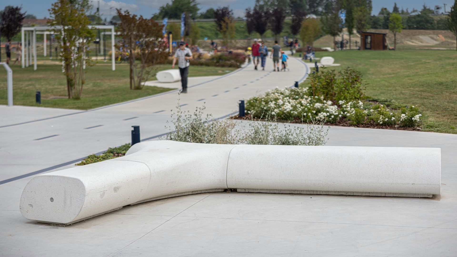 Il parco è dotato di arredo urbano realizzato da Metalco. I visitatori possono lasciare le loro biciclette negli spazi dedicati, equipaggiati con i portabici Biella e Reset, e poi rilassarsi sulle sedute monolitiche della collezione Tree Line, che, con le sue linee organiche, diventa una cornice perfetta per gli spazi verdi.
