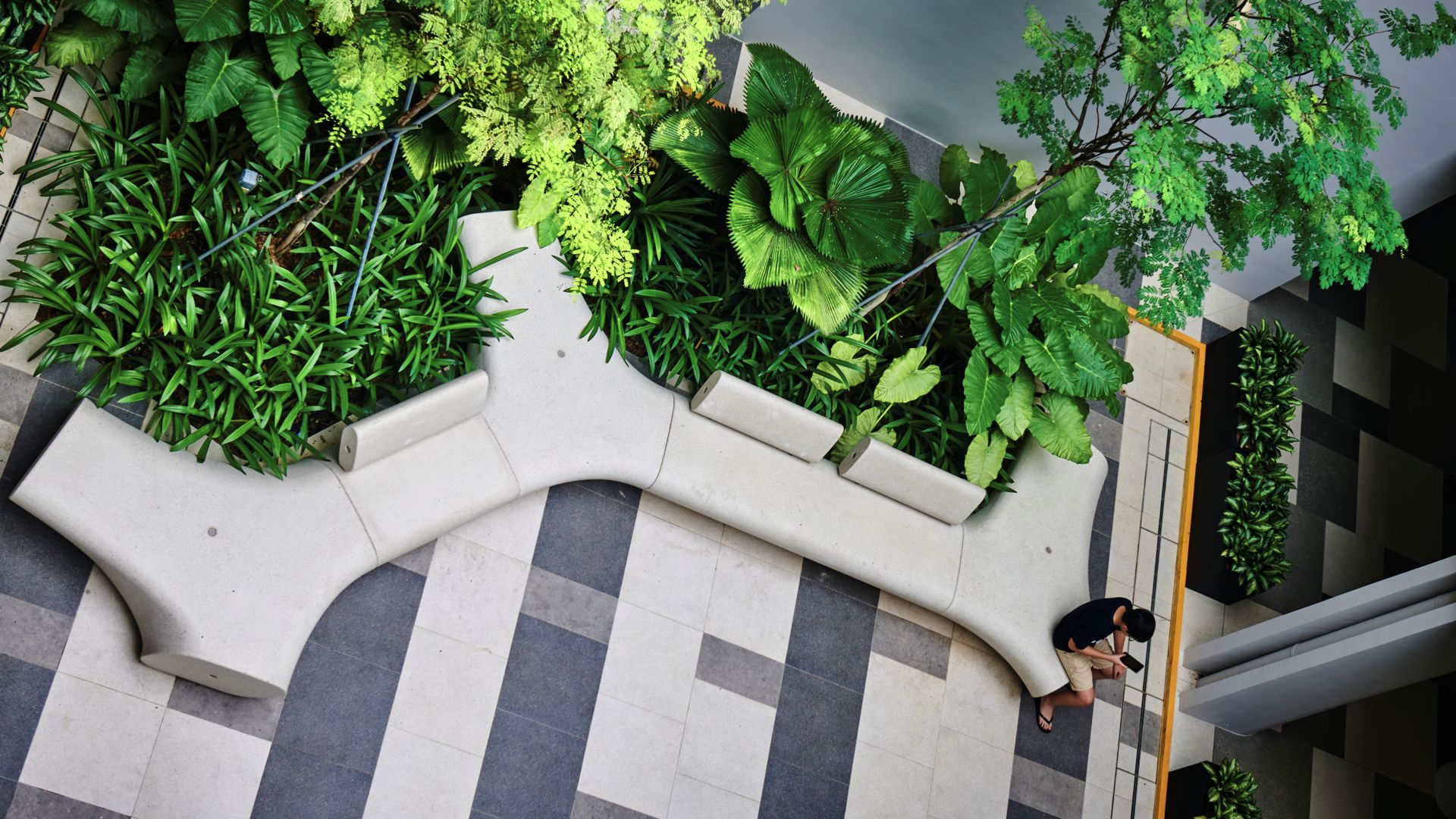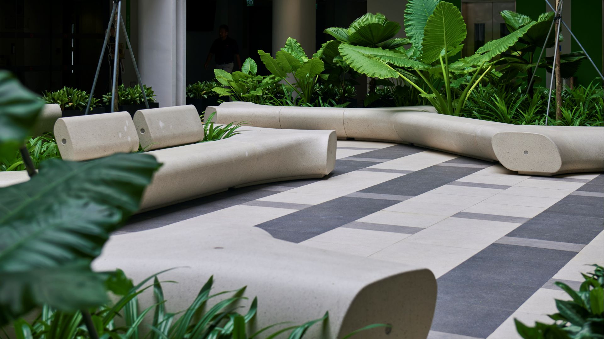 Un elemento chiave della composizione paesaggistica è l’interazione tra un suolo rigorosamente disegnato e elementi più morbidi e organici. La pavimentazione di grande formato, in toni contrastanti, definisce una struttura pulita e grafica che conferisce chiarezza e ordine allo spazio pubblico. Questa superficie strutturata viene ammorbidita da piantumazioni integrate e sedute scultoree, generando una relazione dinamica tra geometria e vegetazione.