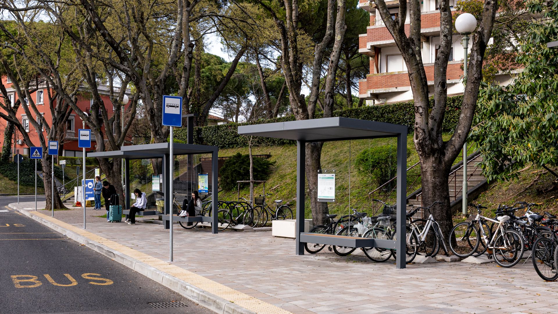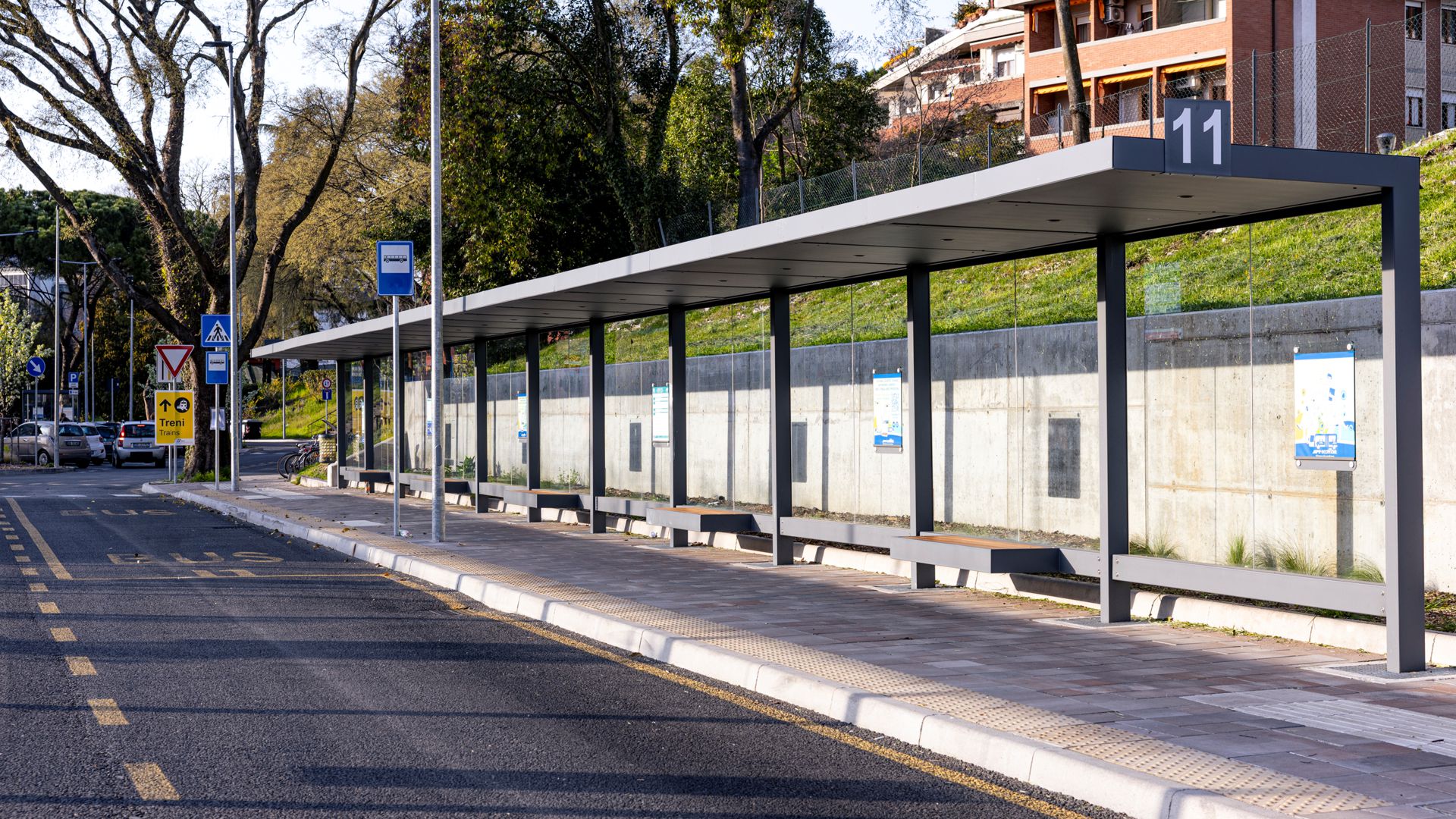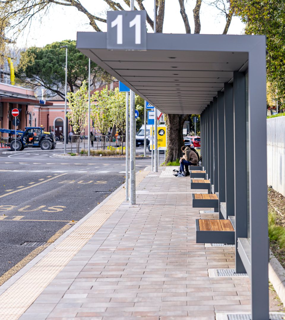Le pensiline modello HUT di Metalco rappresentano un elemento centrale del progetto: strutture progettate per garantire protezione dagli agenti atmosferici e migliorare la qualità dell’attesa, contribuendo allo stesso tempo a definire un linguaggio architettonico contemporaneo e coerente con l’intero intervento. Il design essenziale e la modularità del sistema permettono un’integrazione armoniosa con lo spazio, valorizzando l’identità del nuovo terminal. Fermata attrezzata per disabili motori, a conferma dell’attenzione progettuale verso accessibilità e inclusività. Per venire incontro alle esigenze dei progettisti è stata inoltre realizzata una versione custom delle pensiline.