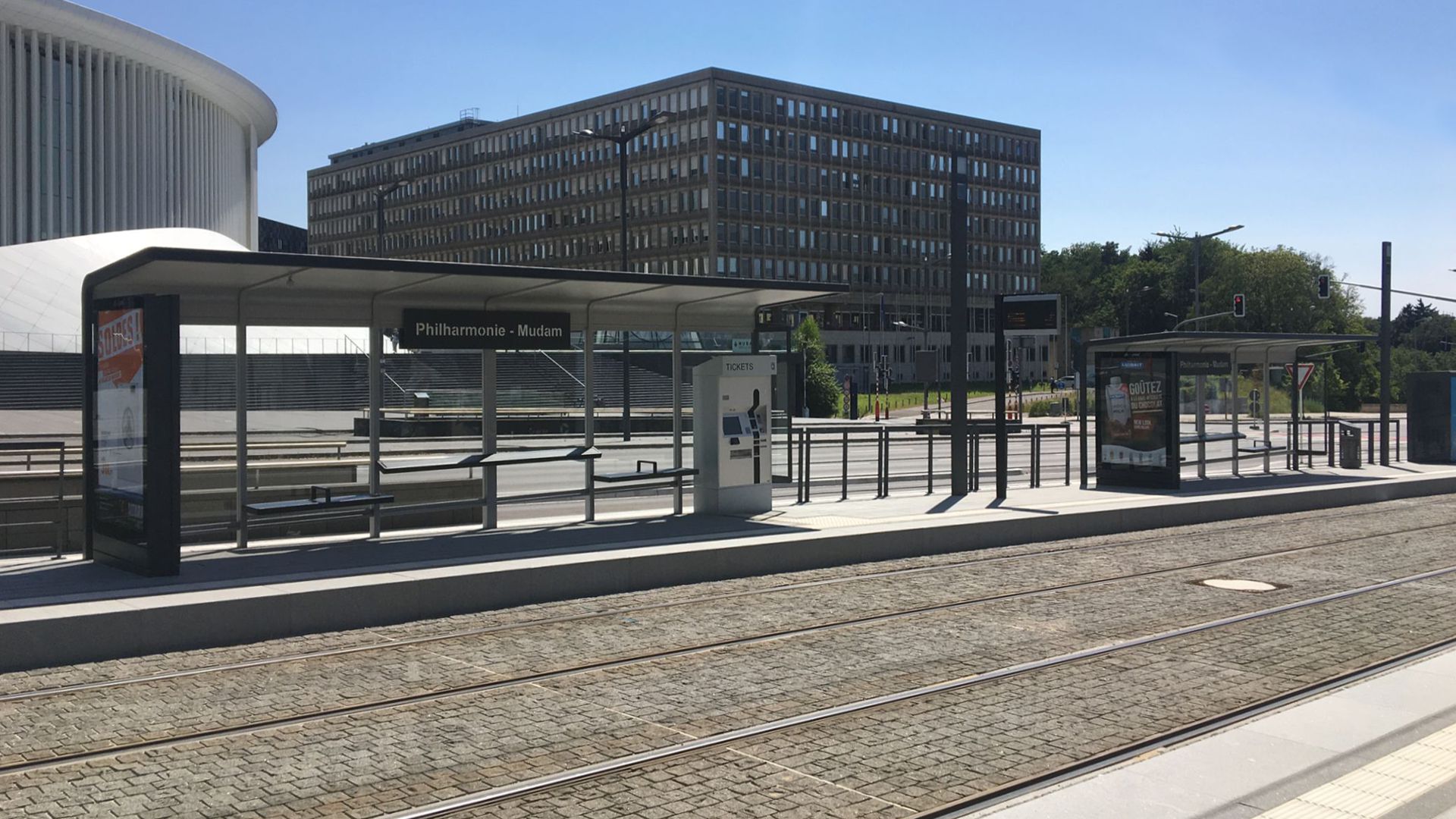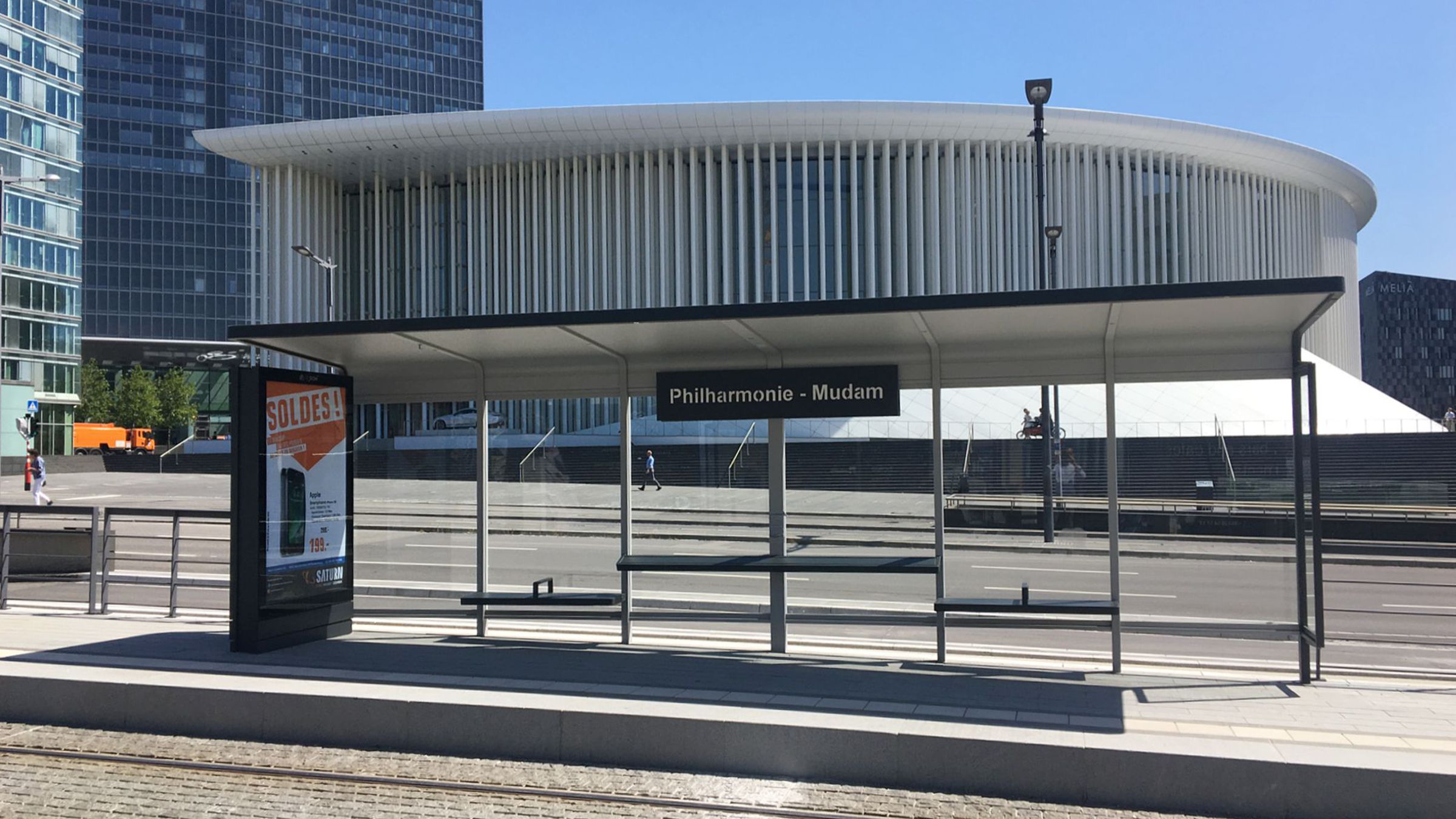 Ecco un’altra prestigiosa realizzazione di pensiline per la prima linea tranviaria del Lussemburgo da parte di Metalco. Eccone una installata di fronte alla Filarmonica.