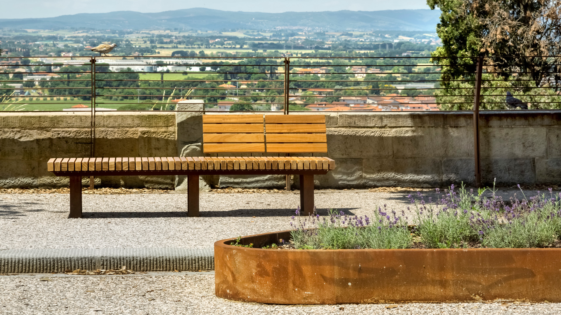 La passeggiata perimetrale mantiene le sue attuali caratteristiche di “belvedere”, viene valorizzata ulteriormente dalla collocazione di nuove sedute della collezione COBRA e viene messa in sicurezza attraverso l’installazione di un parapetto perimetrale lungo il muro esistente.