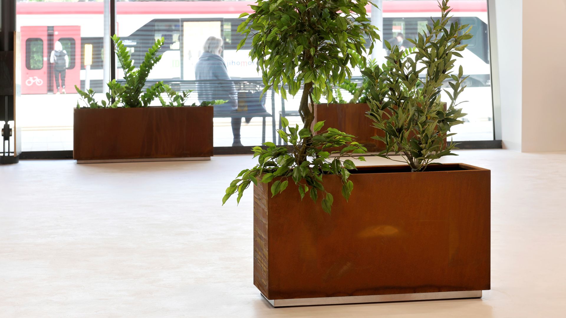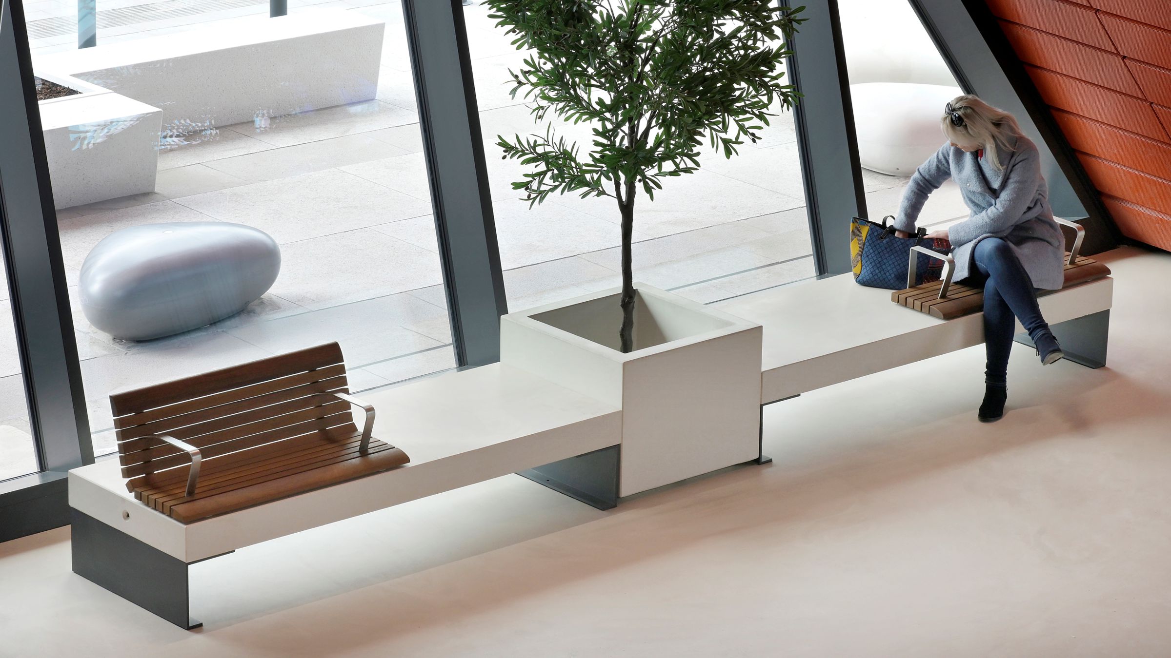 Anche l’arredo urbano è stato studiato con attenzione: è stato pensato per integrarsi con le forme marcate dell’edificio e creare un contrasto interessante con gli elementi naturali del contesto. Per gli spazi esterni sono stati scelti stili diversi rispetto all’atrio principale e al piano superiore, con l’obiettivo di mantenere un forte legame visivo e funzionale con l’ambiente ferroviario. Alcuni elementi specifici: