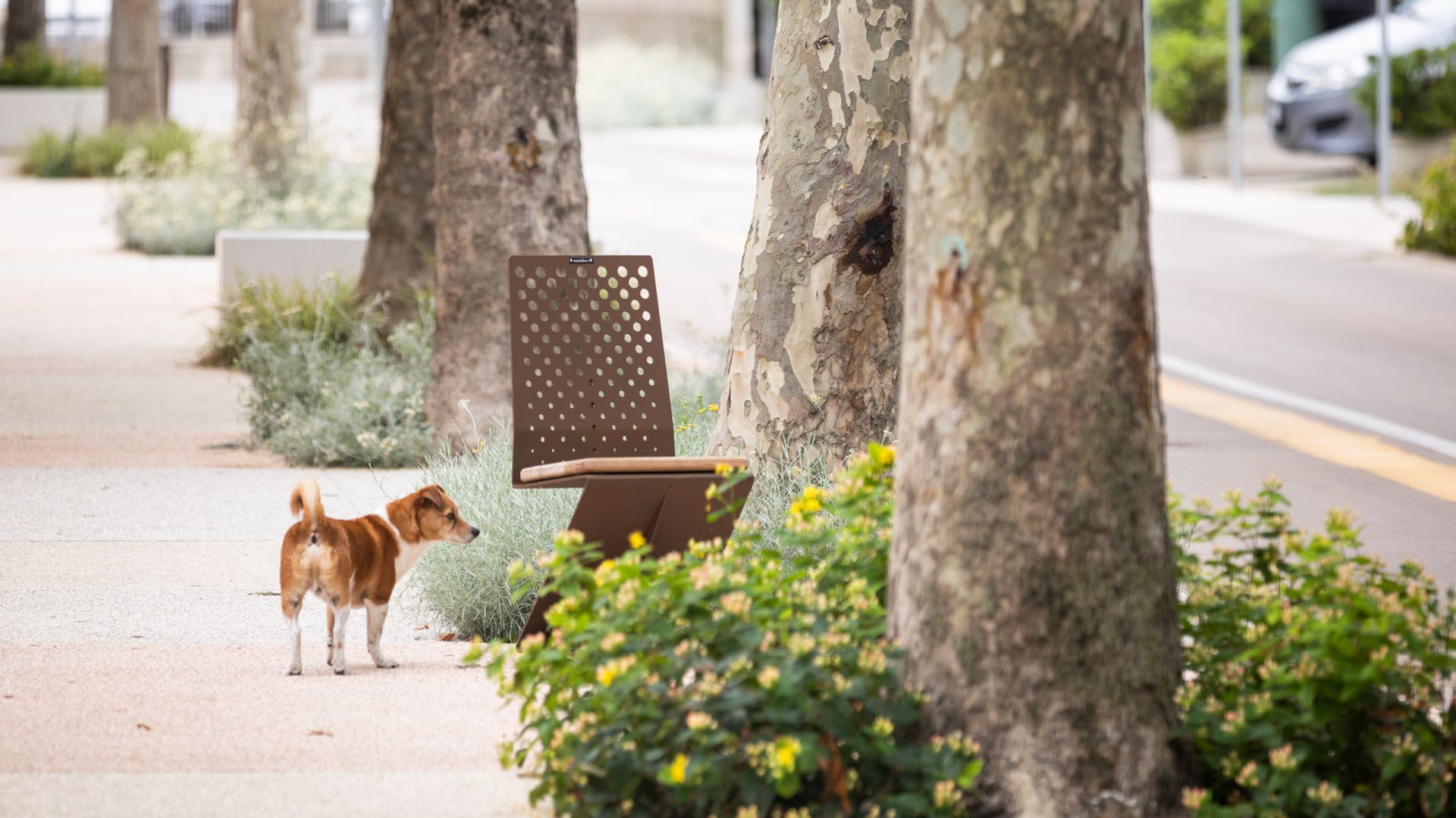 Tutti gli elementi di arredo urbano presentano una palette di colori corten, che si armonizza con la pavimentazione dai toni chiari per evocare un’atmosfera mediterranea piacevole.
