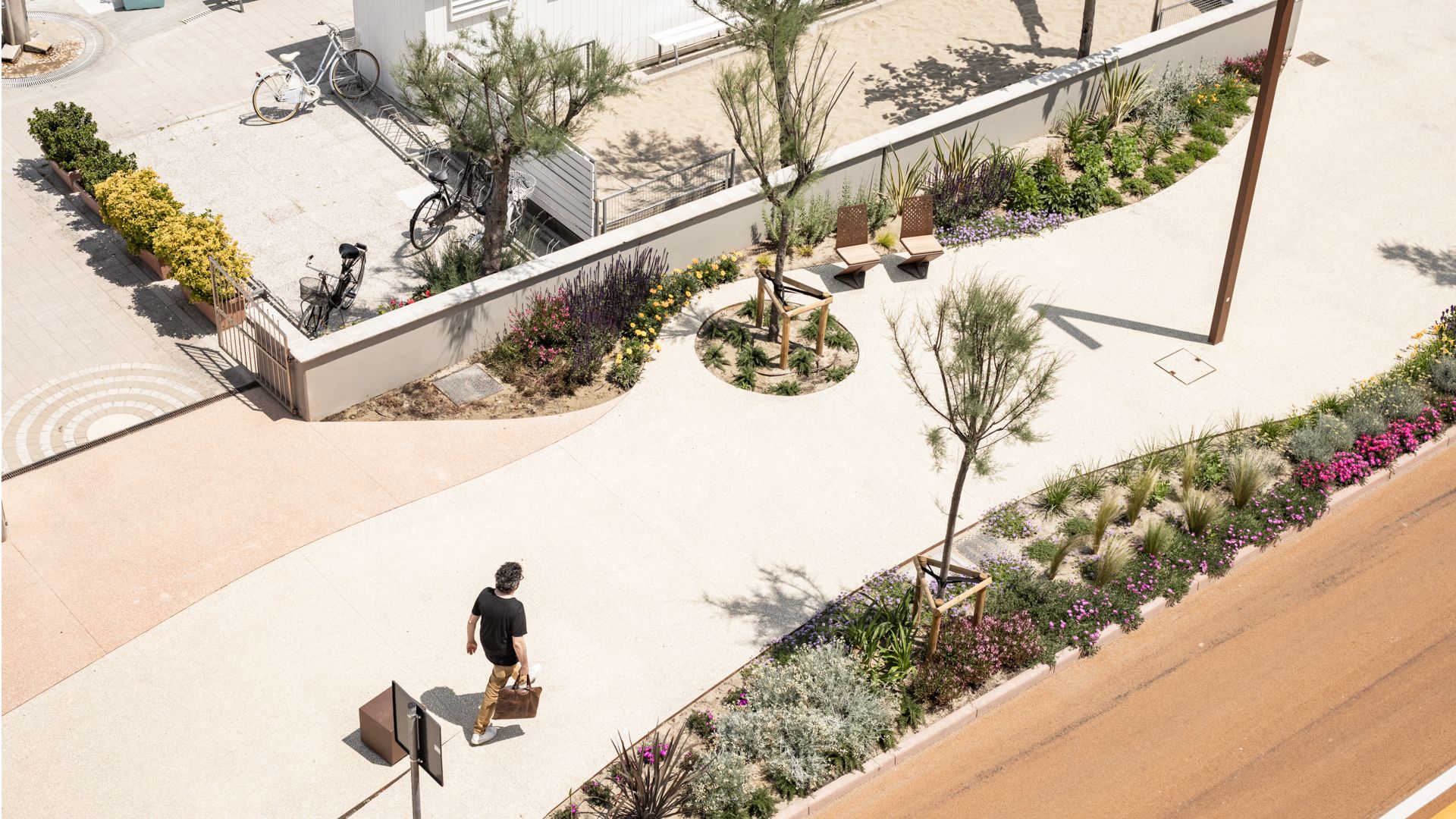 Rigogliosi spazi verdi fiancheggiano il percorso pedonale, donandogli forme, colori e fragranze organiche, simili a un sentiero naturale.