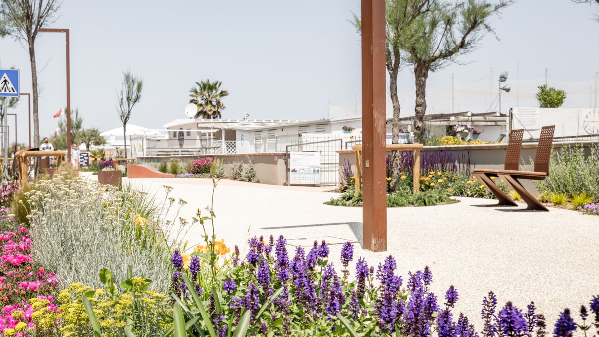 Tutti gli elementi di arredo urbano presentano una palette di colori corten, che si armonizza con la pavimentazione dai toni chiari per evocare un’atmosfera mediterranea piacevole.
